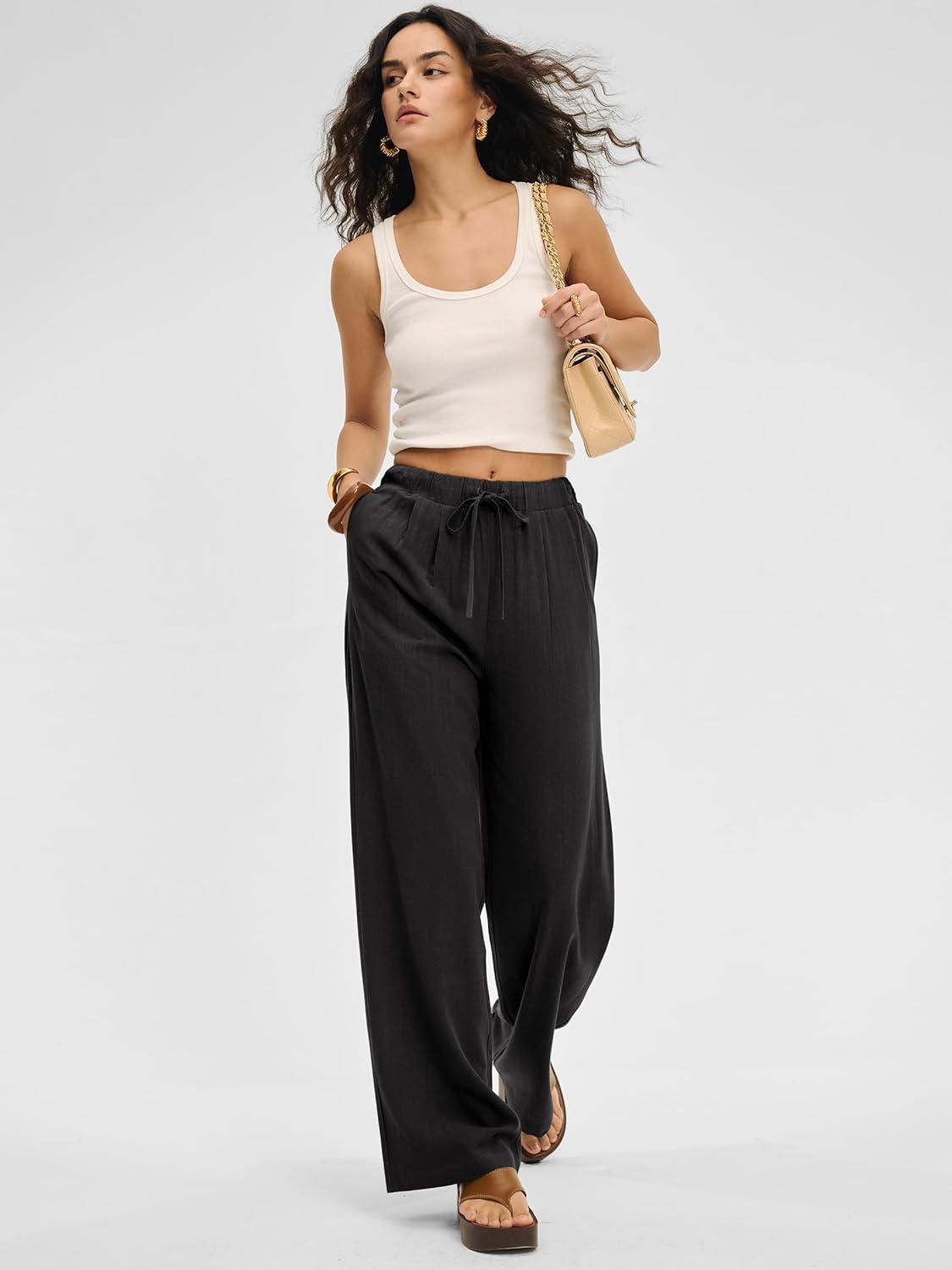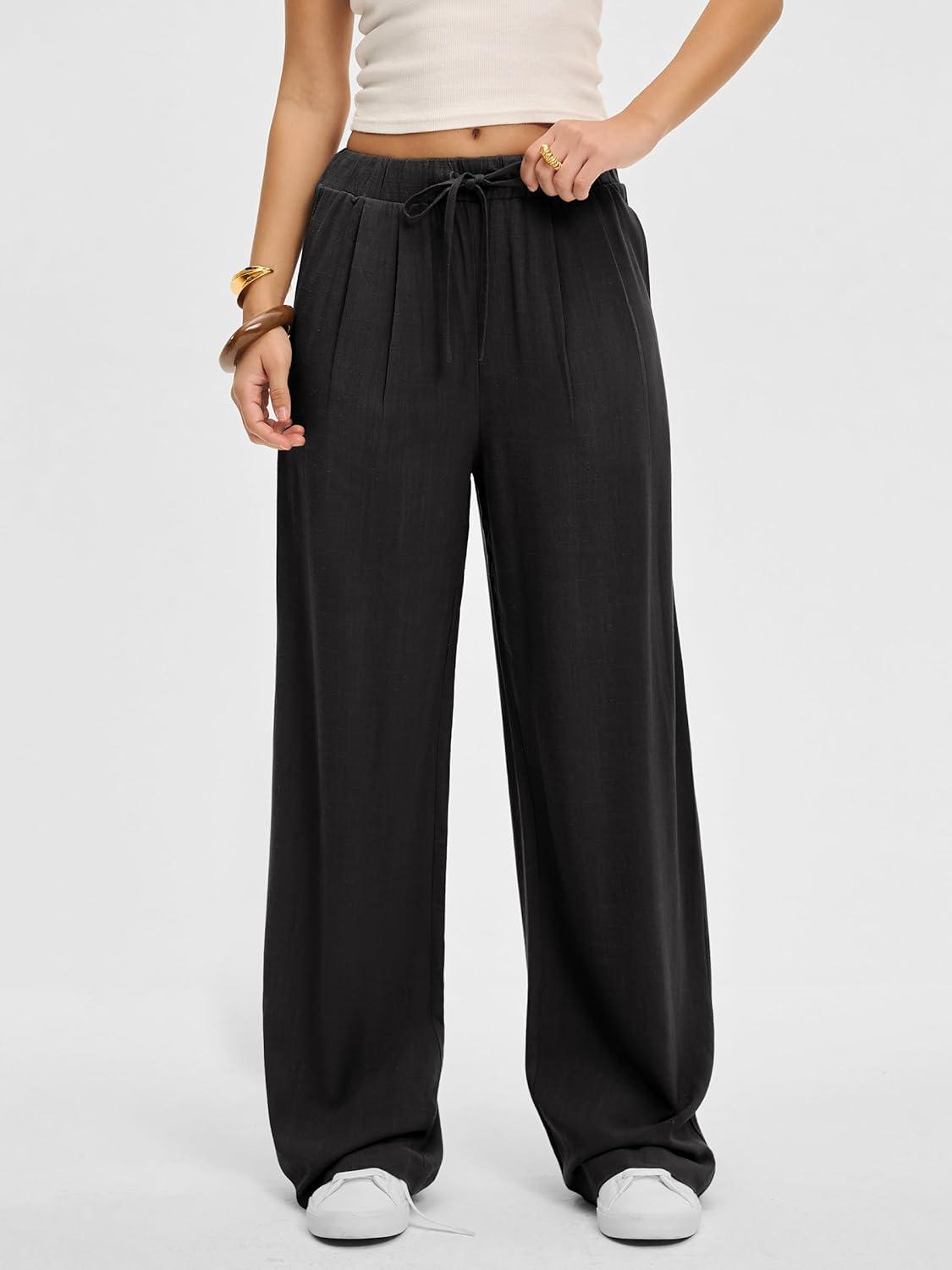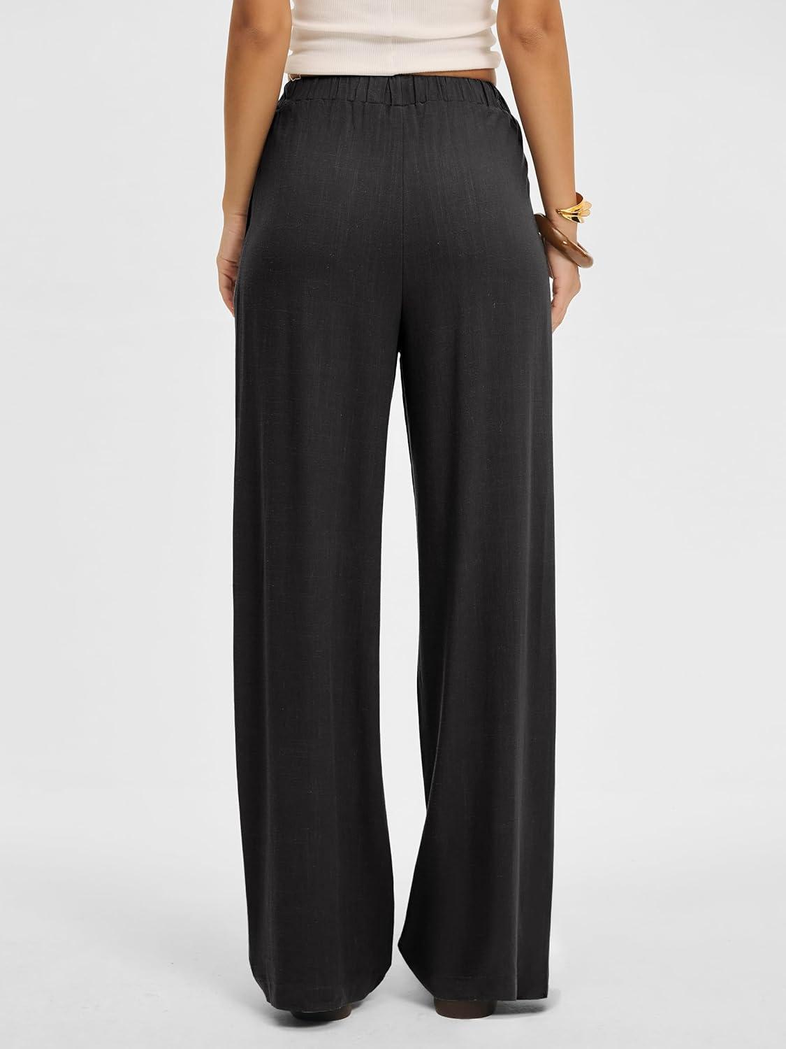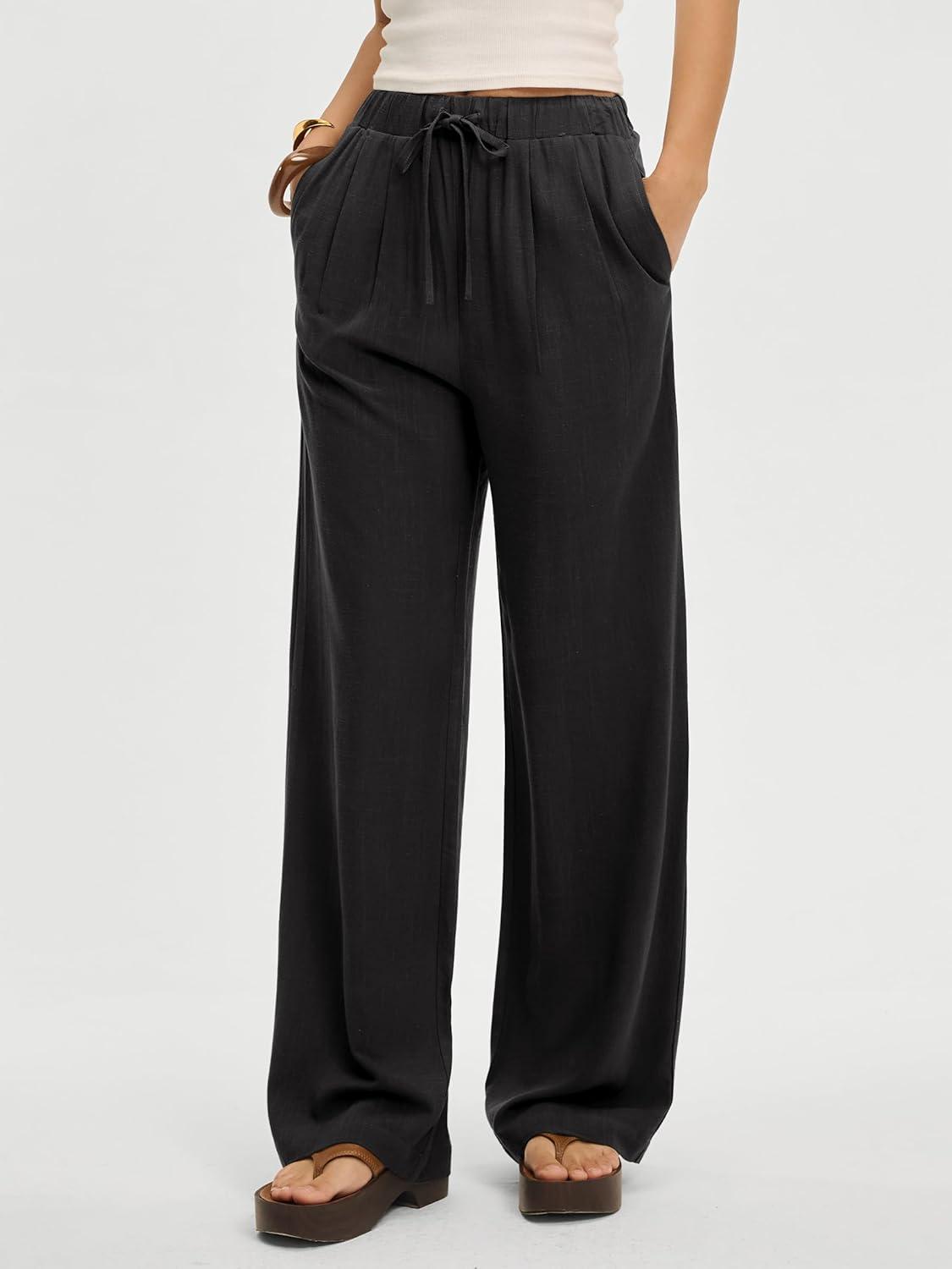 imageANRABESS Women Wide Leg Linen Palazzo Pants Casual Elastic Waist Drawstring Flowy Loose Beach Travel Trousers with PocketsBlack