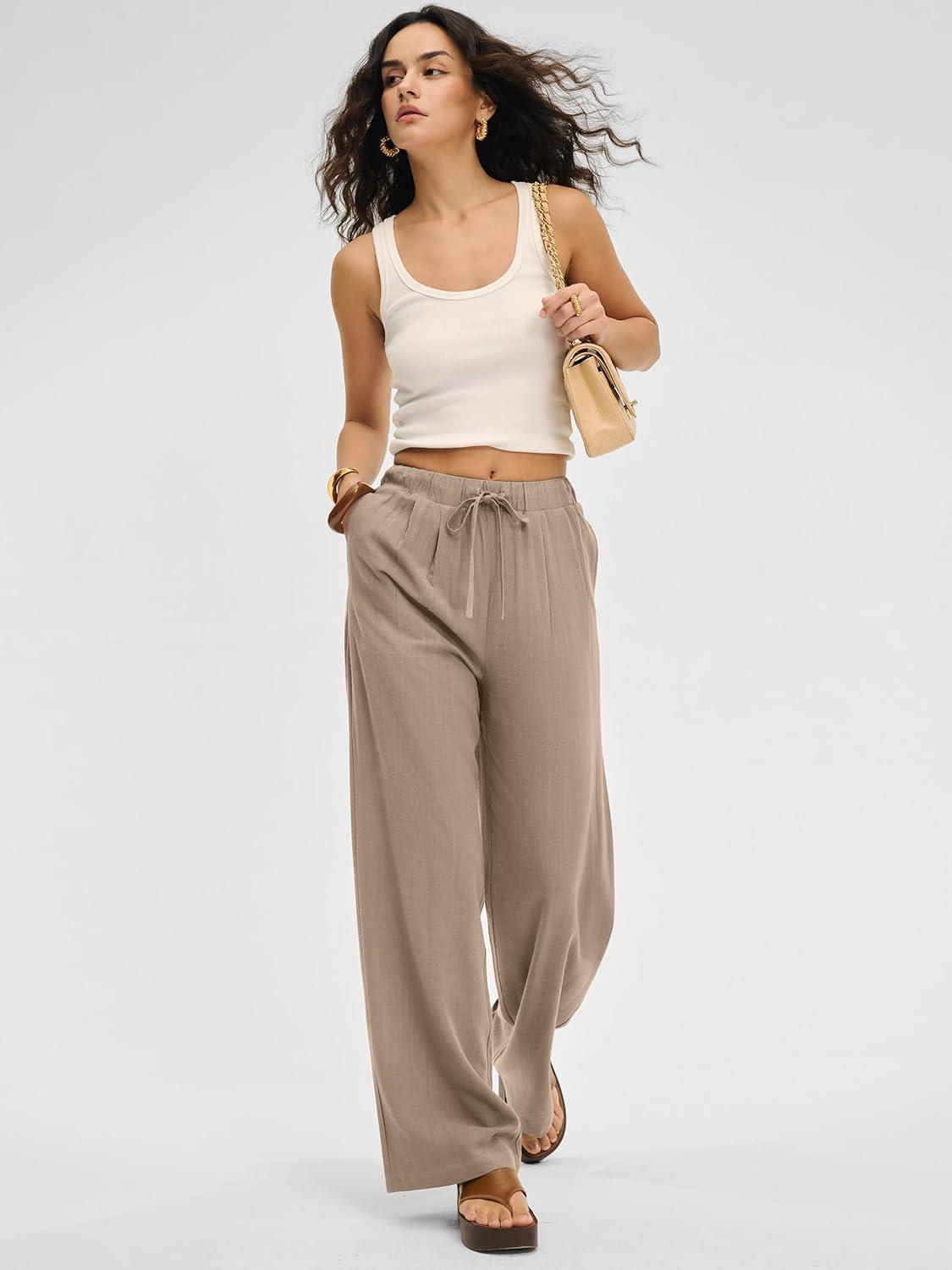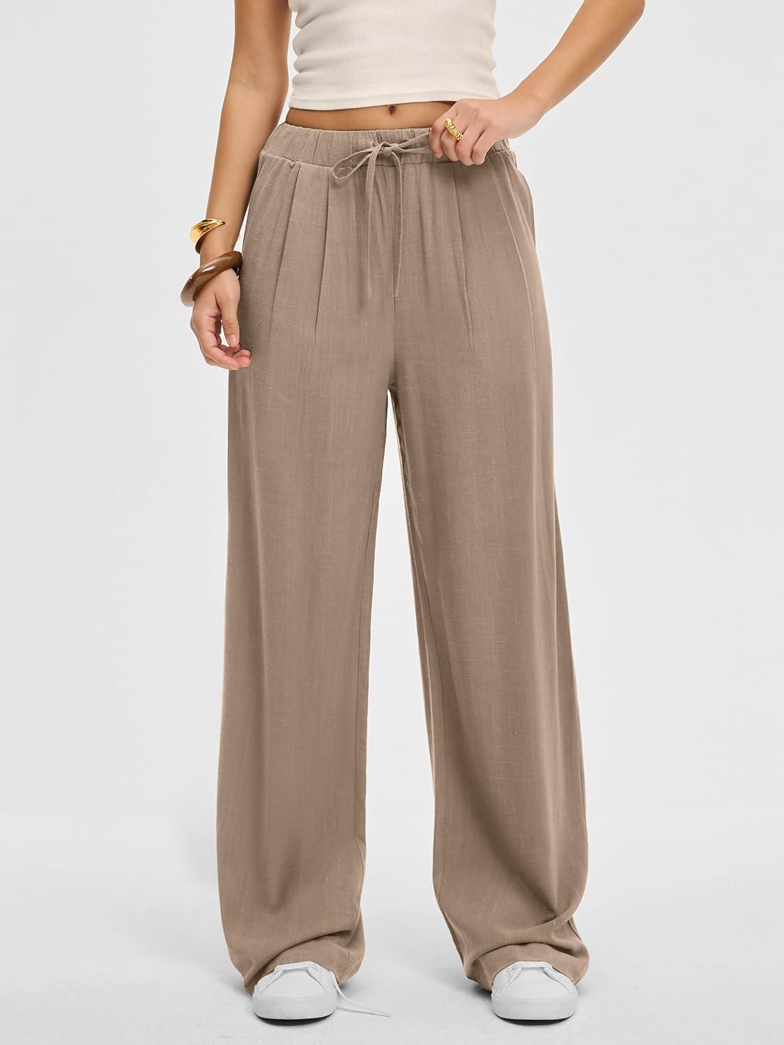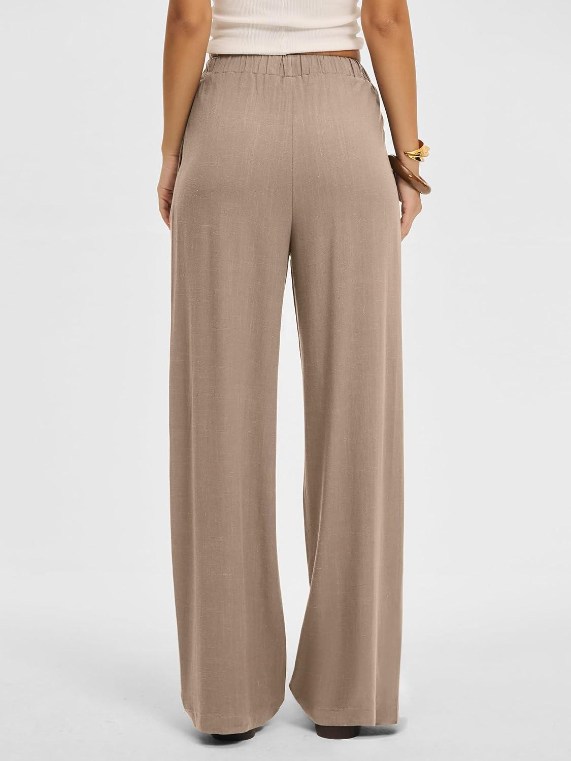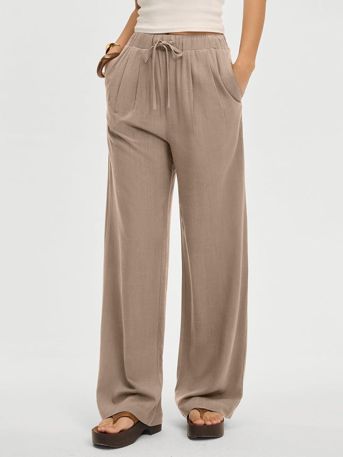 ANRABESS Women Wide Leg Linen Palazzo Pants Casual Elastic Waist Drawstring Flowy Loose Beach Travel Trousers with Pockets(Khaki)