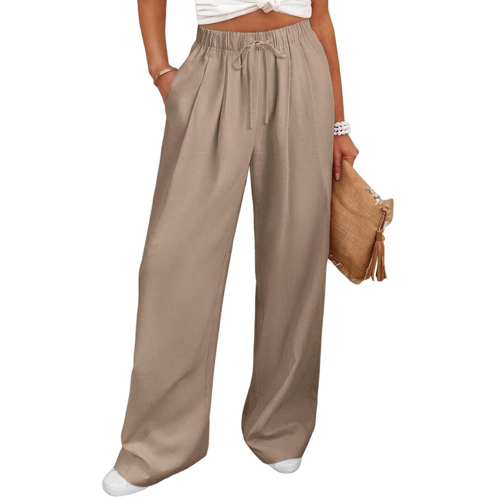 imageANRABESS Women Wide Leg Linen Palazzo Pants Casual Elastic Waist Drawstring Flowy Loose Beach Travel Trousers with PocketsKhaki