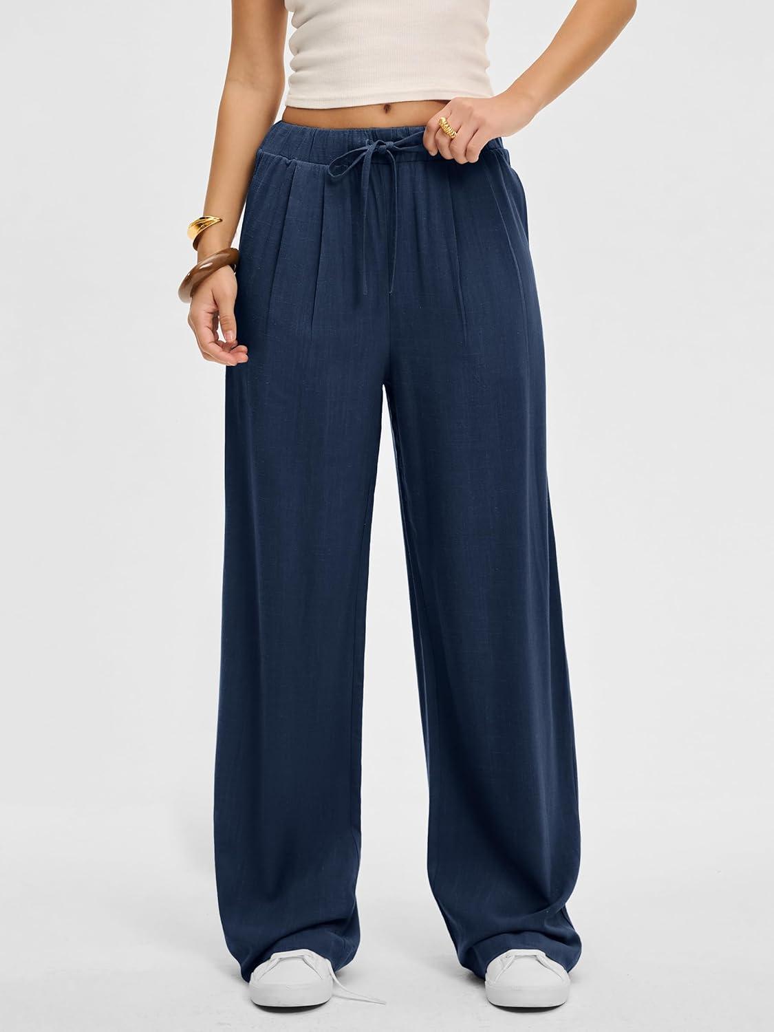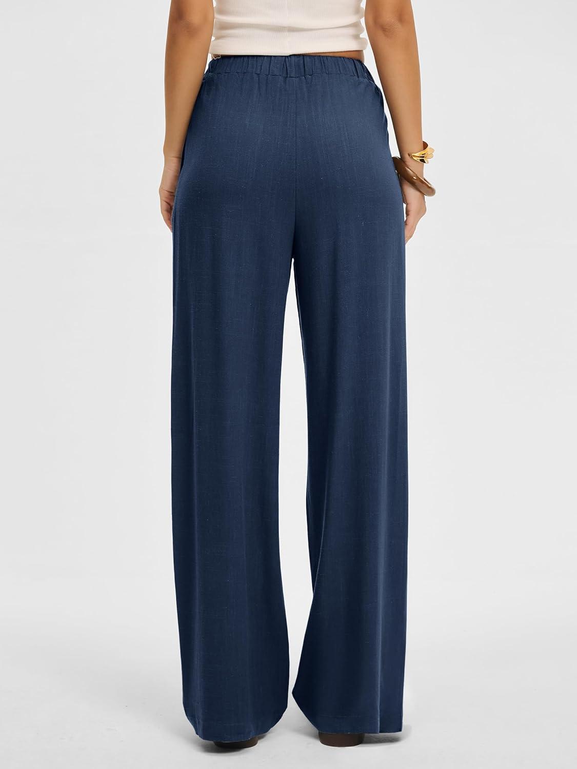 imageANRABESS Women Wide Leg Linen Palazzo Pants Casual Elastic Waist Drawstring Flowy Loose Beach Travel Trousers with PocketsNavy Blue