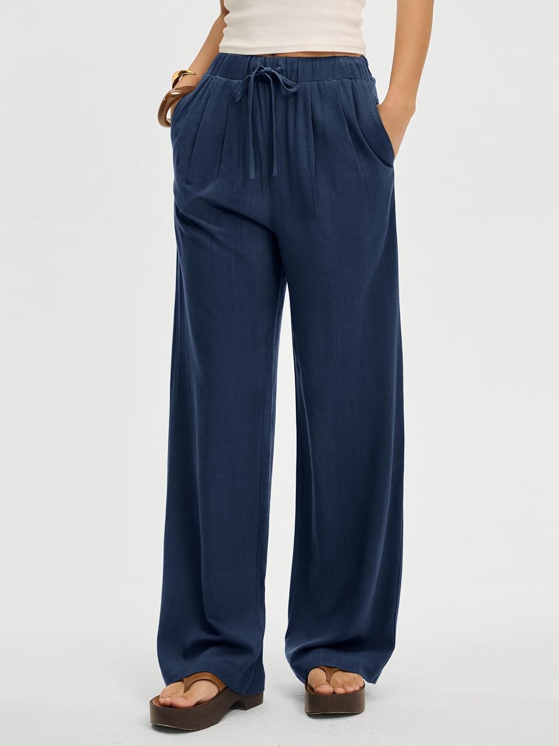 ANRABESS Women Wide Leg Linen Palazzo Pants Casual Elastic Waist Drawstring Flowy Loose Beach Travel Trousers with Pockets(Navy Blue)