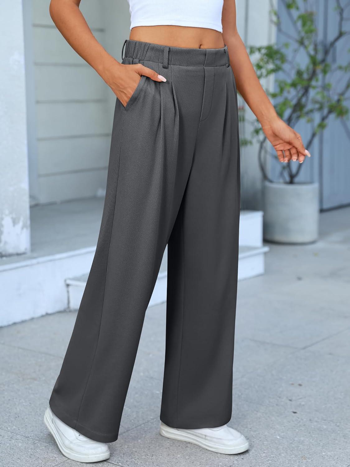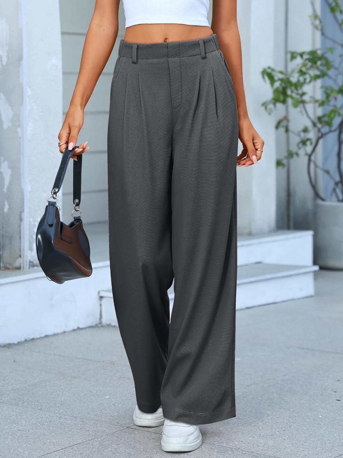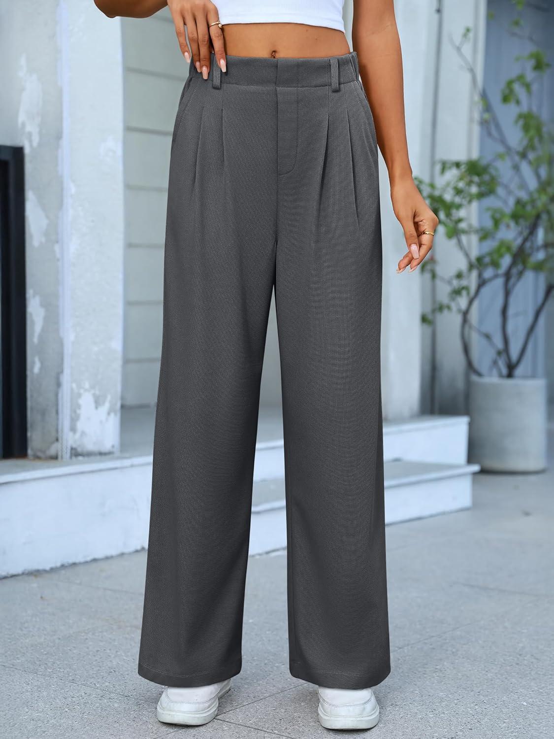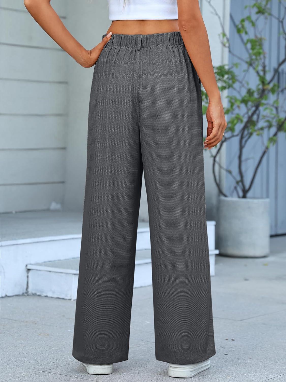 ANRABESS Women Wide Leg Pants Stretchy Work Dress Pants Waffle Knit Business Casual Pull on Palazzo Slacks Trousers Outfits(Dark Gray)