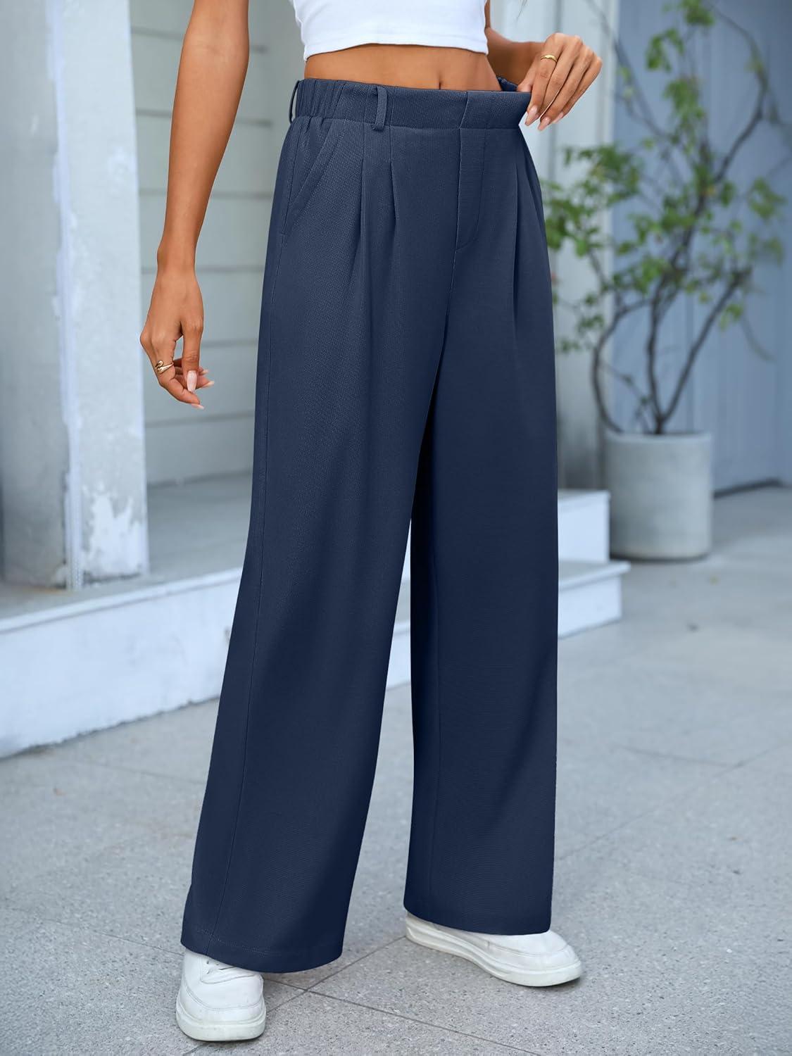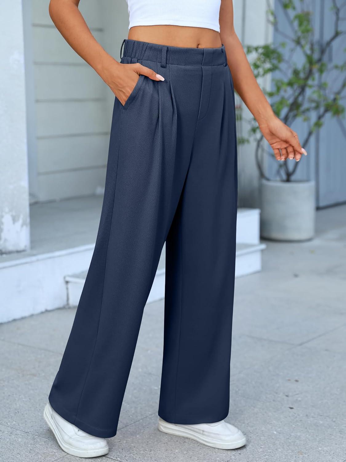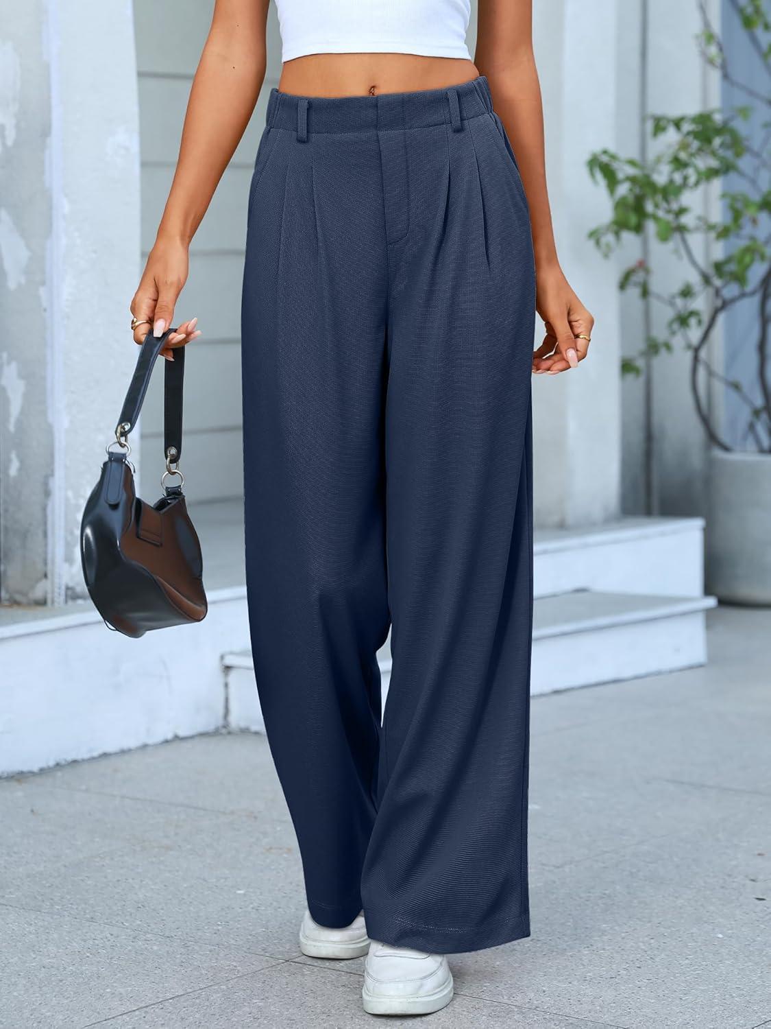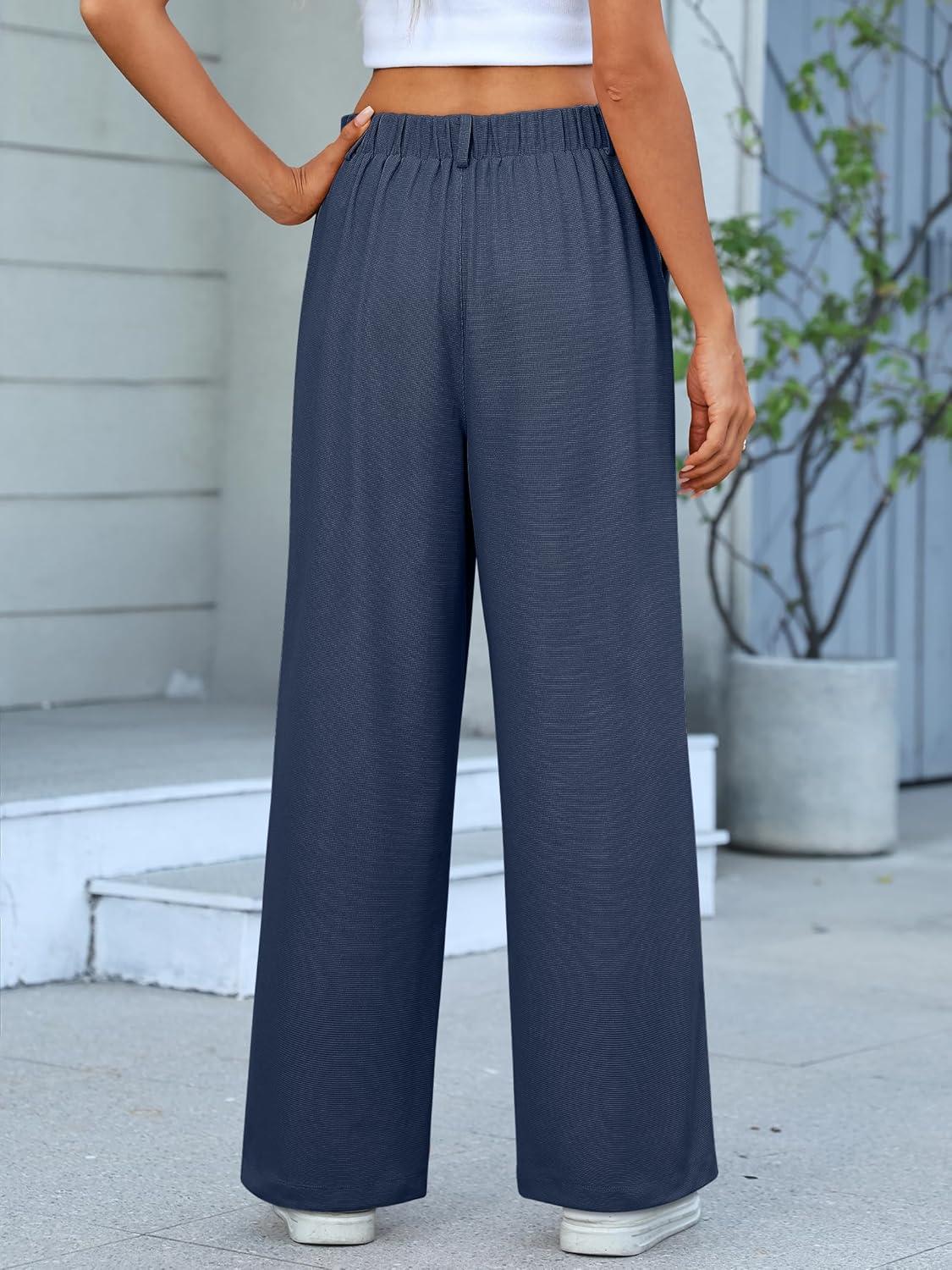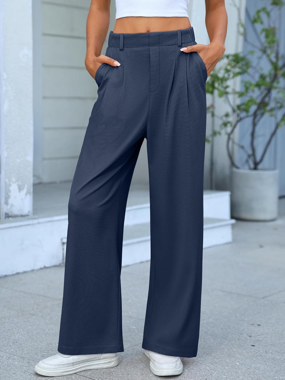 ANRABESS Women Wide Leg Pants Stretchy Work Dress Pants Waffle Knit Business Casual Pull on Palazzo Slacks Trousers Outfits(Navy Blue)