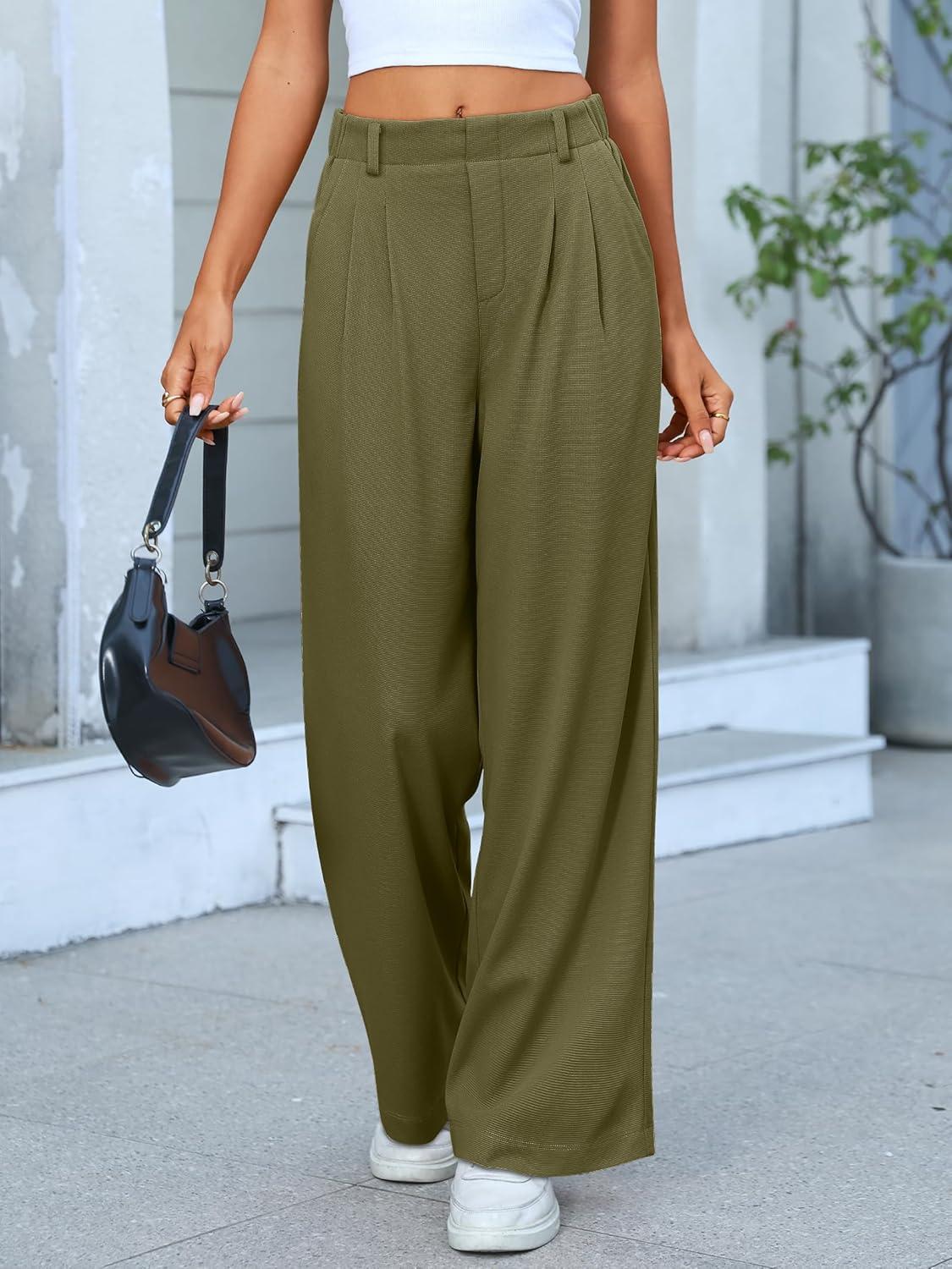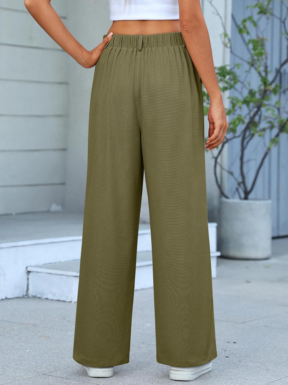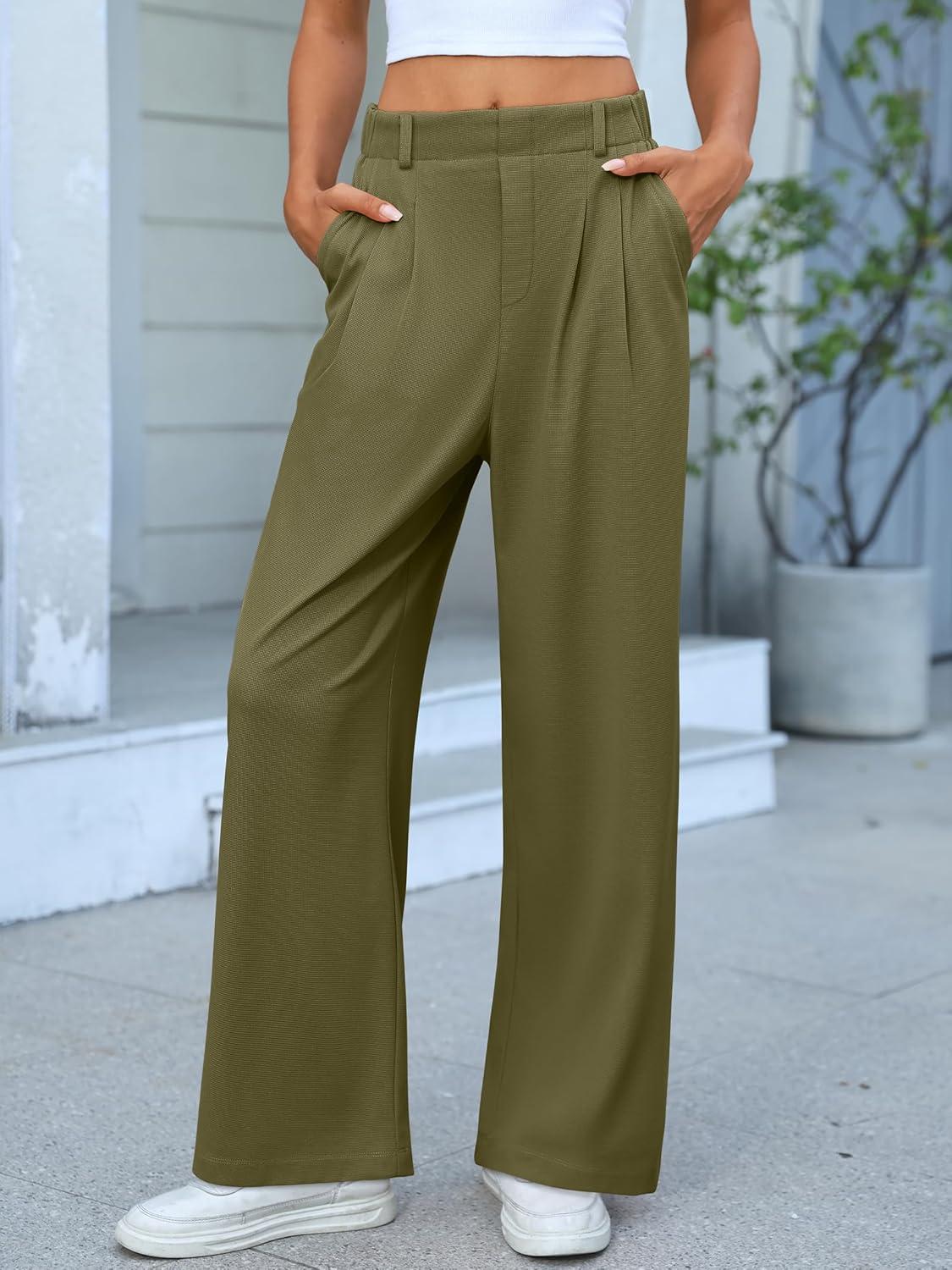 ANRABESS Women Wide Leg Pants Stretchy Work Dress Pants Waffle Knit Business Casual Pull on Palazzo Slacks Trousers Outfits(Olive Green)