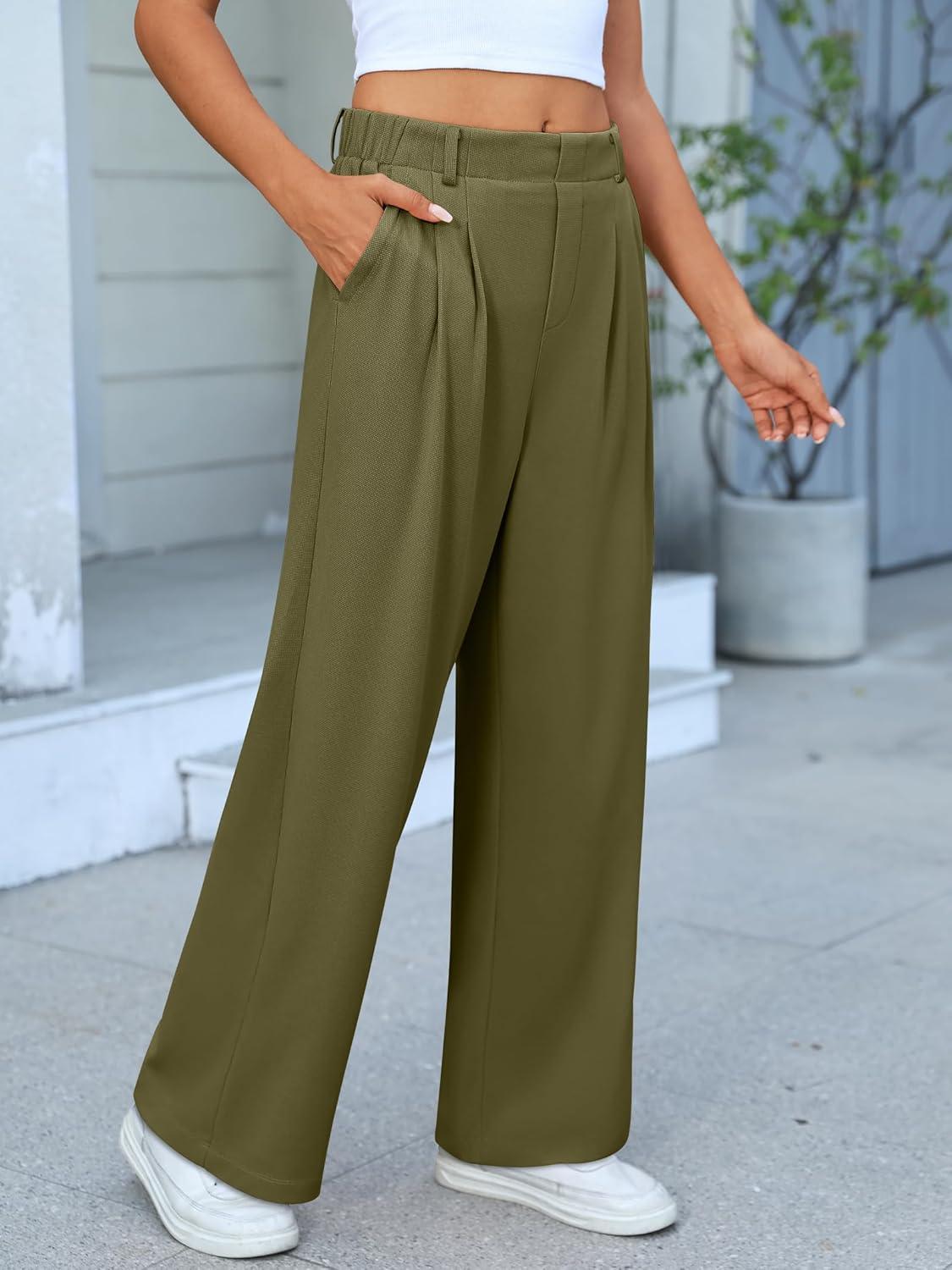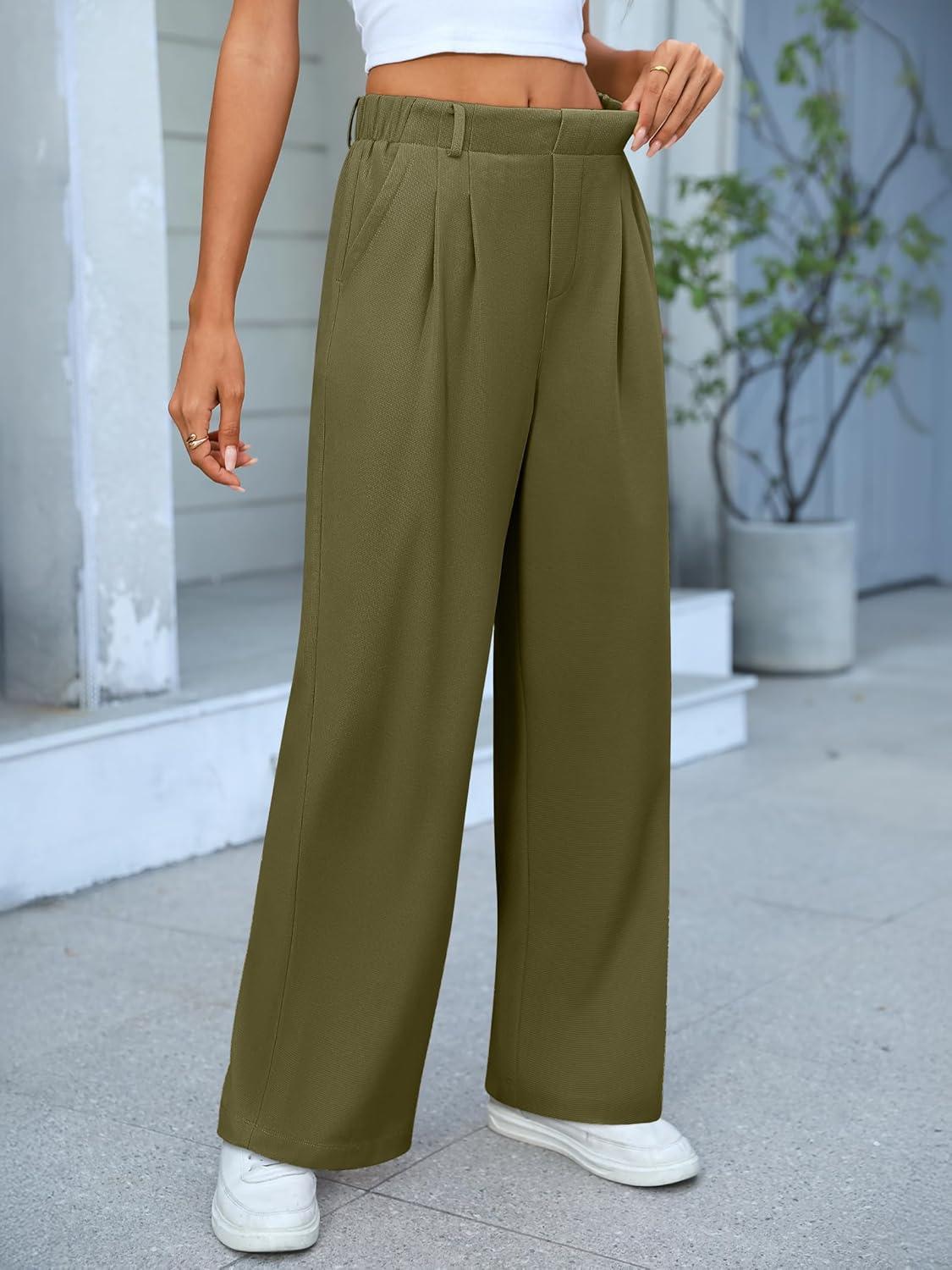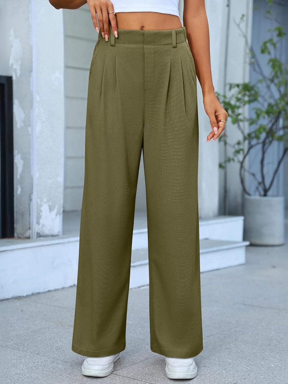 ANRABESS Women Wide Leg Pants Stretchy Work Dress Pants Waffle Knit Business Casual Pull on Palazzo Slacks Trousers Outfits(Olive Green)