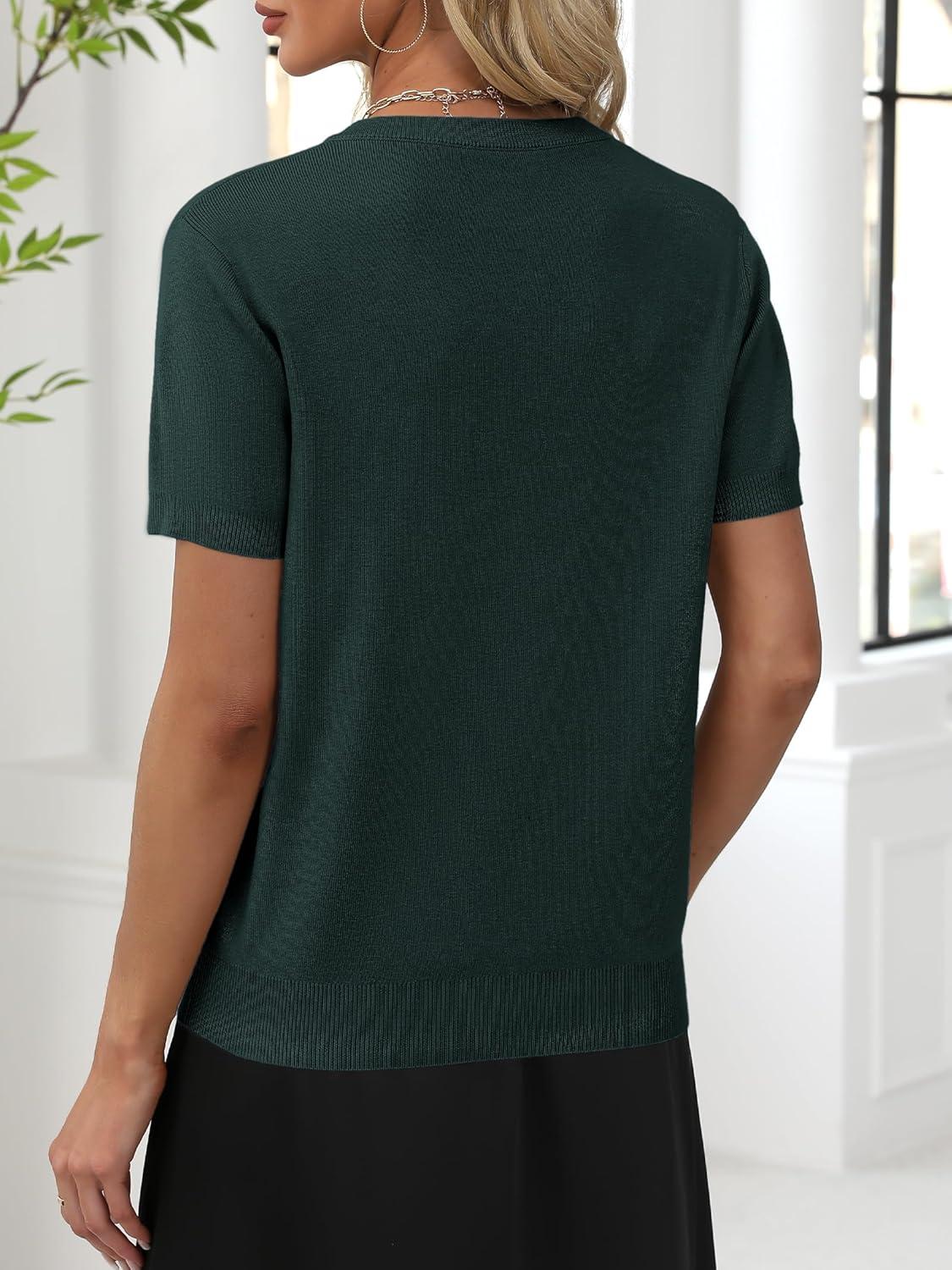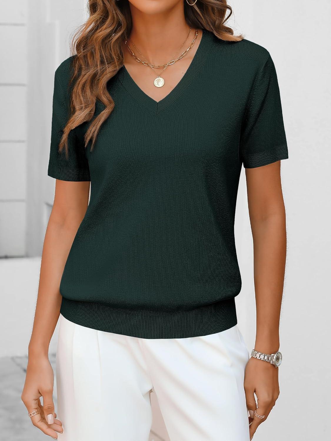 ANRABESS Women Wool Blend Sweater Summer 2025 Short Sleeve V Neck Pullover Top Business Casual Outfit Beach Vacation Clothes(Dark Green)