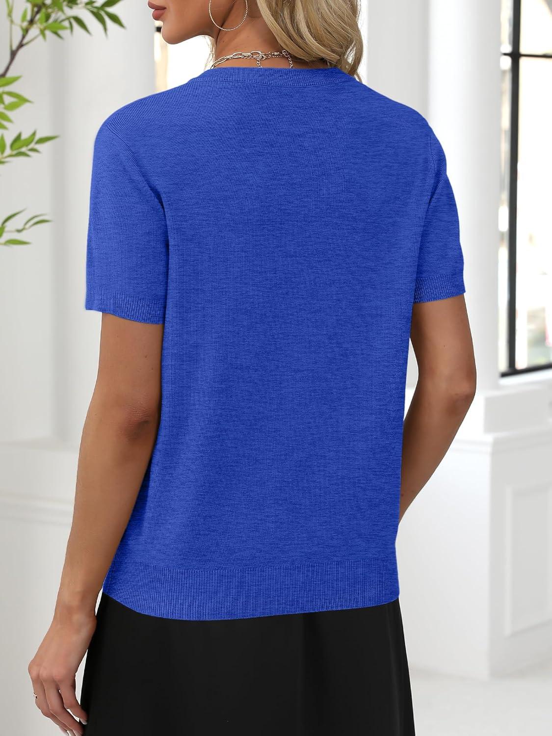 ANRABESS Women Wool Blend Sweater Summer 2025 Short Sleeve V Neck Pullover Top Business Casual Outfit Beach Vacation Clothes(Royal Blue)