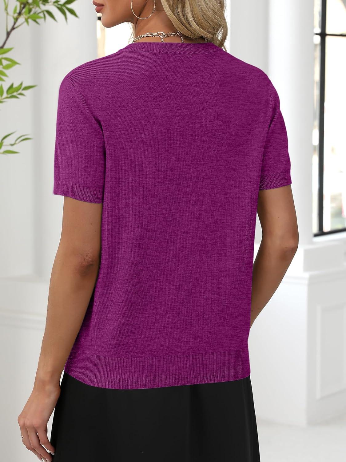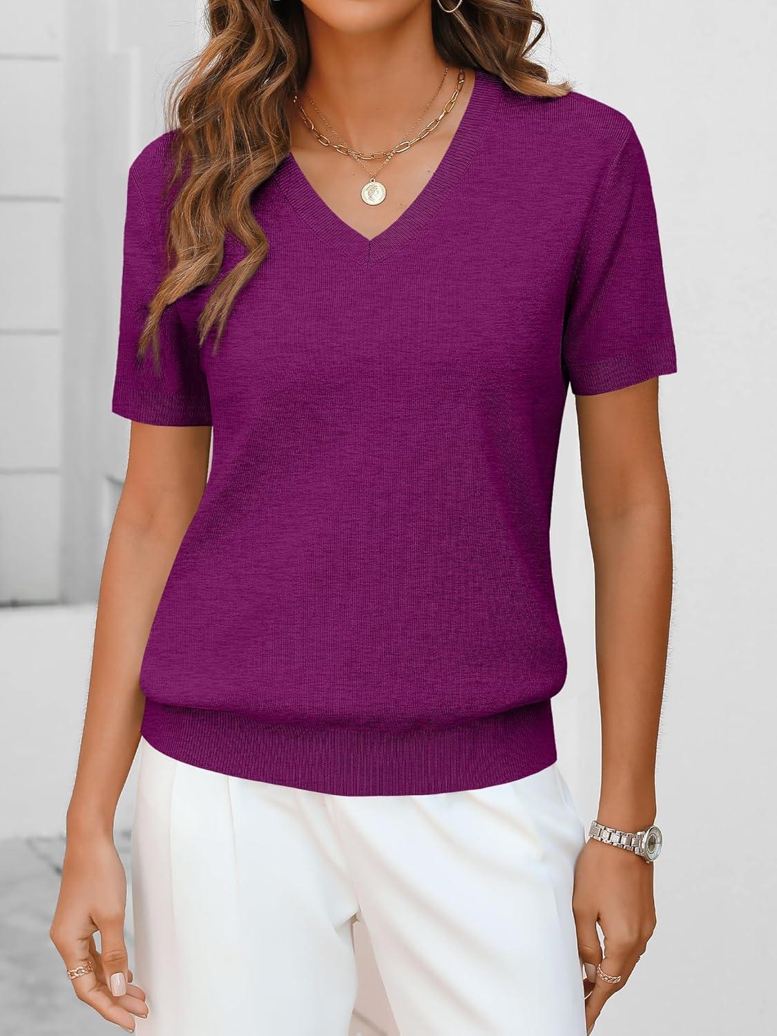 ANRABESS Women Wool Blend Sweater Summer 2026 Short Sleeve V Neck Pullover Top Business Casual Outfit Beach Vacation Clothes(Deep Hot Pink)