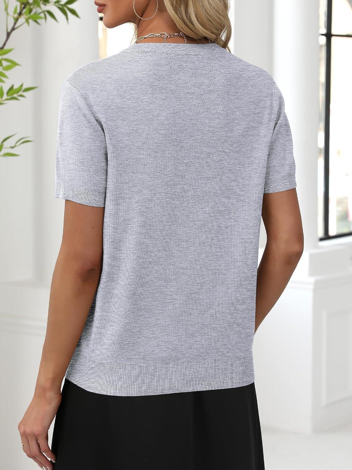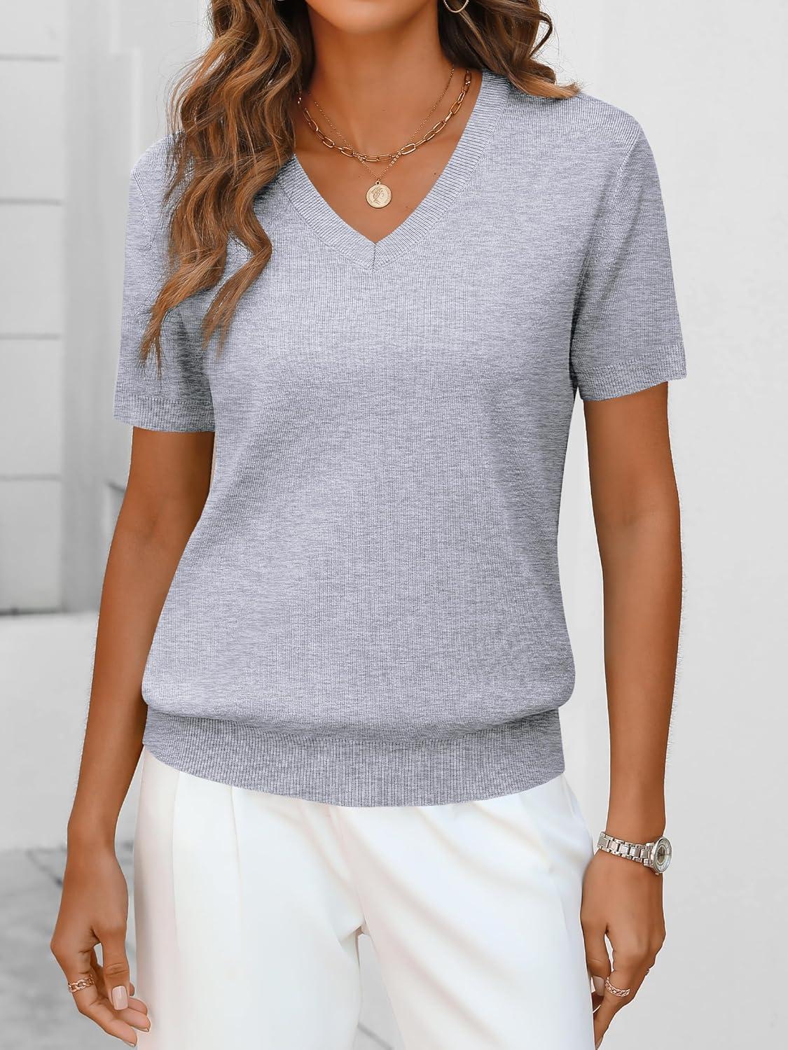 ANRABESS Women Wool Blend Sweater Summer 2026 Short Sleeve V Neck Pullover Top Business Casual Outfit Beach Vacation Clothes(Gray)
