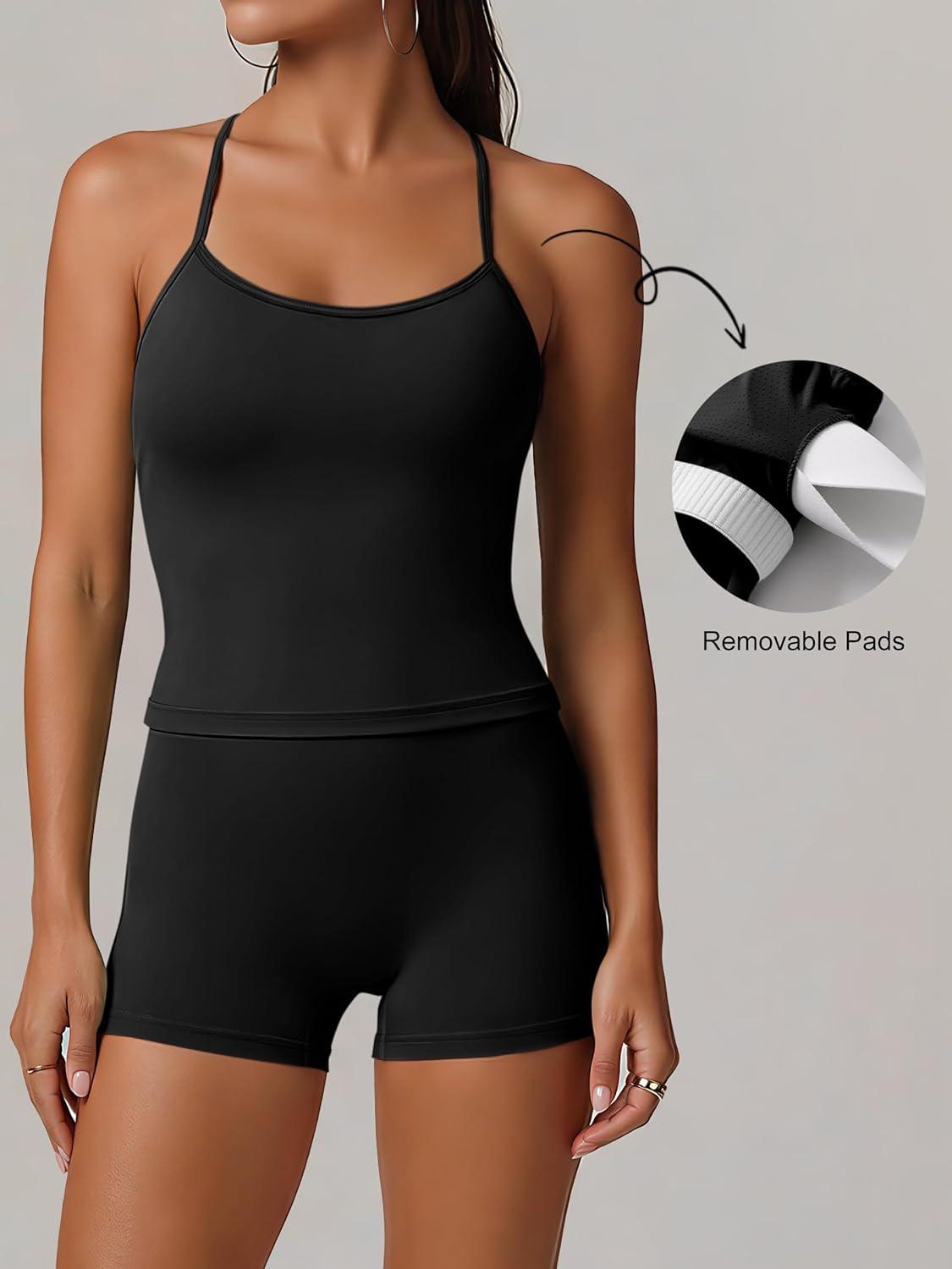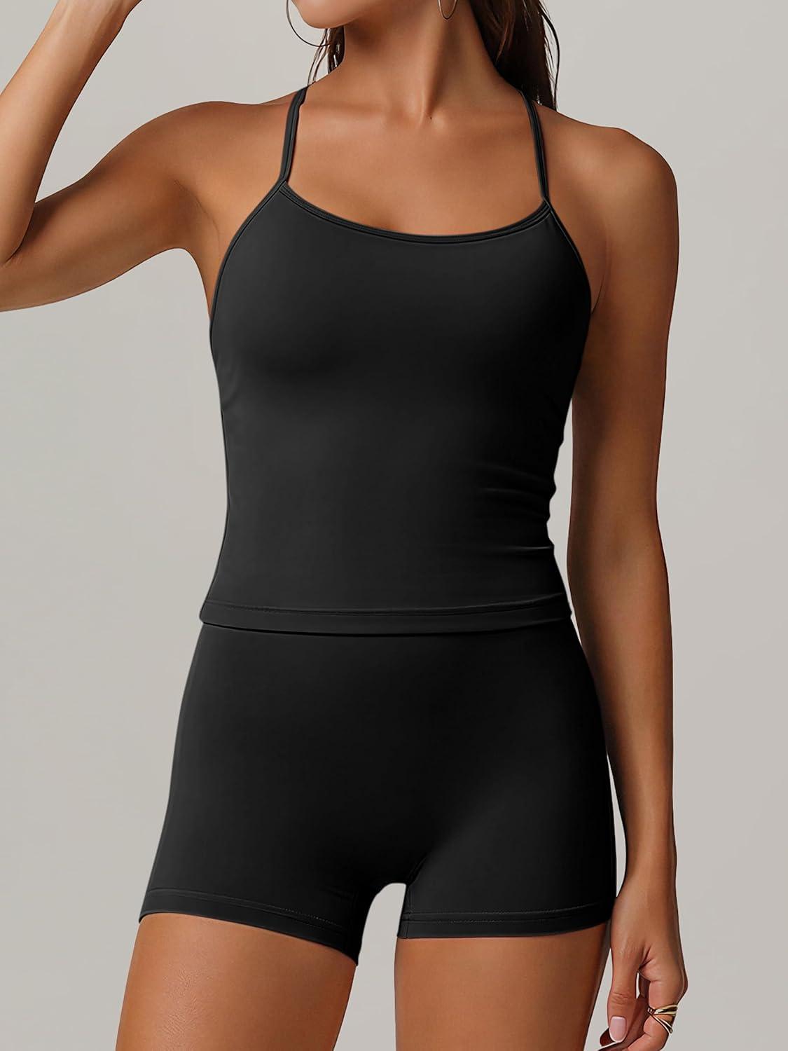 imageANRABESS Women Workout Sets Build in Bra 2 Piece Outfits Tank Tops Tummy Control Shorts Yoga Gym Active Wear Clothing SetBlack