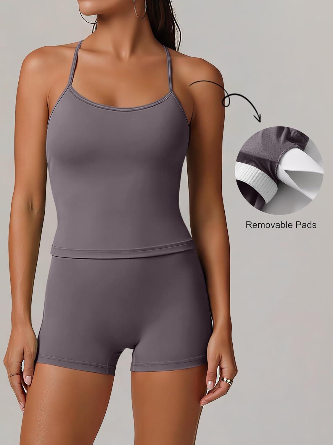 imageANRABESS Women Workout Sets Build in Bra 2 Piece Outfits Tank Tops Tummy Control Shorts Yoga Gym Active Wear Clothing SetDark Grey