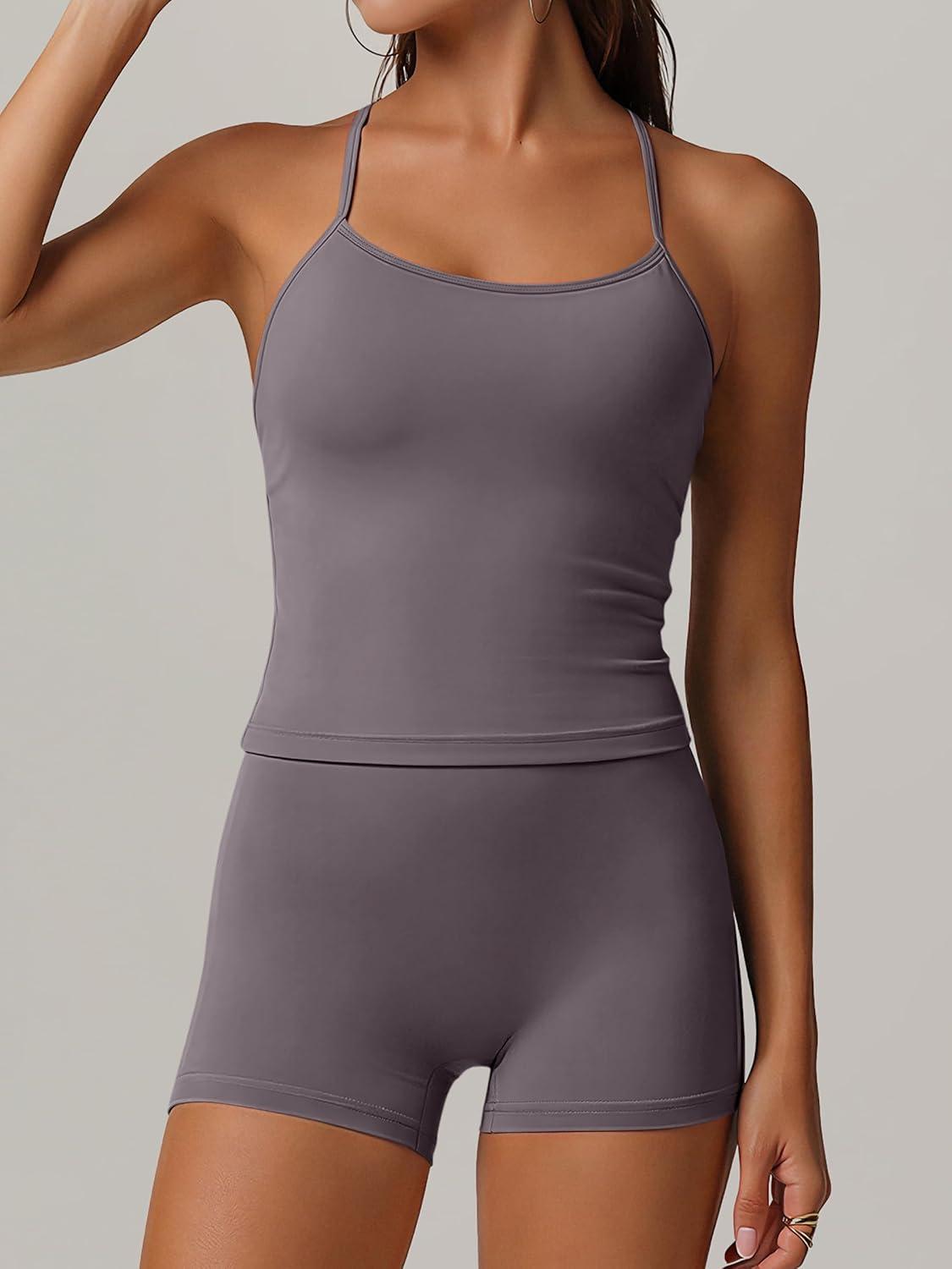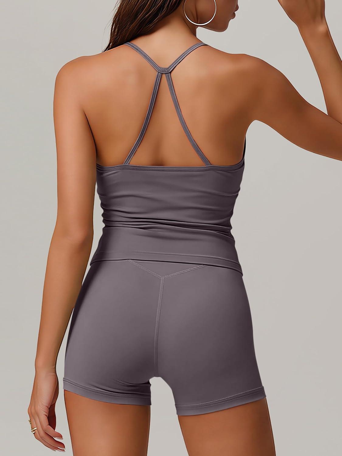 ANRABESS Women Workout Sets Build in Bra 2 Piece Outfits Tank Tops Tummy Control Shorts Yoga Gym Active Wear Clothing Set(Dark Grey)