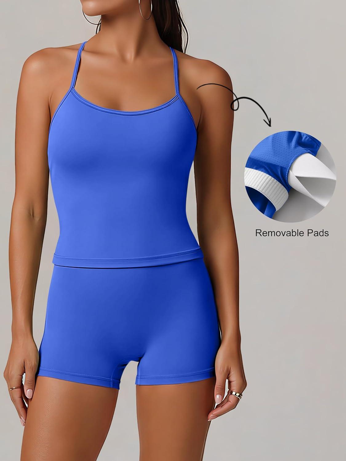 ANRABESS Women Workout Sets Build in Bra 2 Piece Outfits Tank Tops Tummy Control Shorts Yoga Gym Active Wear Clothing Set(Royal Blue)