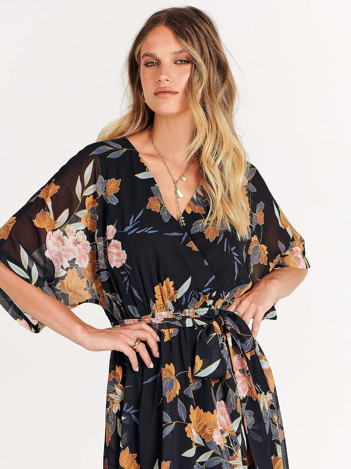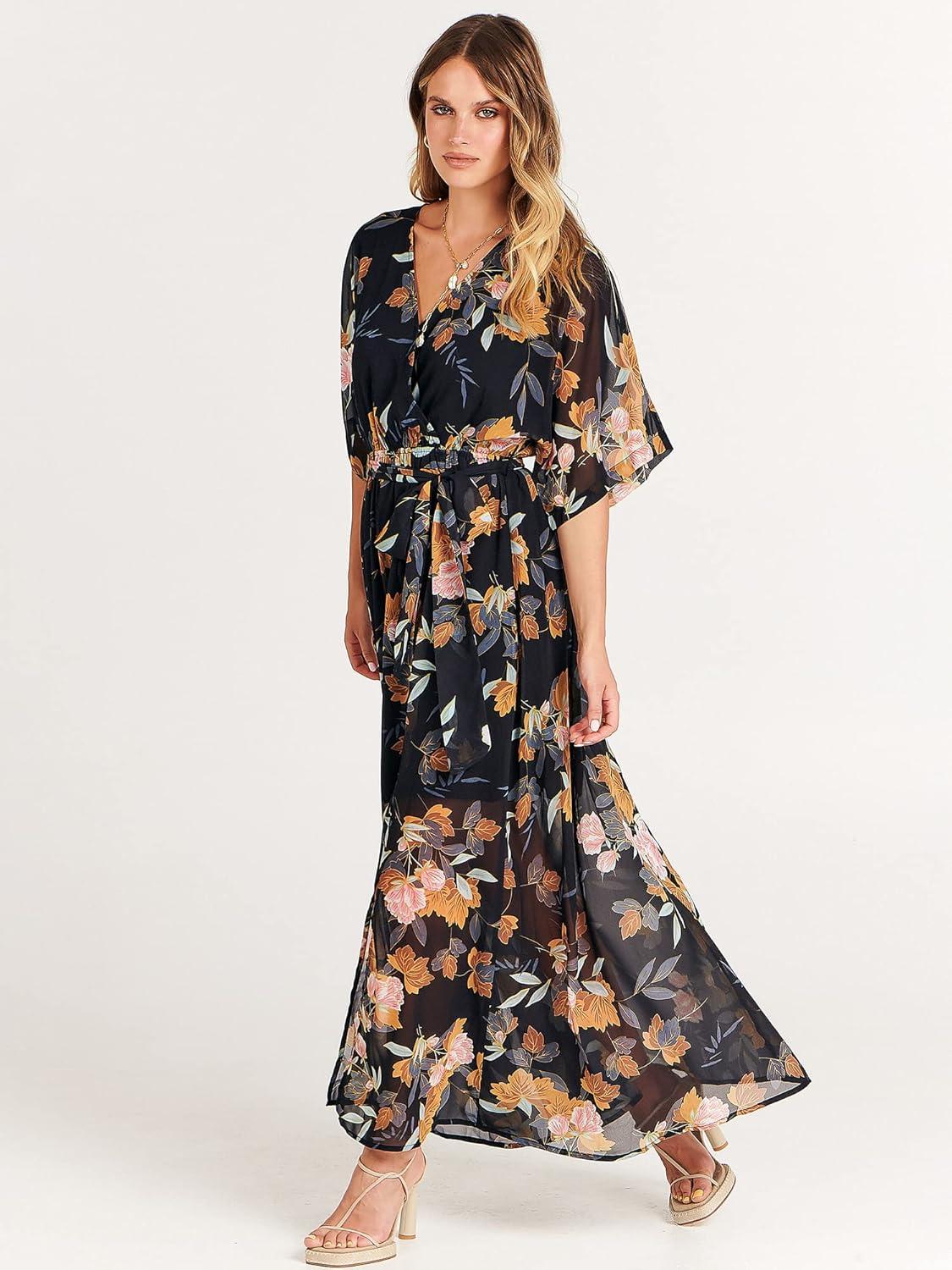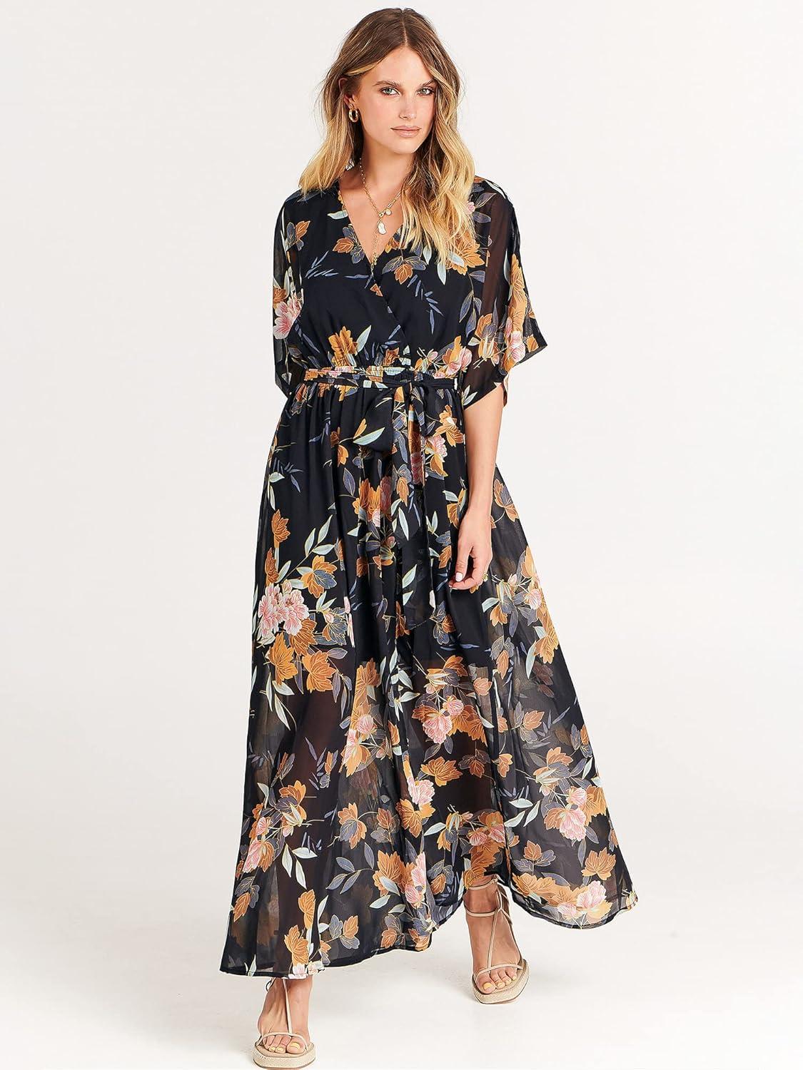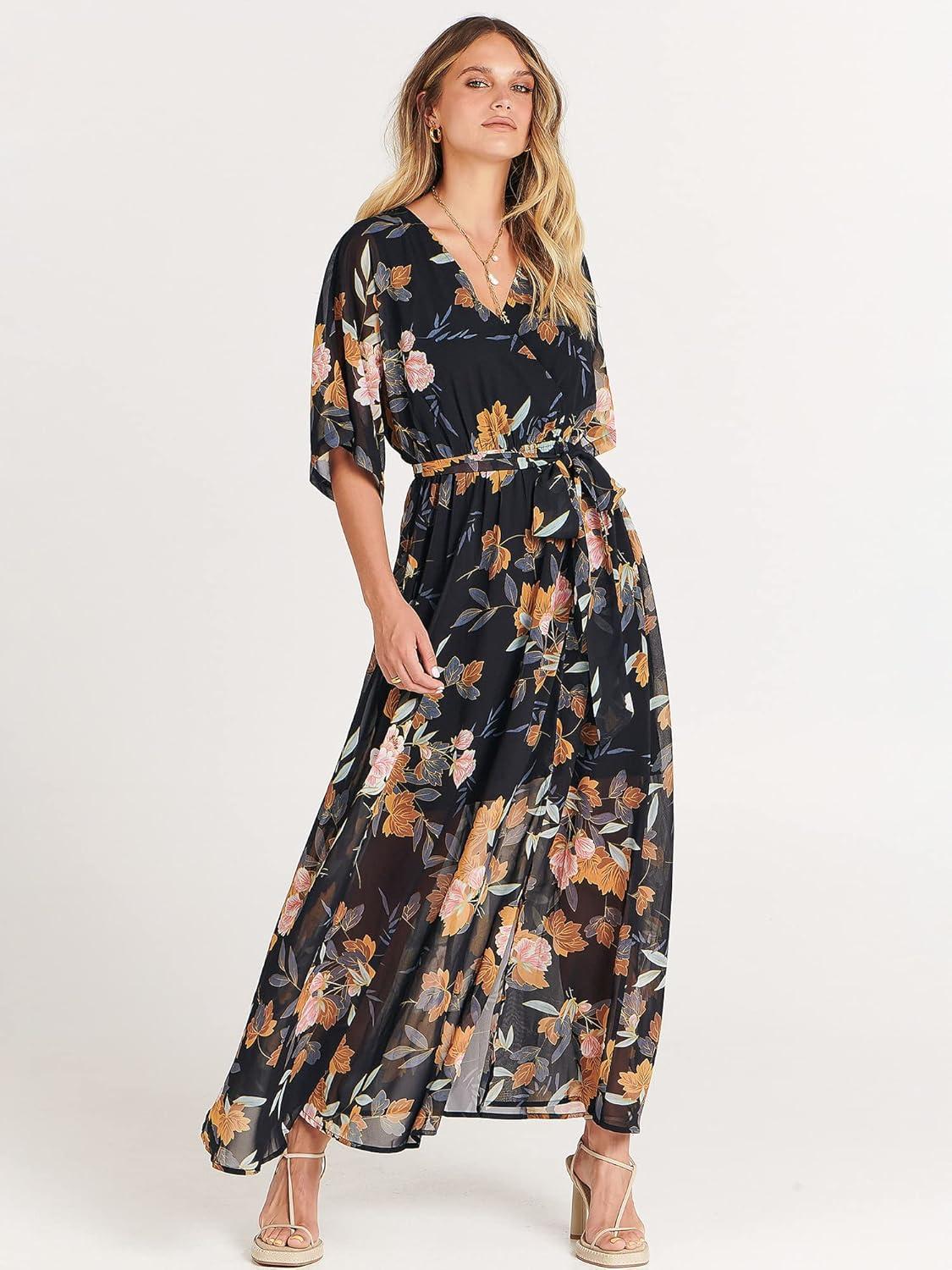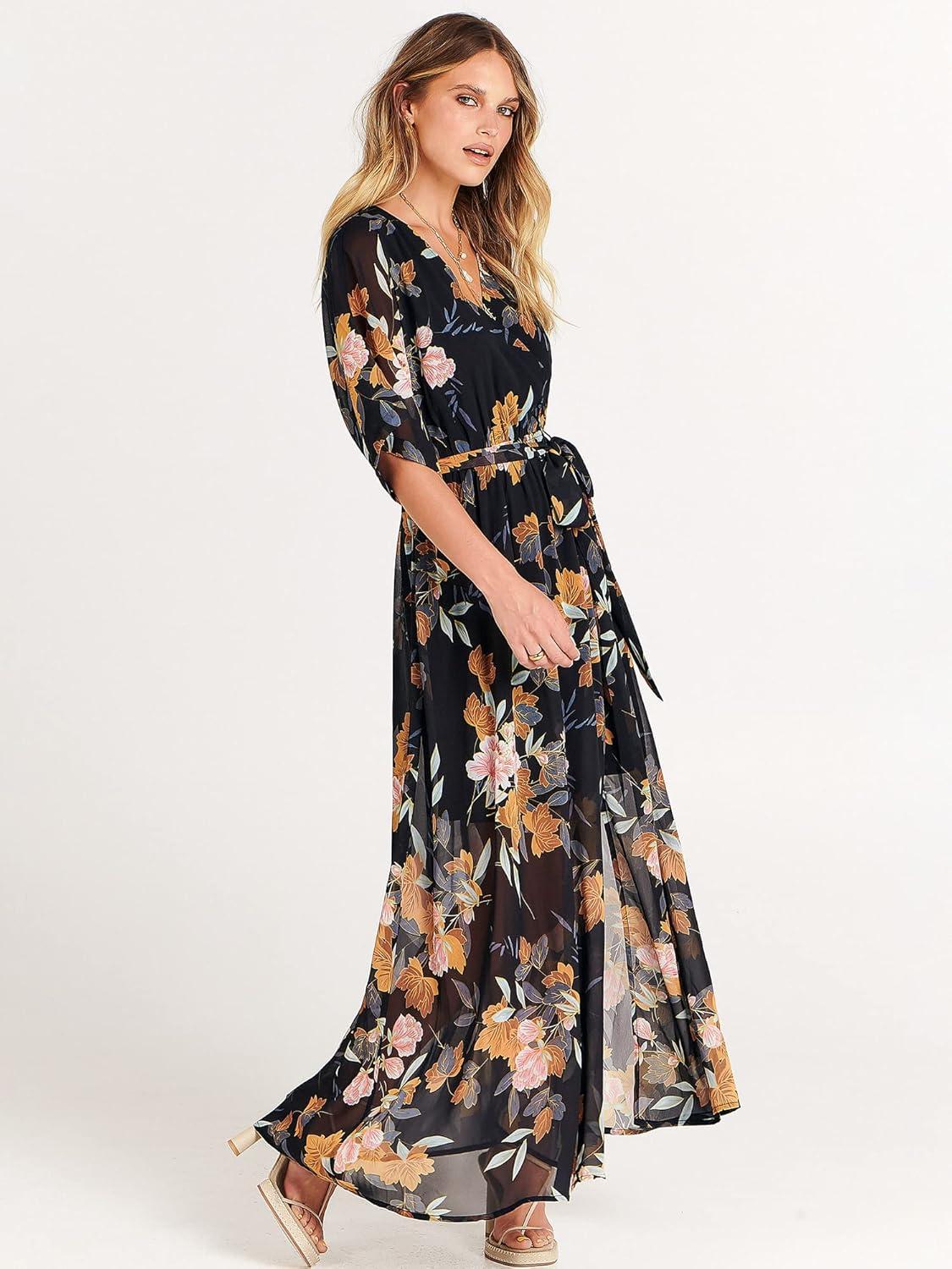imageANRABESS Womens 12 Sleeve Beach Wedding Guest Maxi Dresses 2025 Fall Wrap V Neck Boho Floral Flowy Slit Long Summer DressesFloral Black Yellow
