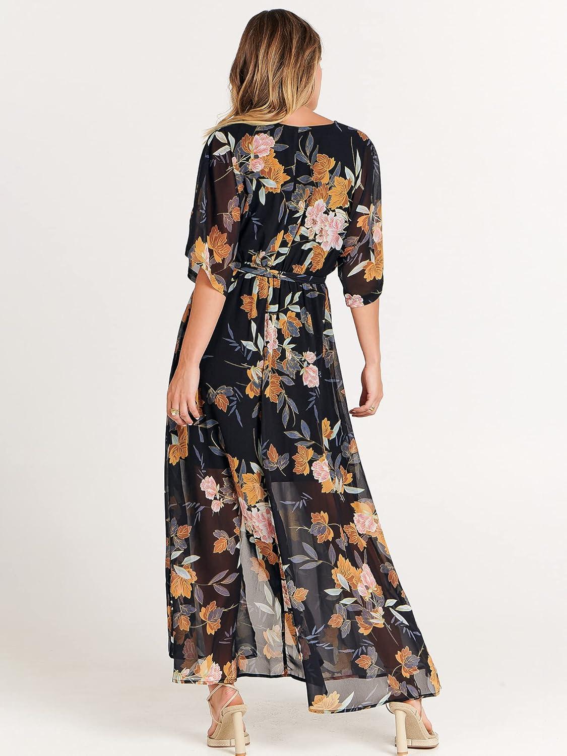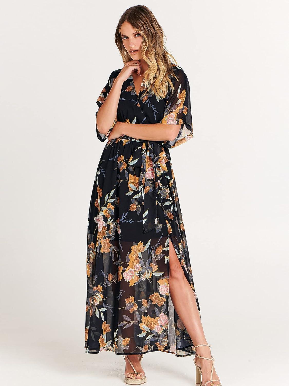 ANRABESS Womens 1/2 Sleeve Beach Wedding Guest Maxi Dresses 2025 Fall Wrap V Neck Boho Floral Flowy Slit Long Summer Dresses(Floral Black Yellow)