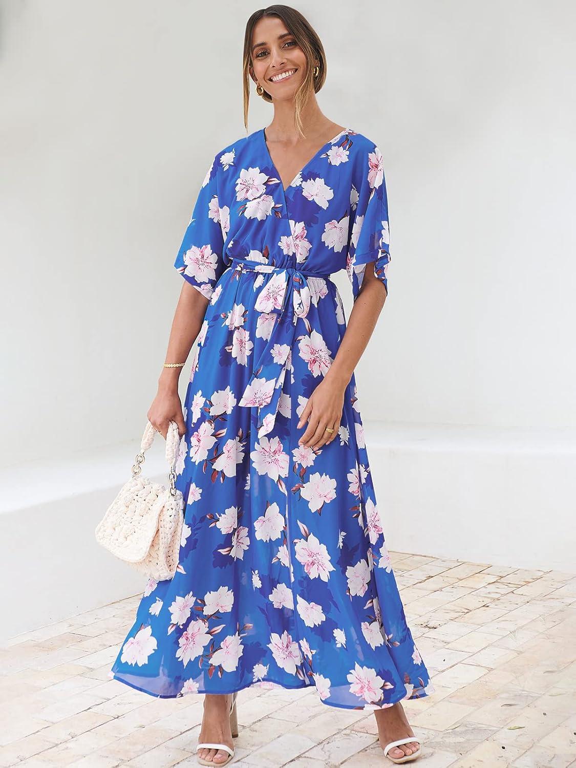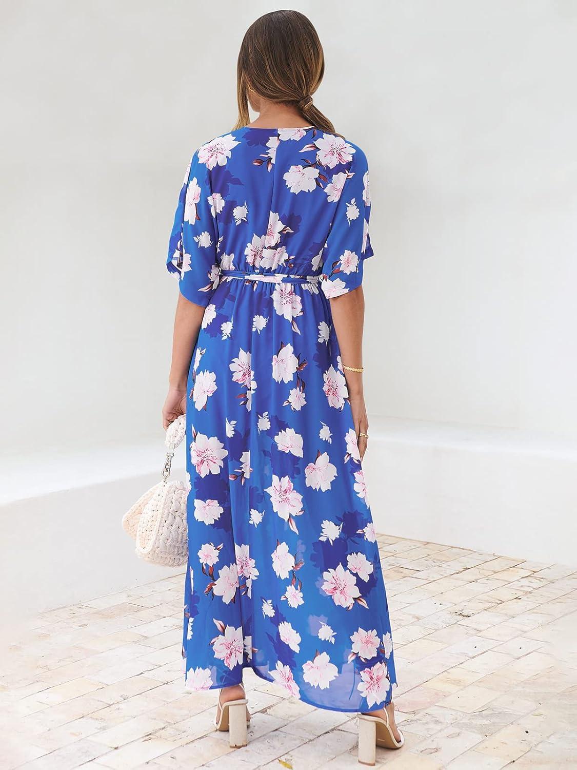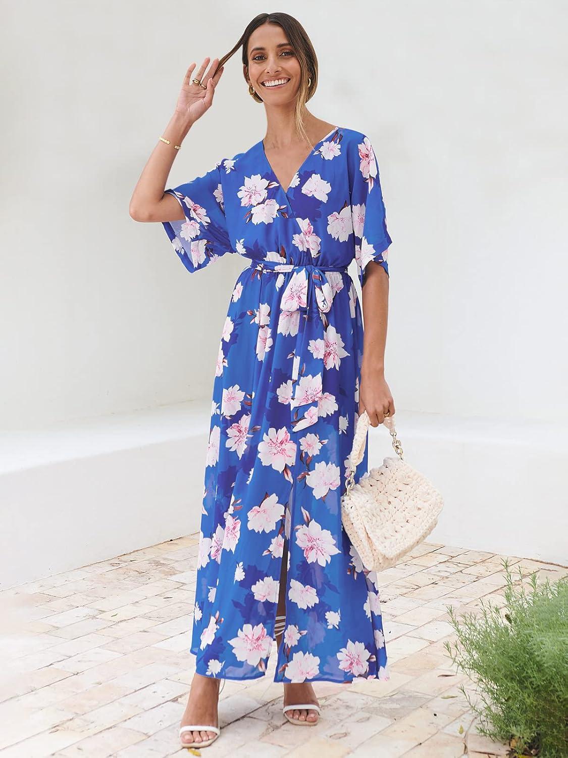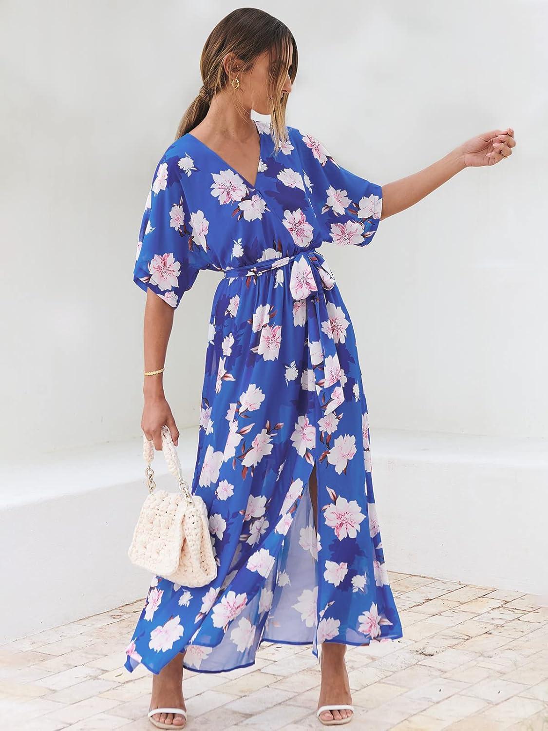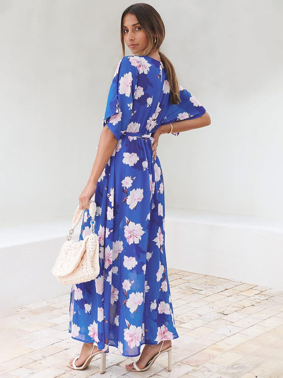 ANRABESS Womens 1/2 Sleeve Beach Wedding Guest Maxi Dresses 2025 Fall Wrap V Neck Boho Floral Flowy Slit Long Summer Dresses(Floral Blue)
