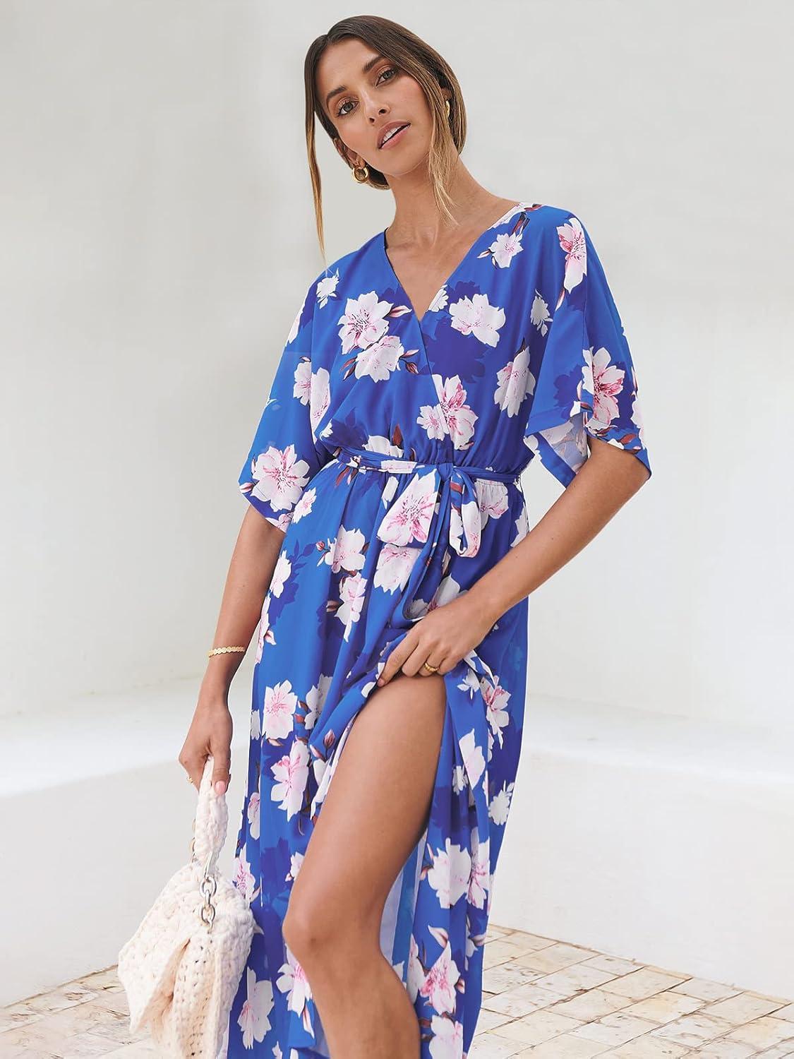 imageANRABESS Womens 12 Sleeve Beach Wedding Guest Maxi Dresses 2025 Fall Wrap V Neck Boho Floral Flowy Slit Long Summer DressesFloral Blue