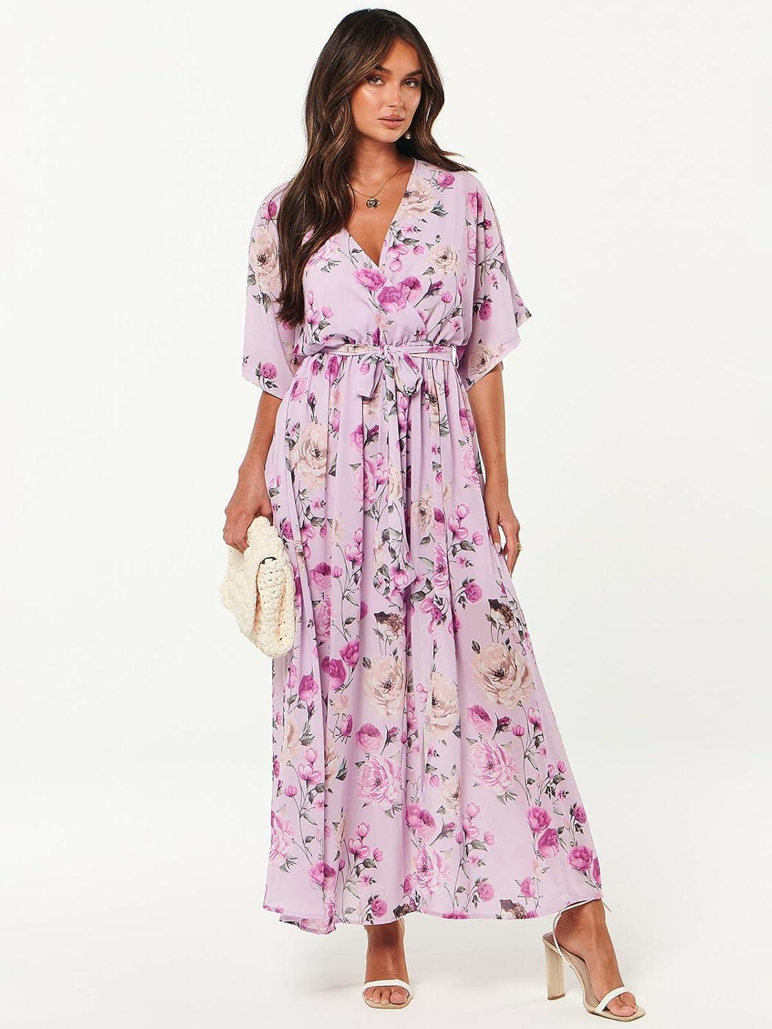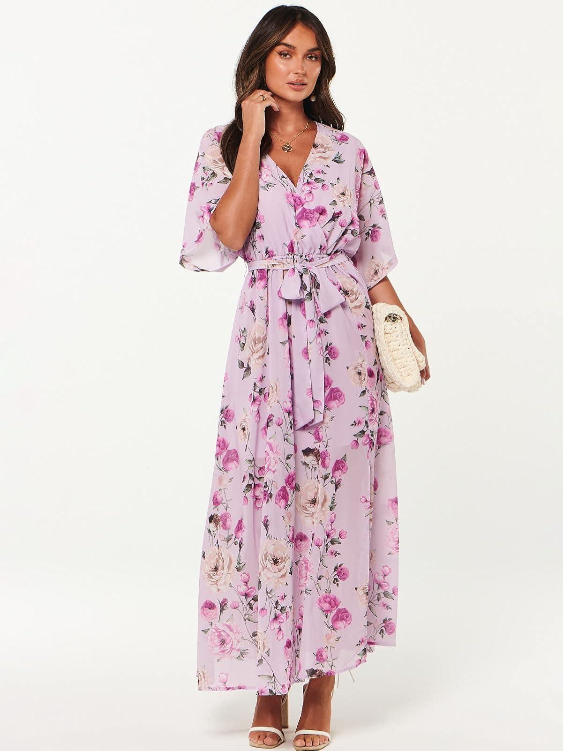 ANRABESS Womens 1/2 Sleeve Beach Wedding Guest Maxi Dresses 2025 Fall Wrap V Neck Boho Floral Flowy Slit Long Summer Dresses(Floral Purple)