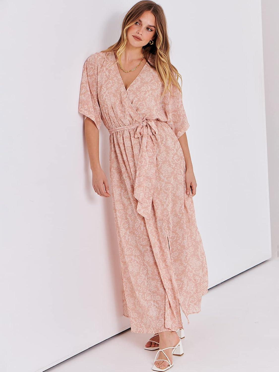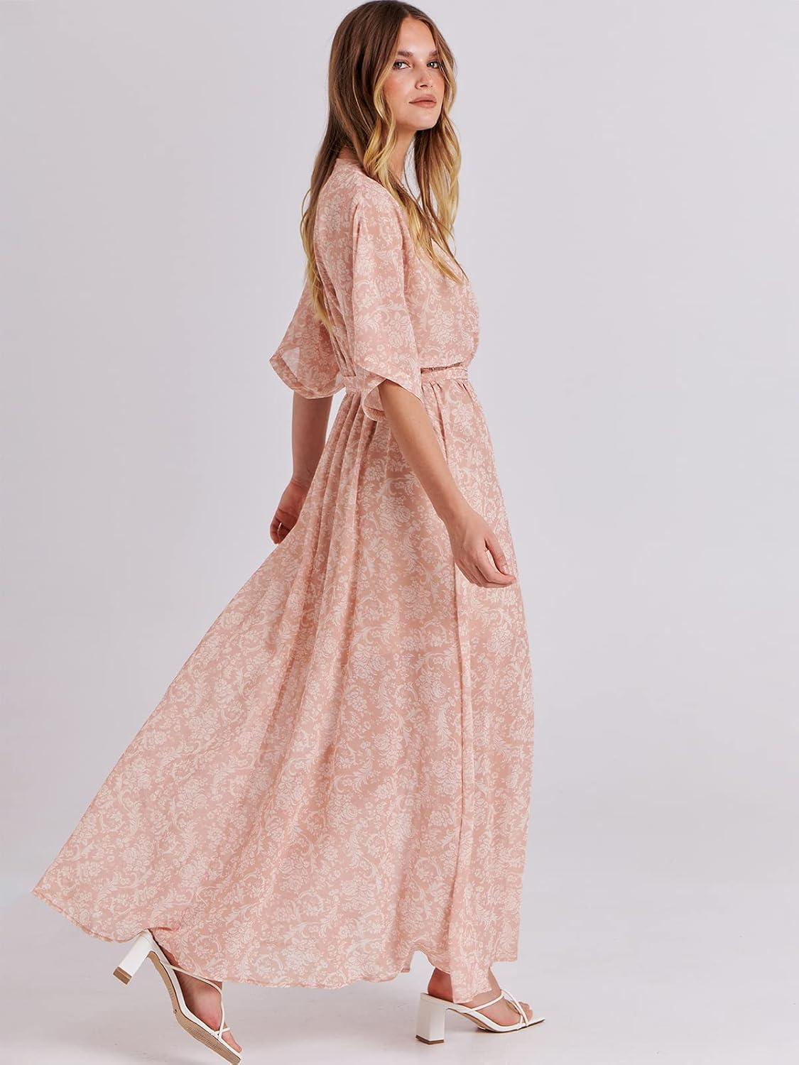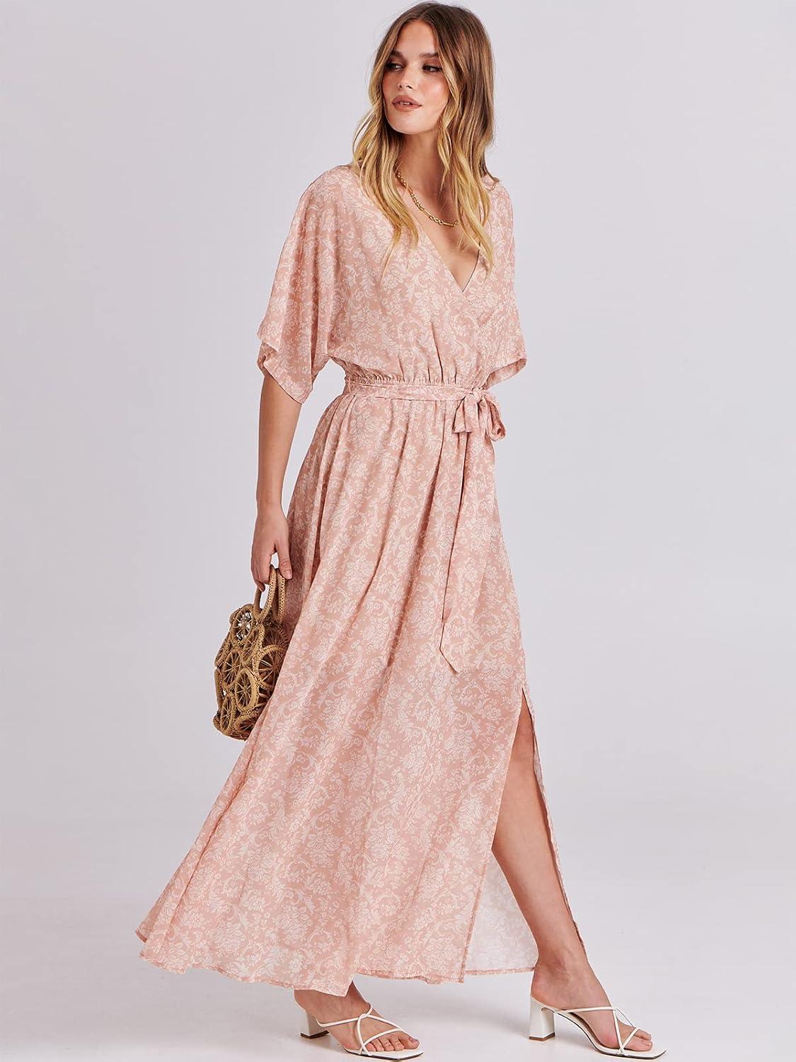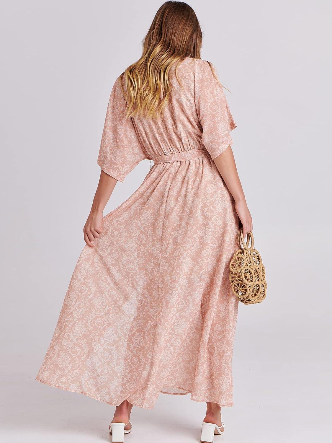 ANRABESS Womens 1/2 Sleeve Beach Wedding Guest Maxi Dresses 2025 Fall Wrap V Neck Boho Floral Flowy Slit Long Summer Dresses(Floral Rose Gold)