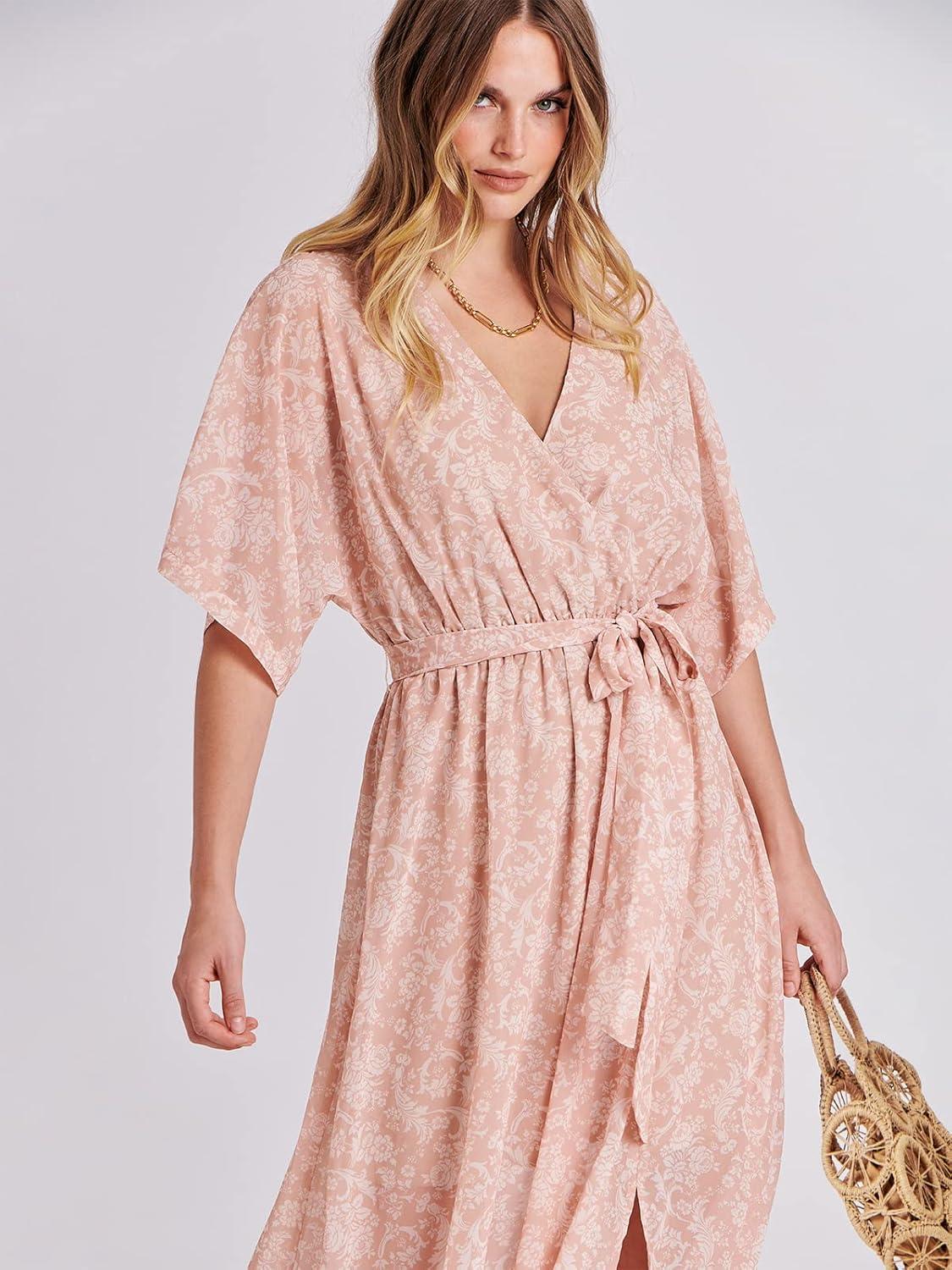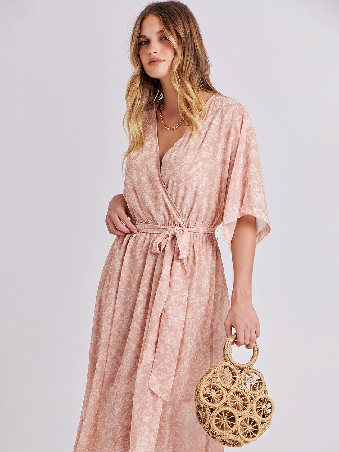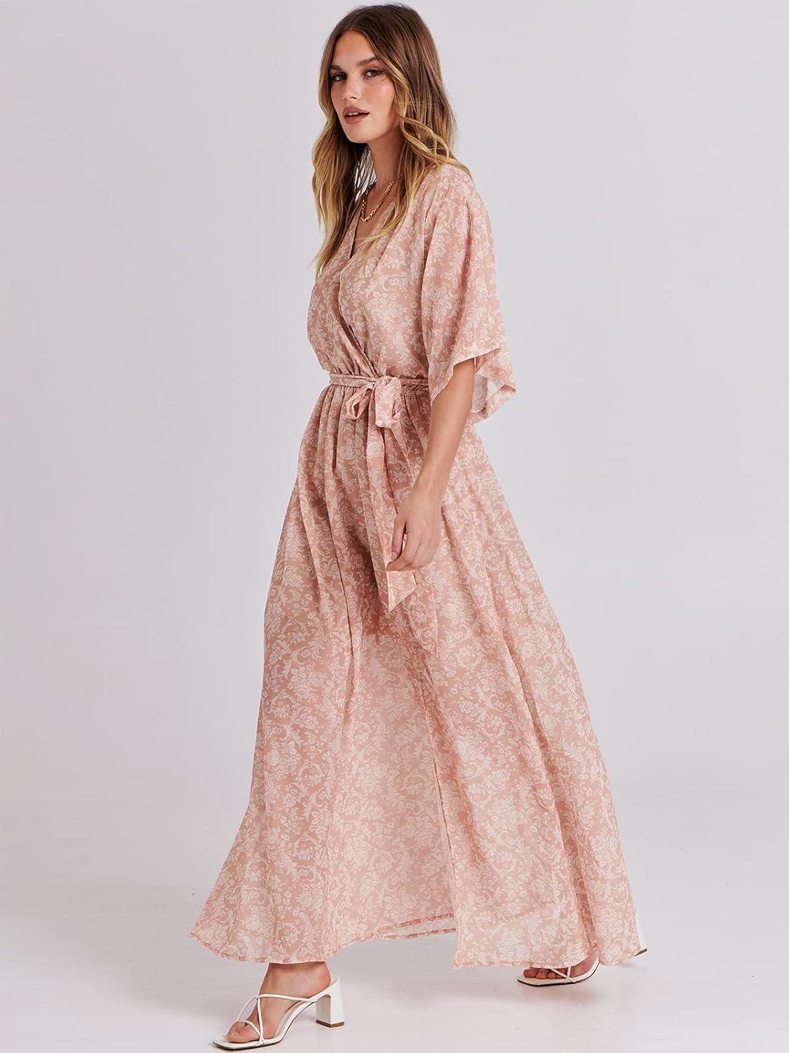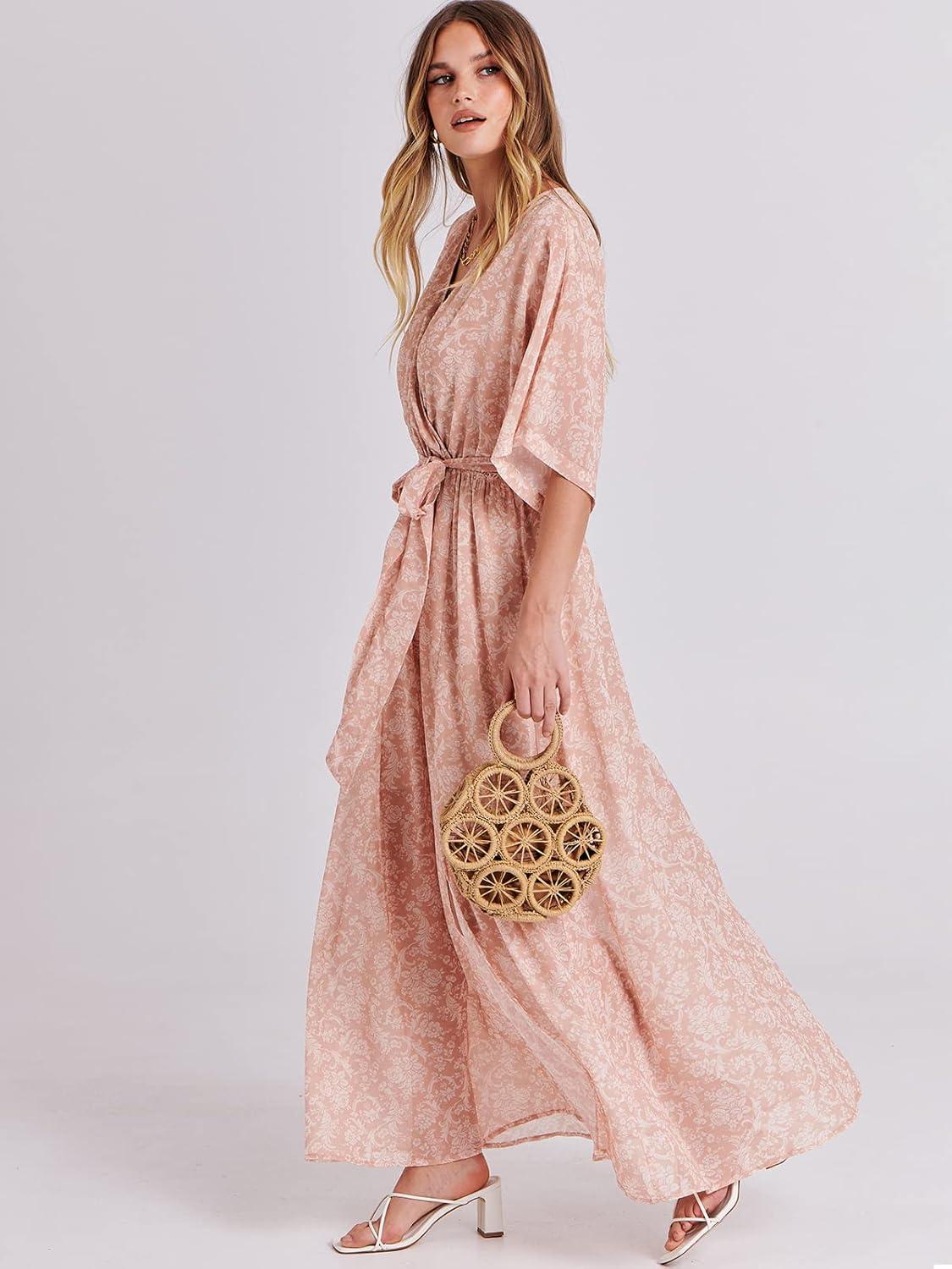 ANRABESS Womens 1/2 Sleeve Beach Wedding Guest Maxi Dresses 2025 Fall Wrap V Neck Boho Floral Flowy Slit Long Summer Dresses(Floral Rose Gold)