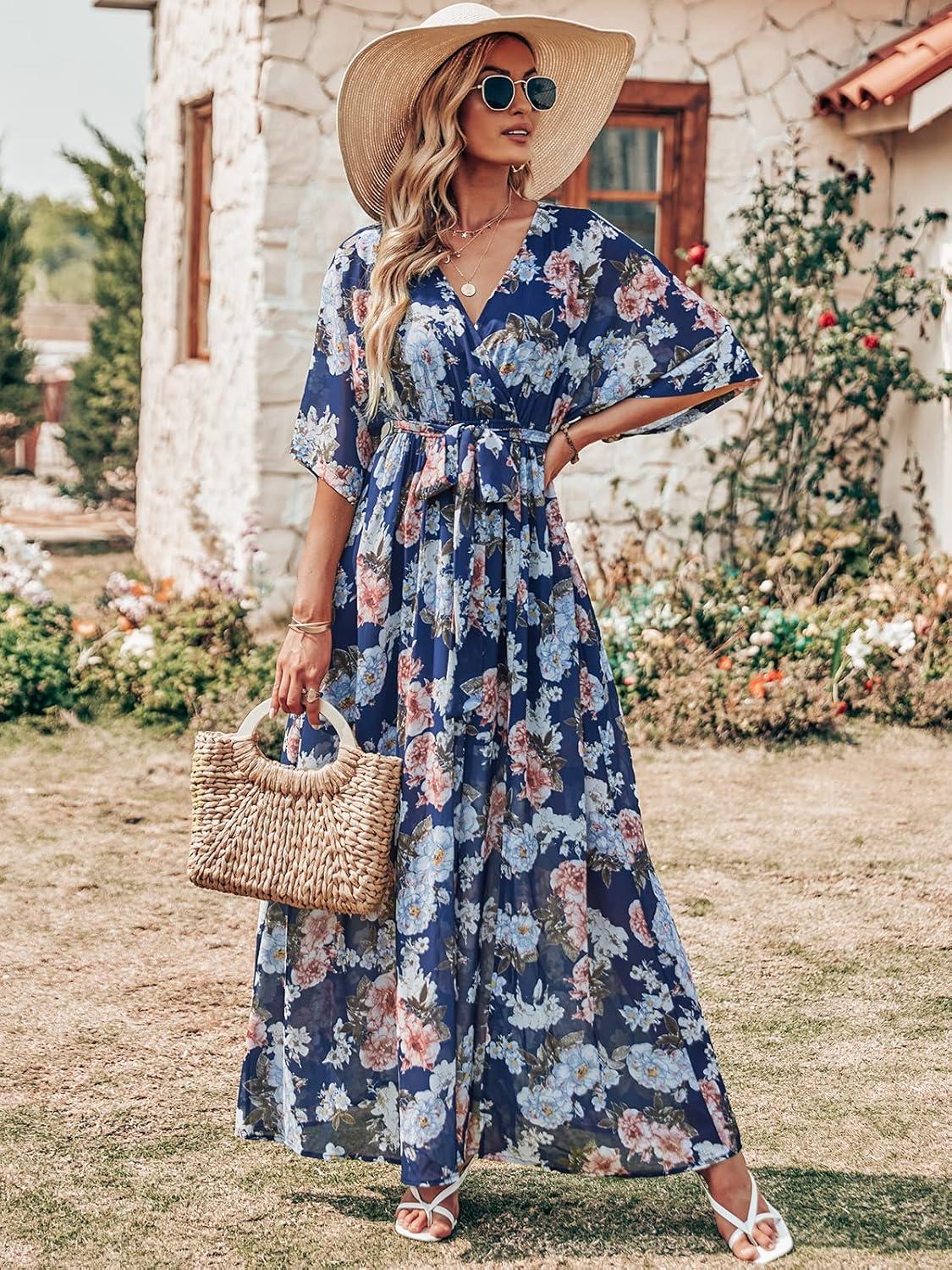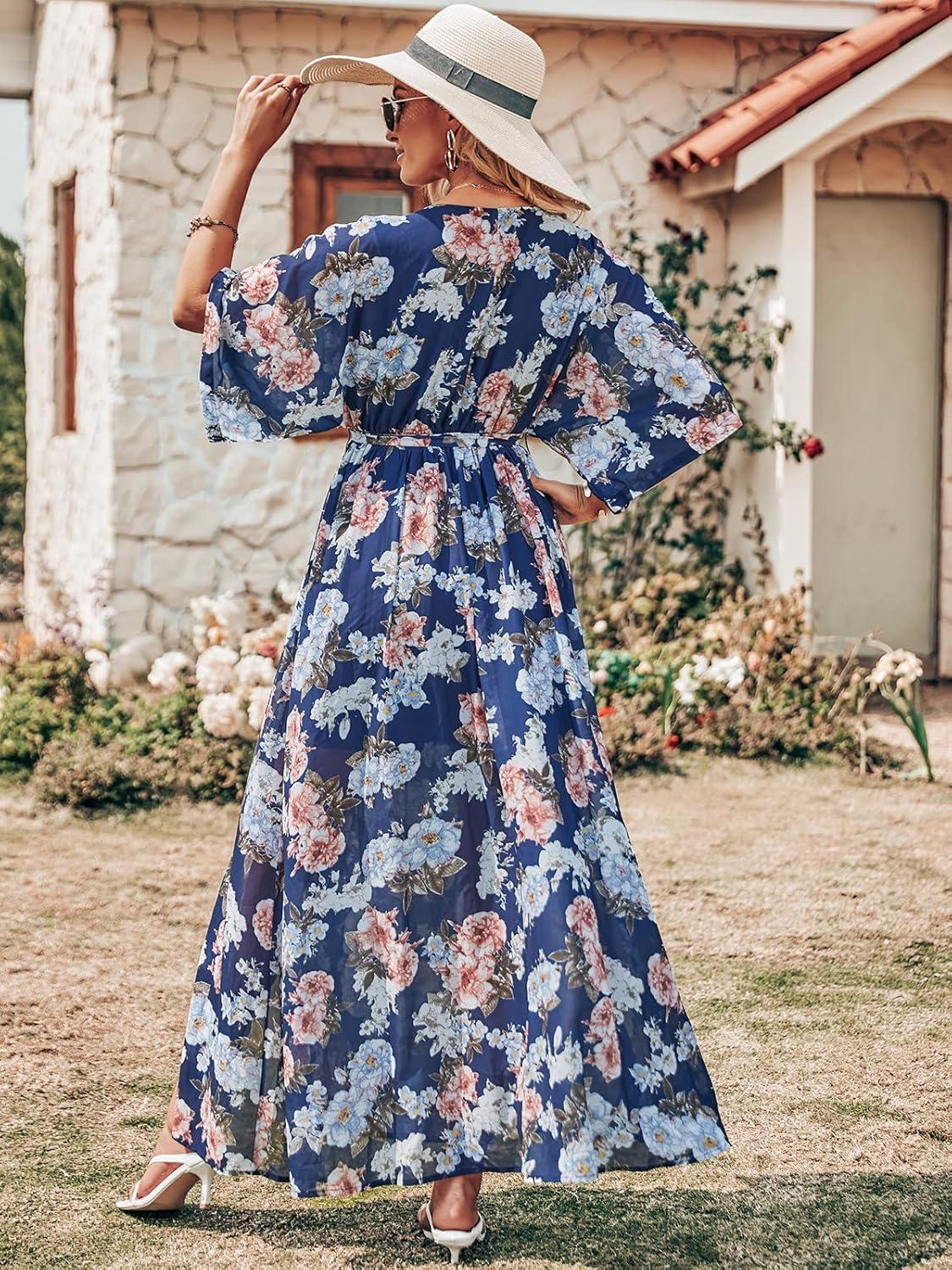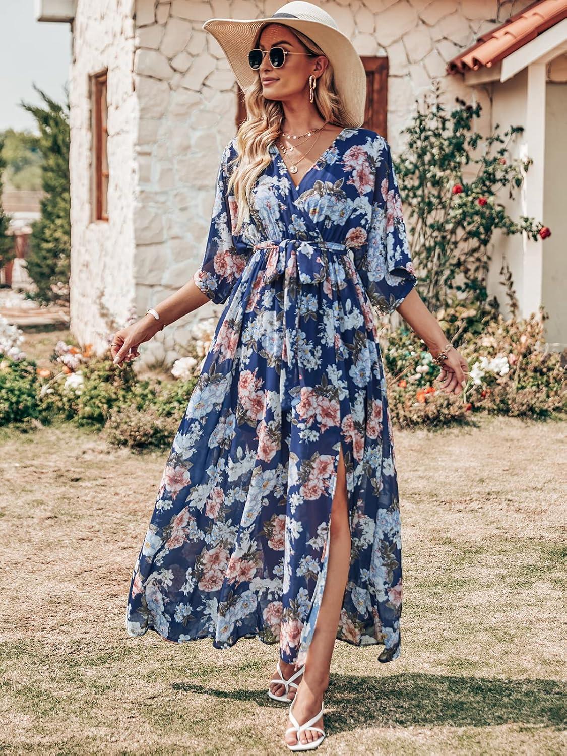ANRABESS Womens 1/2 Sleeve Beach Wedding Guest Maxi Dresses 2025 Fall Wrap V Neck Boho Floral Flowy Slit Long Summer Dresses(Navy Flor)