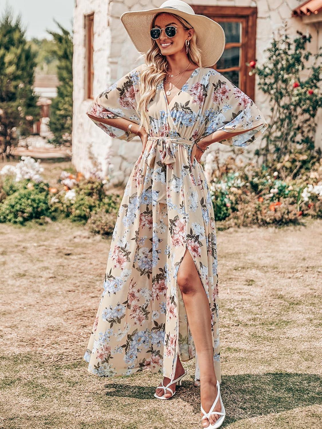 ANRABESS Womens 1/2 Sleeve Beach Wedding Guest Maxi Dresses 2025 Fall Wrap V Neck Boho Floral Flowy Slit Long Summer Dresses(White Flor Print)