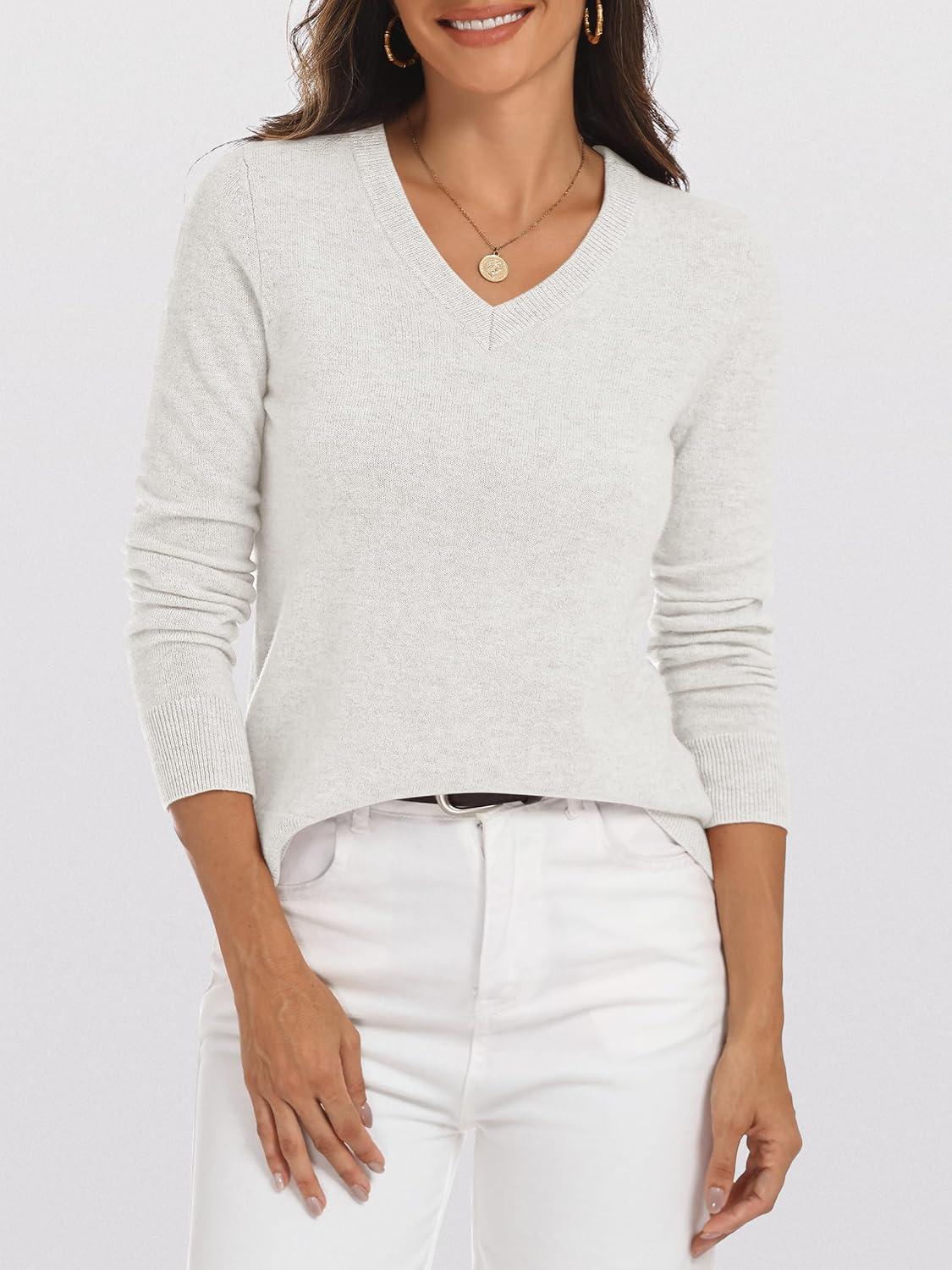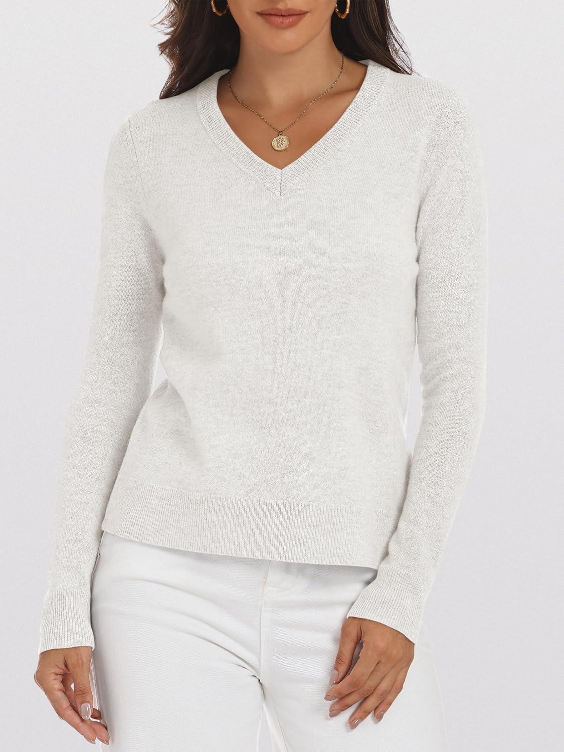 ANRABESS Womens 100% Wool Sweaters V Neck Long Sleeve Work Business Casual Basic Pullover Sweater Tops 2025 Fall Outfits(Beige)