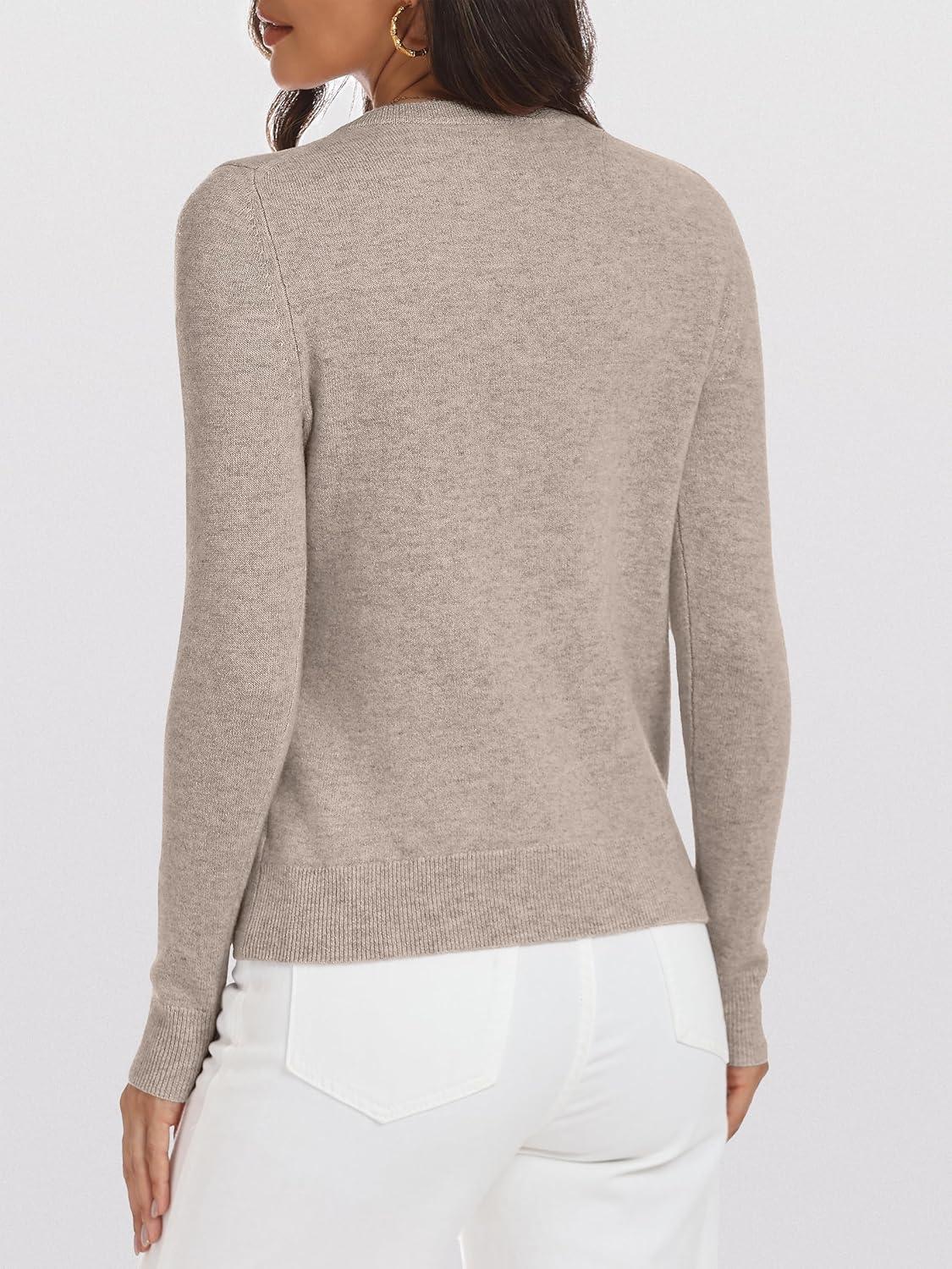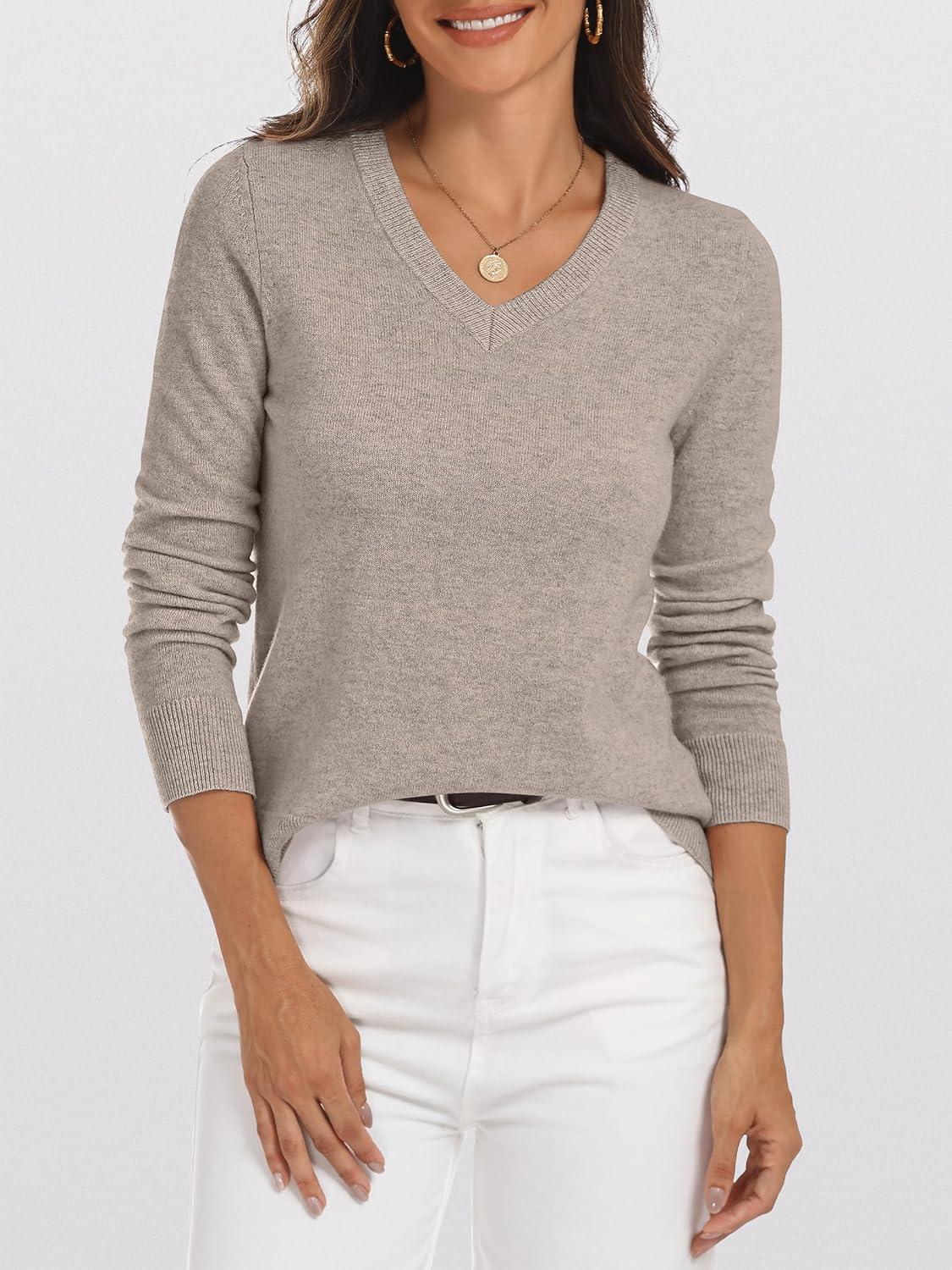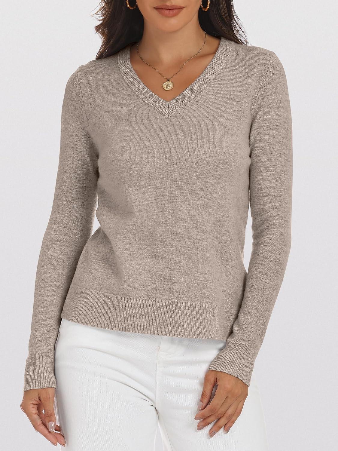 ANRABESS Womens 100% Wool Sweaters V Neck Long Sleeve Work Business Casual Basic Pullover Sweater Tops 2025 Fall Outfits(Khaki)