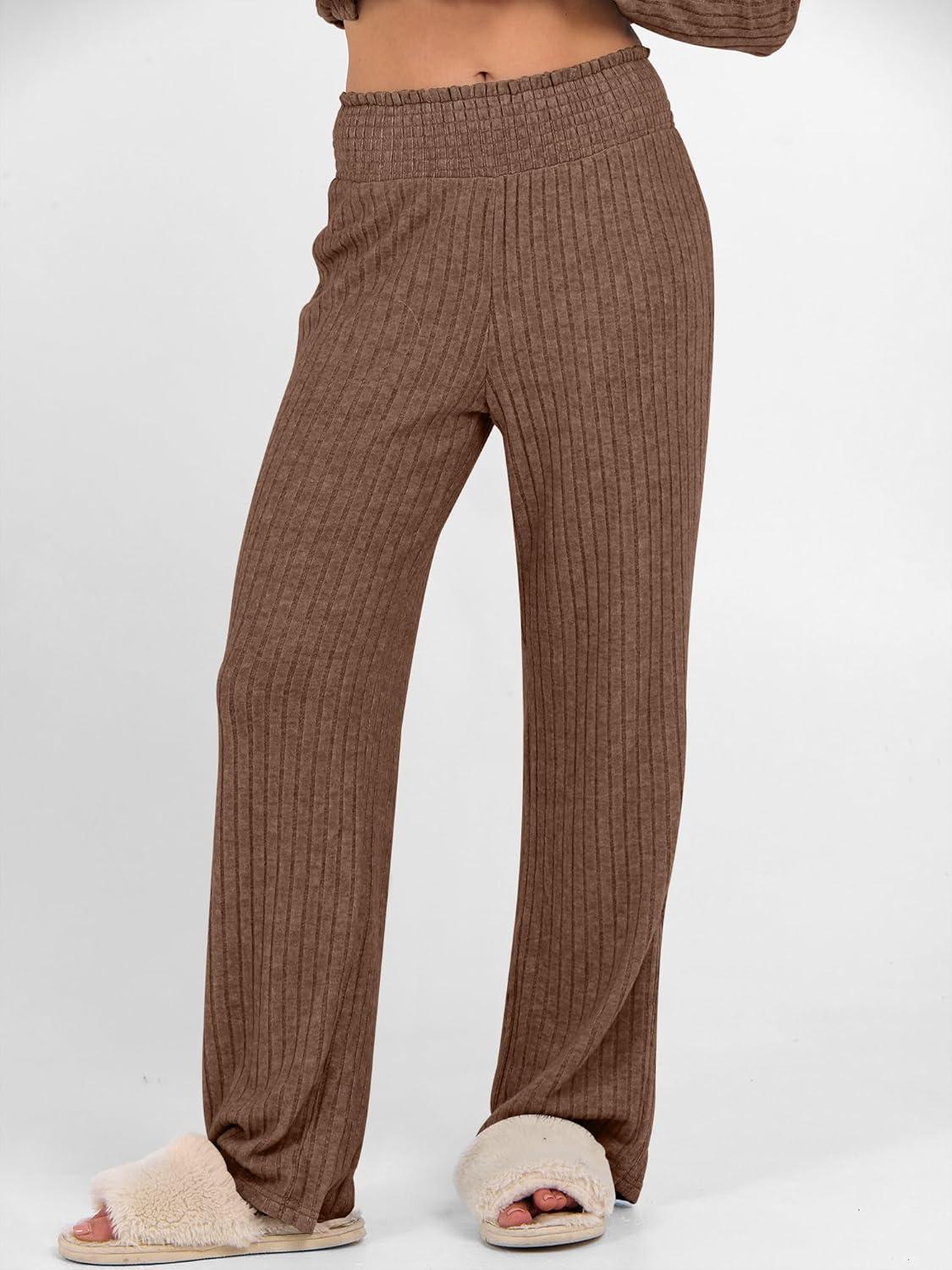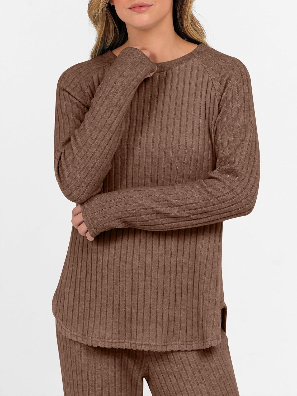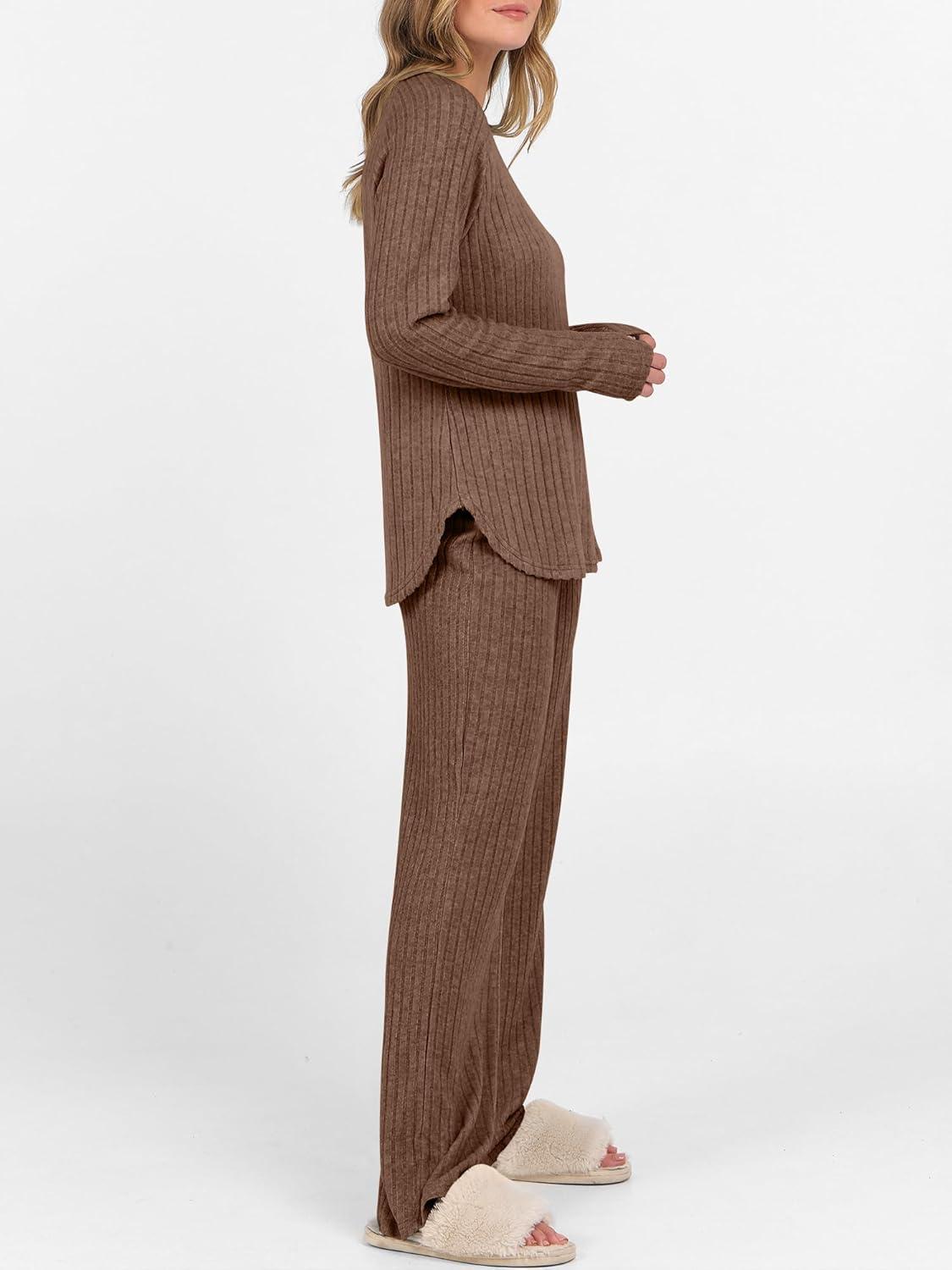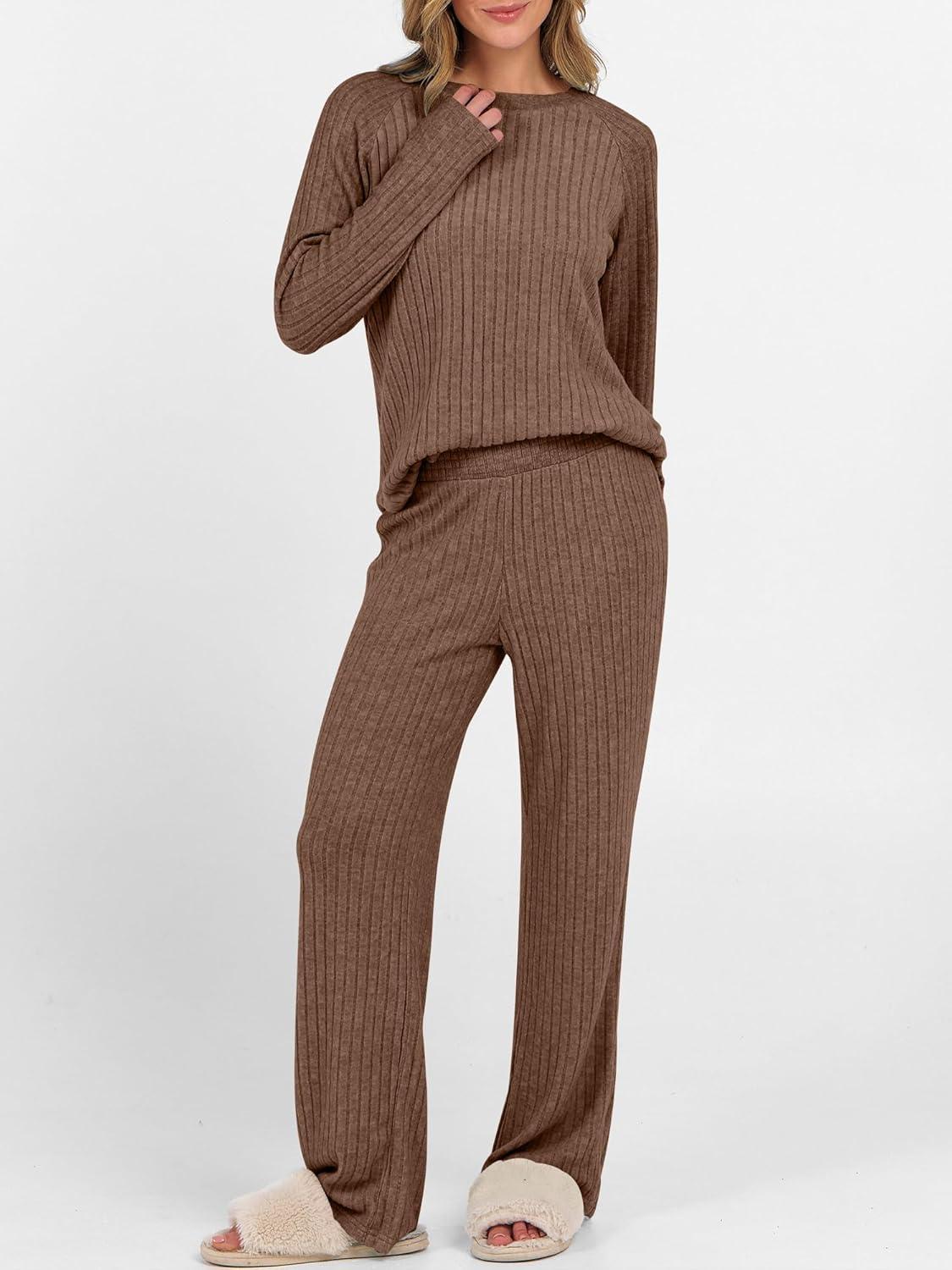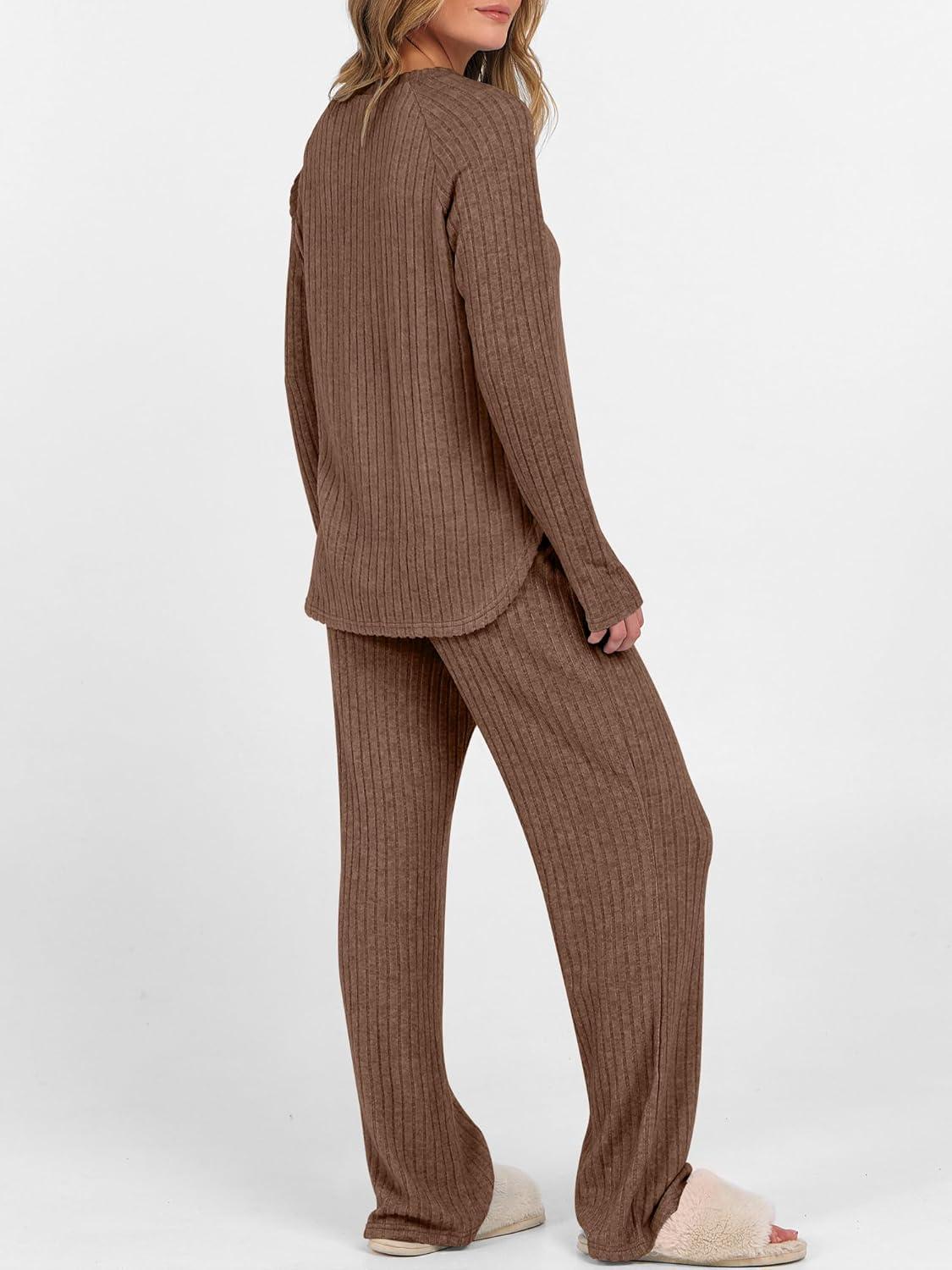 ANRABESS Womens 2 Piece Lounge Pajama Sets Ribbed Knit Long Sleeve Tunic Tops Matching Pants Casual Fall Sleepwear Outfits(Brown)