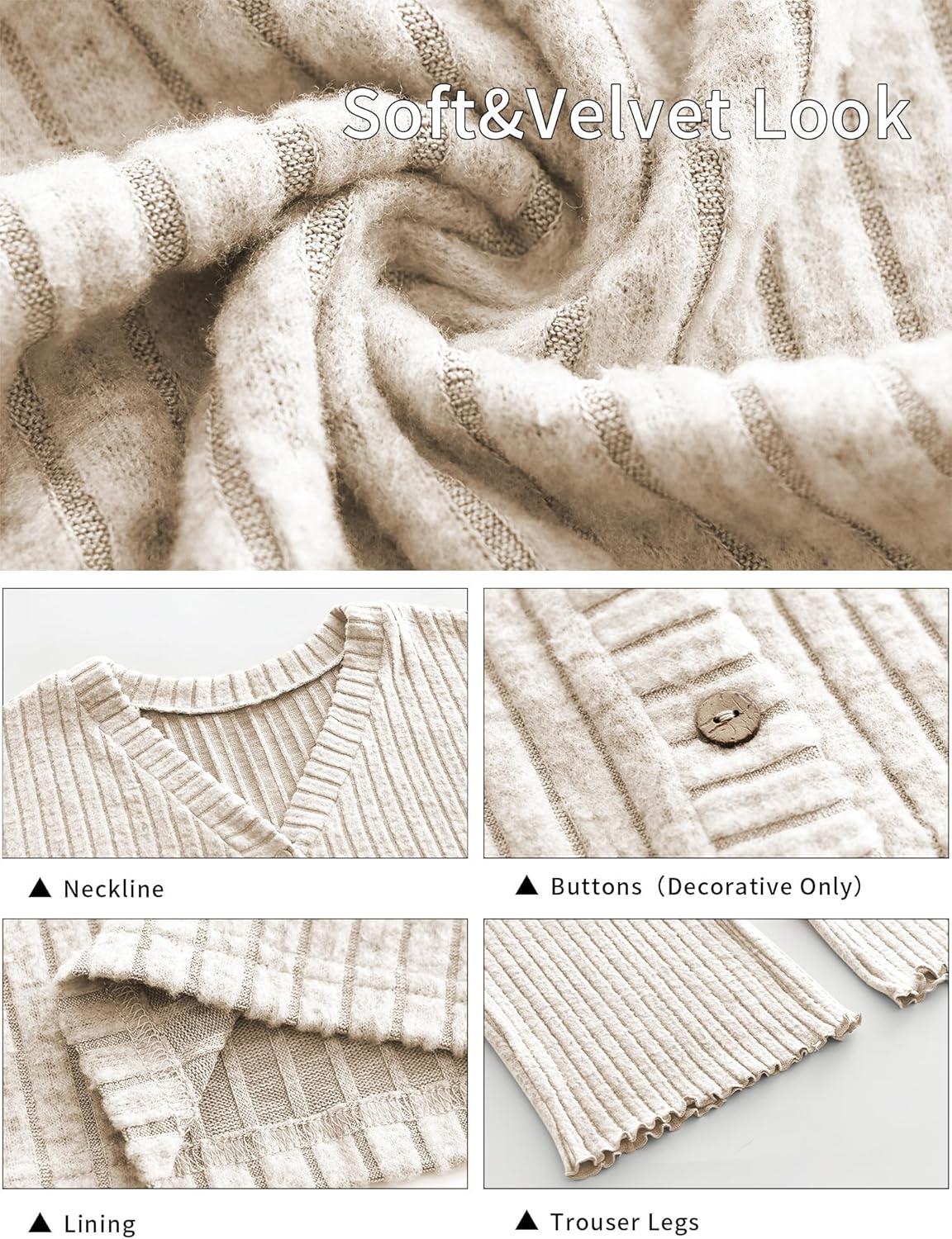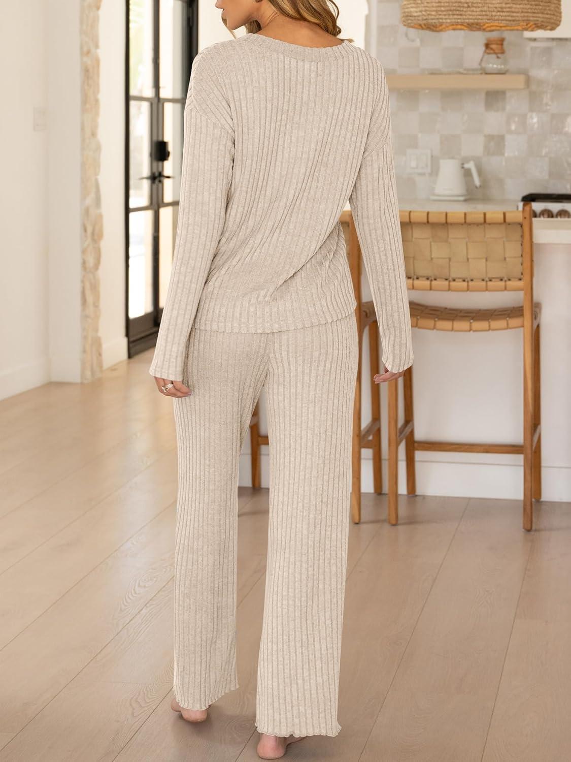 ANRABESS Women’s 2 Piece Lounge Pajama Sets Ribbed Long Sleeve Button Top Matching Pants Sleepwear PJ Set 2025 Fall Outfits(Light Khaki)