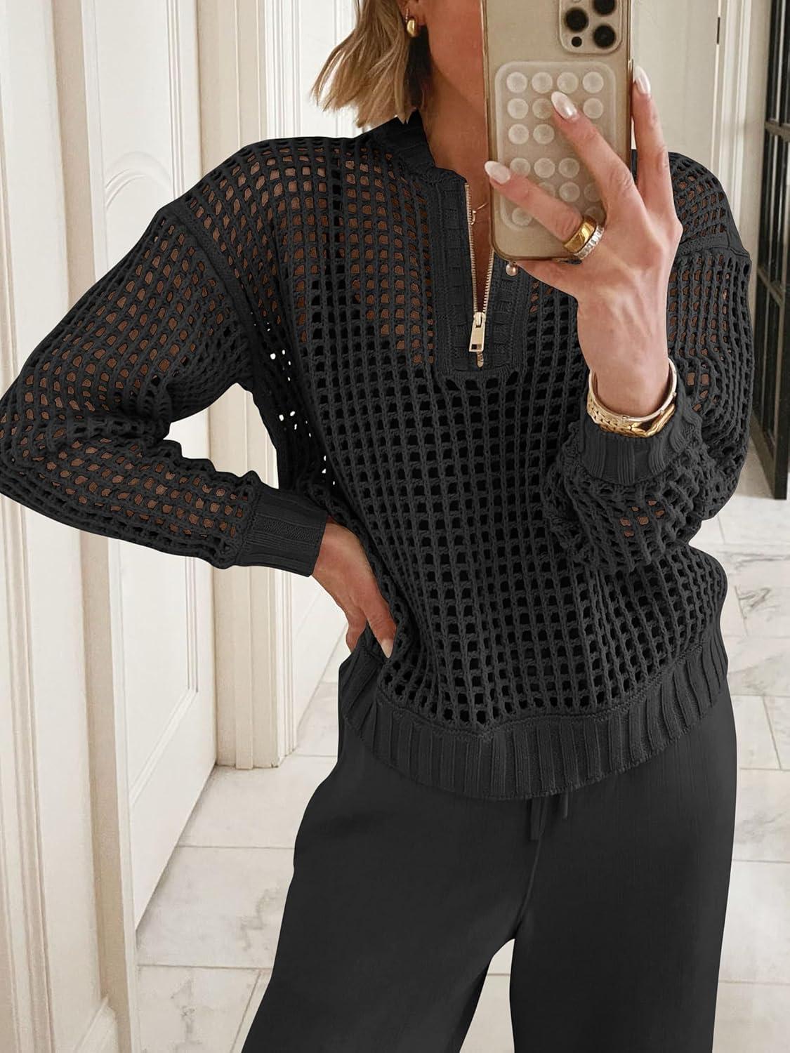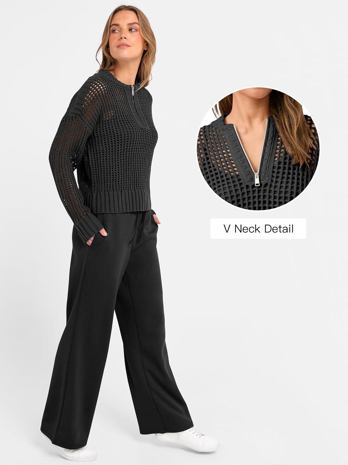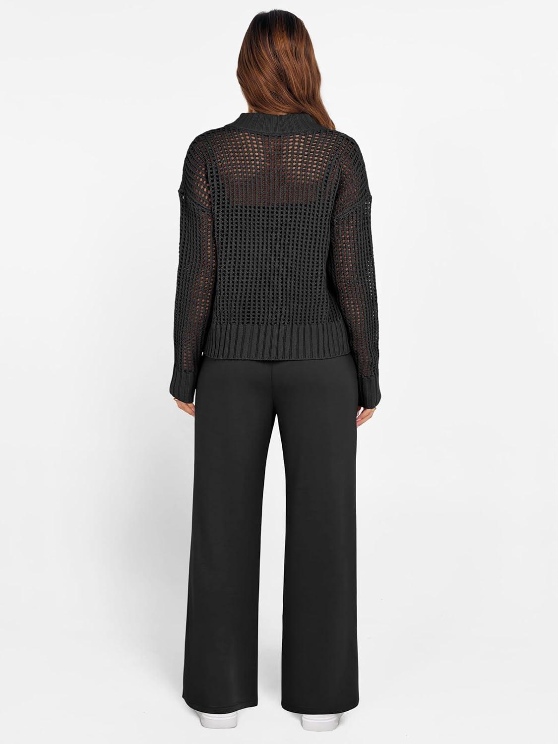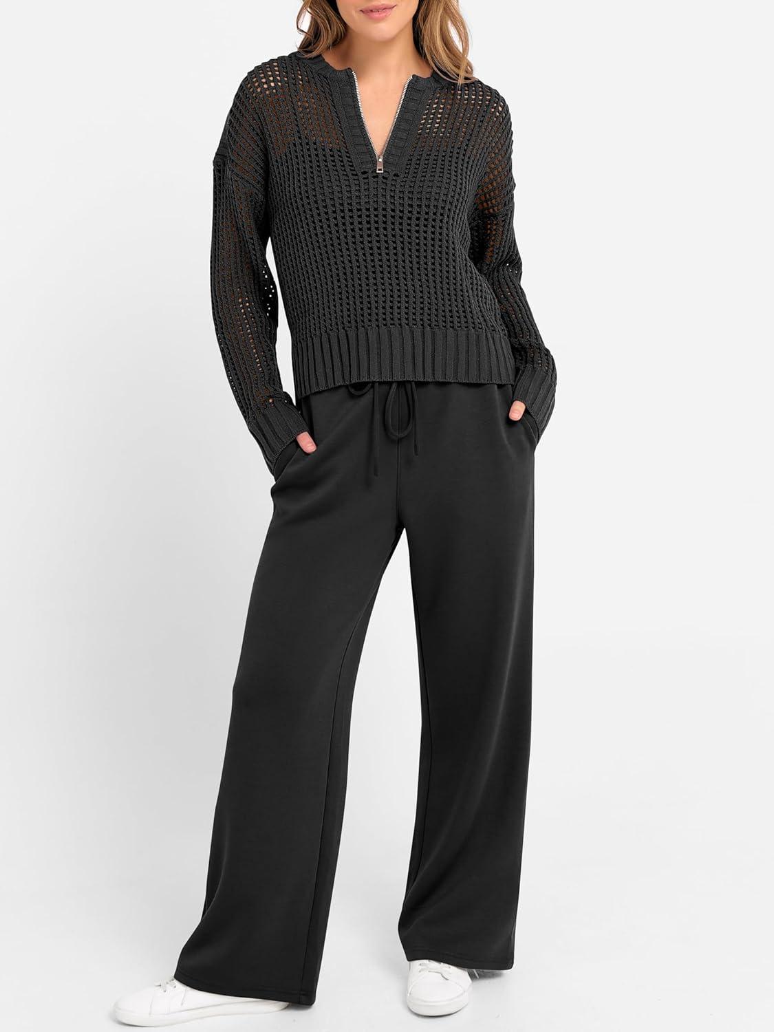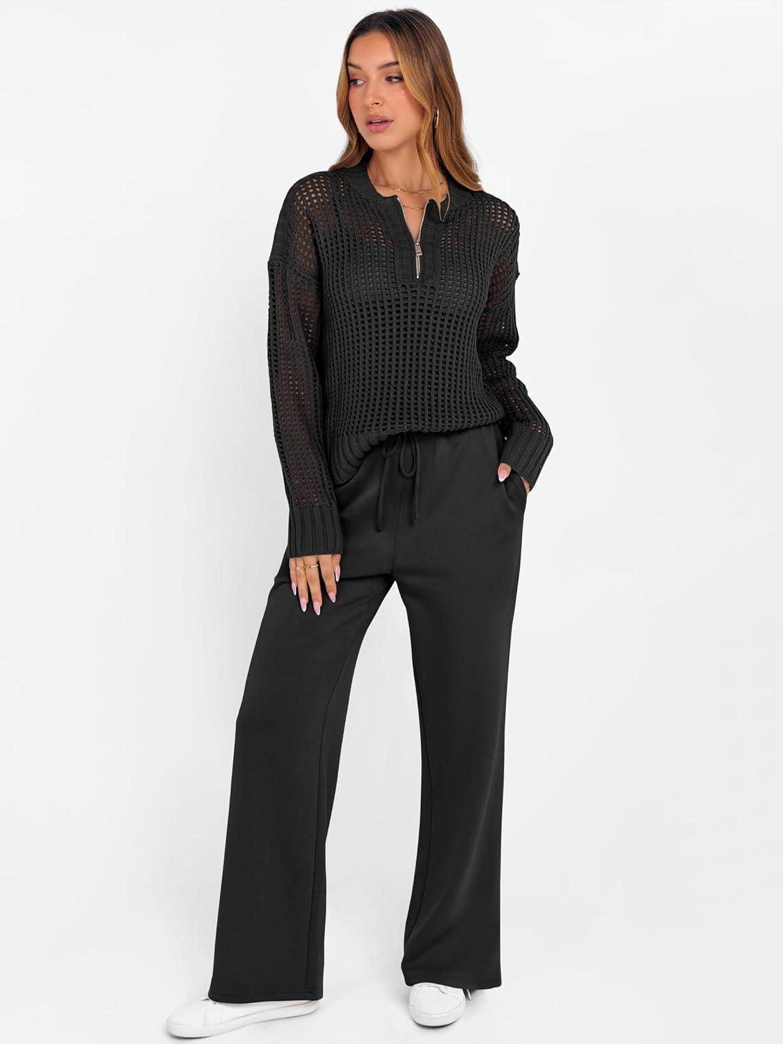 ANRABESS Womens 2 Piece Outfits 2025 Fall Crochet Knit Half Zip Sweater Top Wide Leg Pant Travel Matching Sets Lounge Clothes(Black)