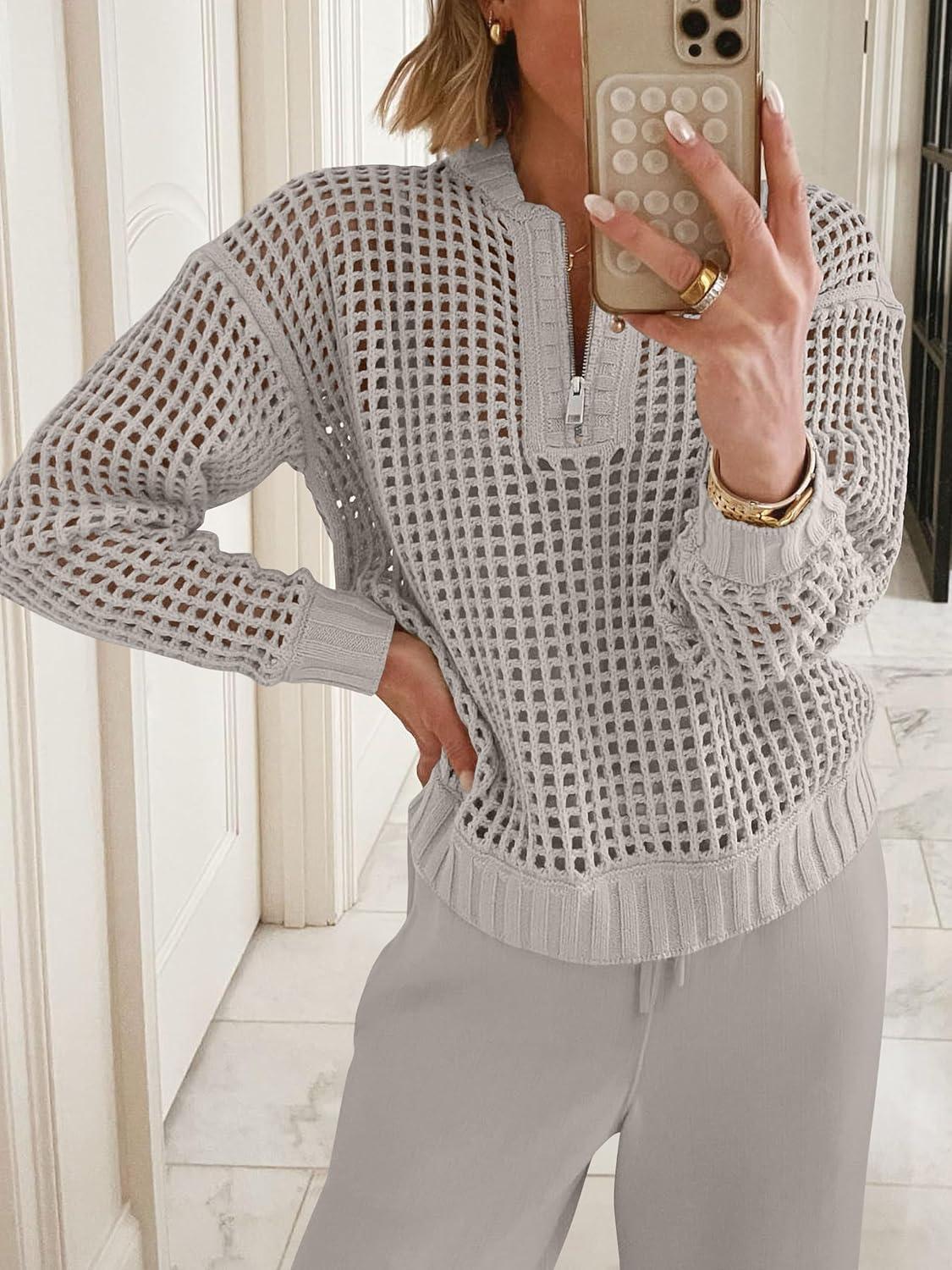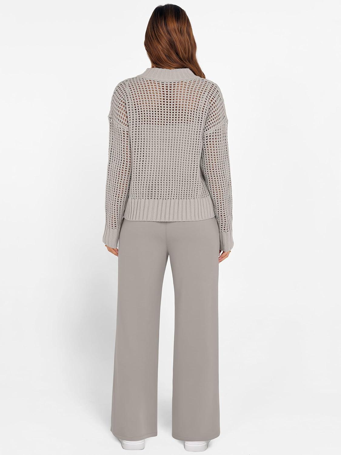 imageANRABESS Womens 2 Piece Outfits 2025 Fall Crochet Knit Half Zip Sweater Top Wide Leg Pant Travel Matching Sets Lounge ClothesLight Khaki