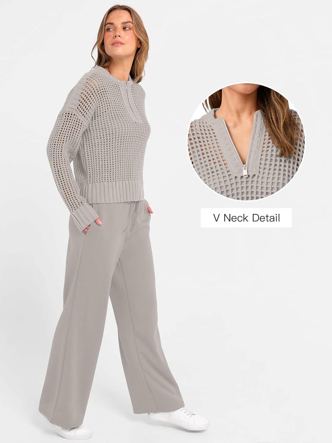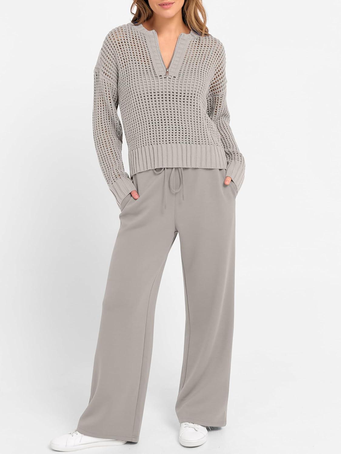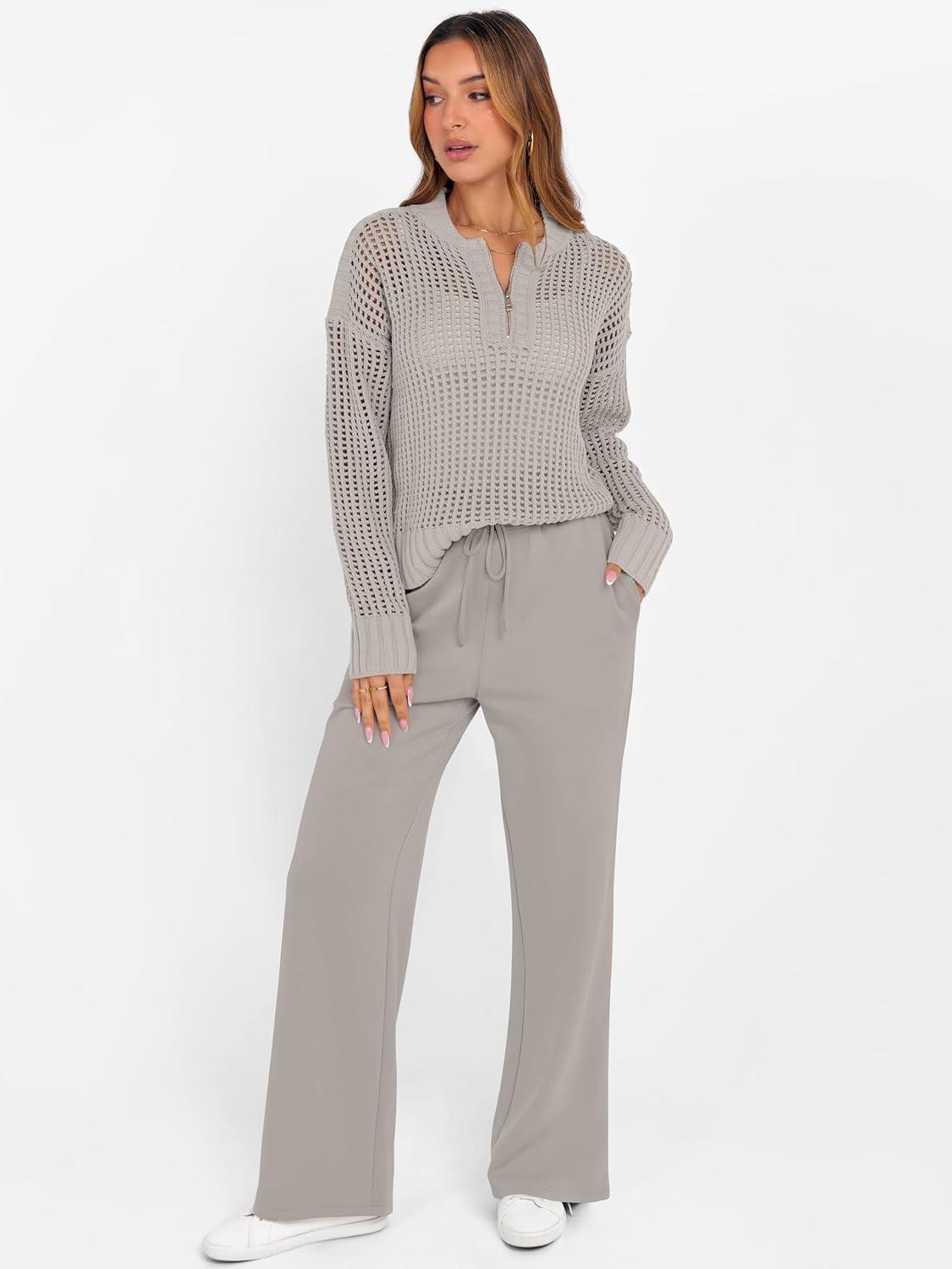 ANRABESS Womens 2 Piece Outfits 2025 Fall Crochet Knit Half Zip Sweater Top Wide Leg Pant Travel Matching Sets Lounge Clothes(Light Khaki)