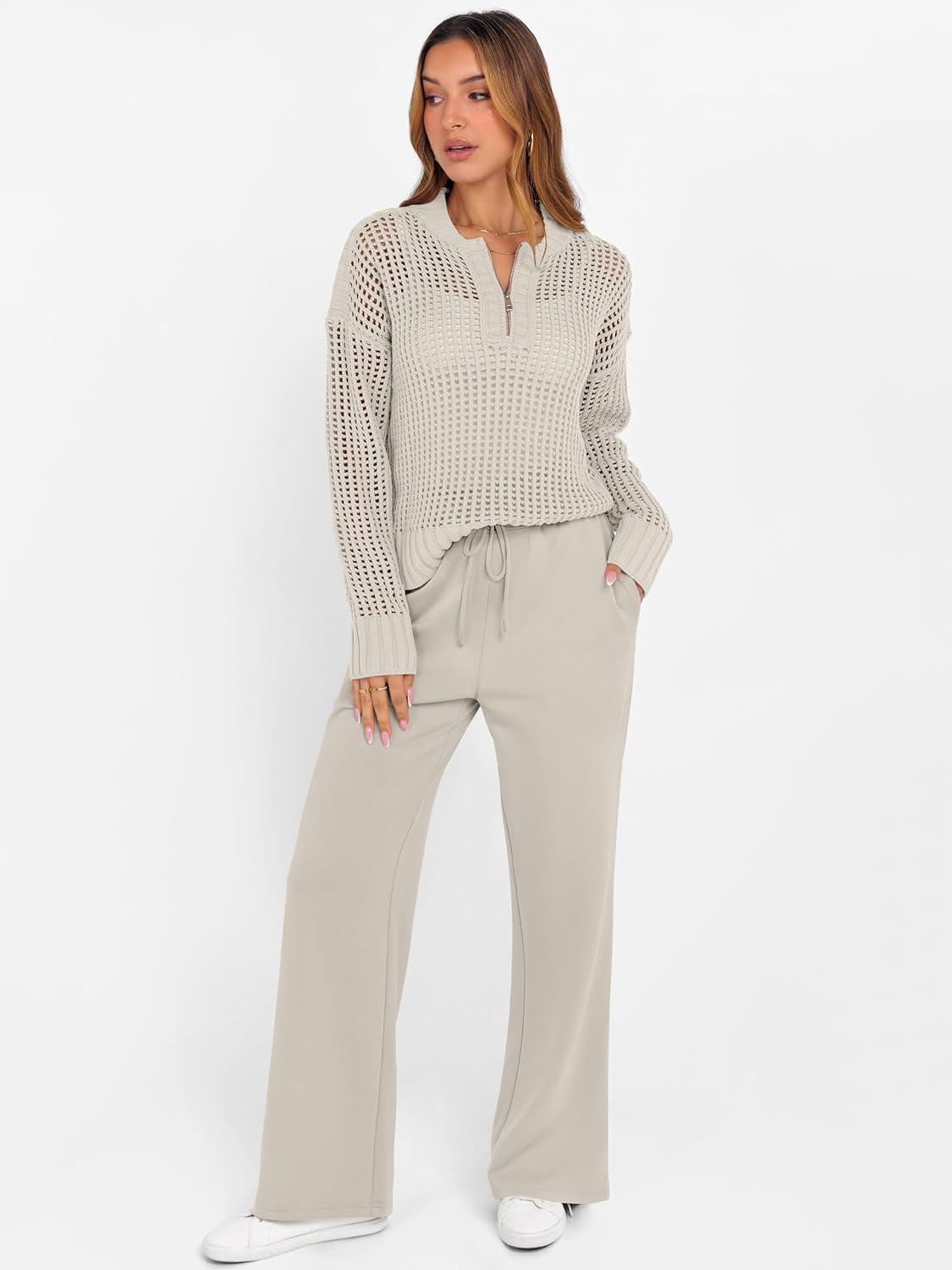 ANRABESS Womens 2 Piece Outfits 2025 Fall Crochet Knit Half Zip Sweater Top Wide Leg Pant Travel Matching Sets Lounge Clothes(Light Khaki)