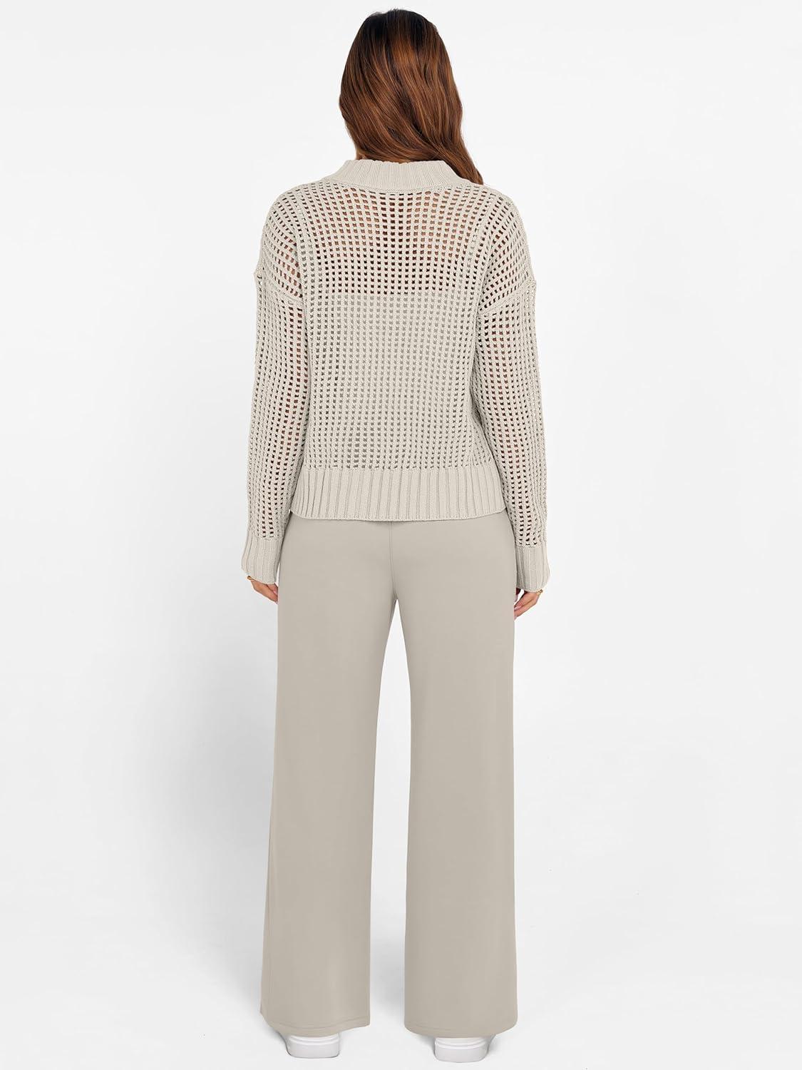 imageANRABESS Womens 2 Piece Outfits 2025 Fall Crochet Knit Half Zip Sweater Top Wide Leg Pant Travel Matching Sets Lounge ClothesLight Khaki