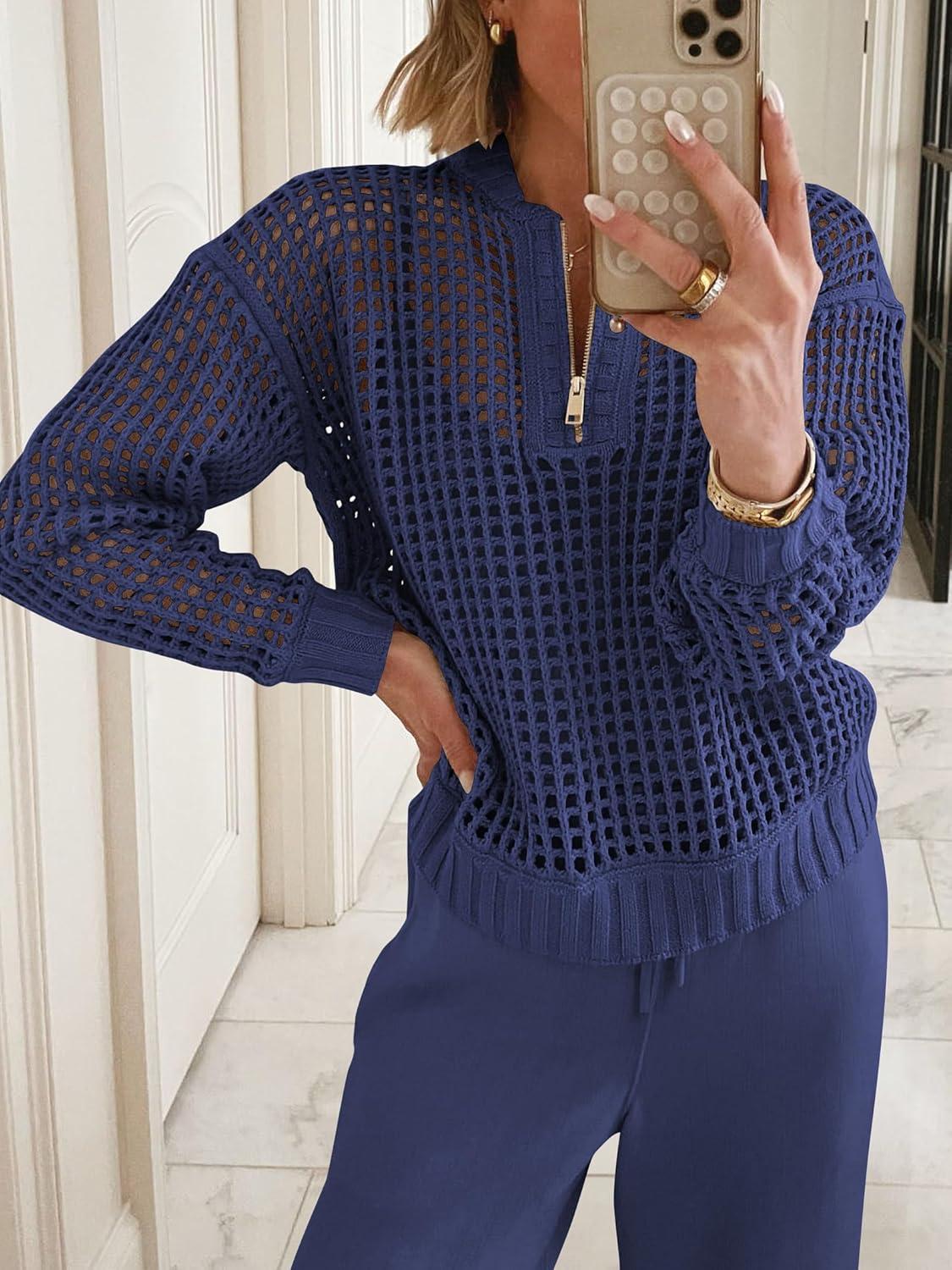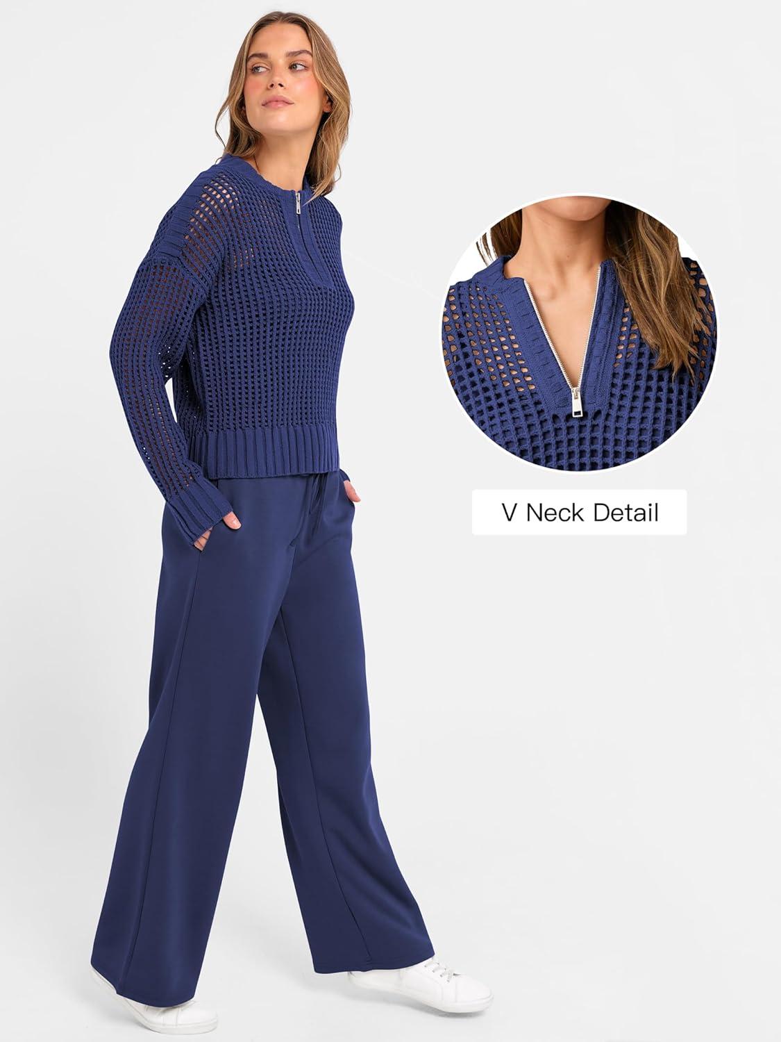 imageANRABESS Womens 2 Piece Outfits 2026 Fall Crochet Knit Half Zip Sweater Top Wide Leg Pant Travel Matching Sets Lounge ClothesNavy Blue