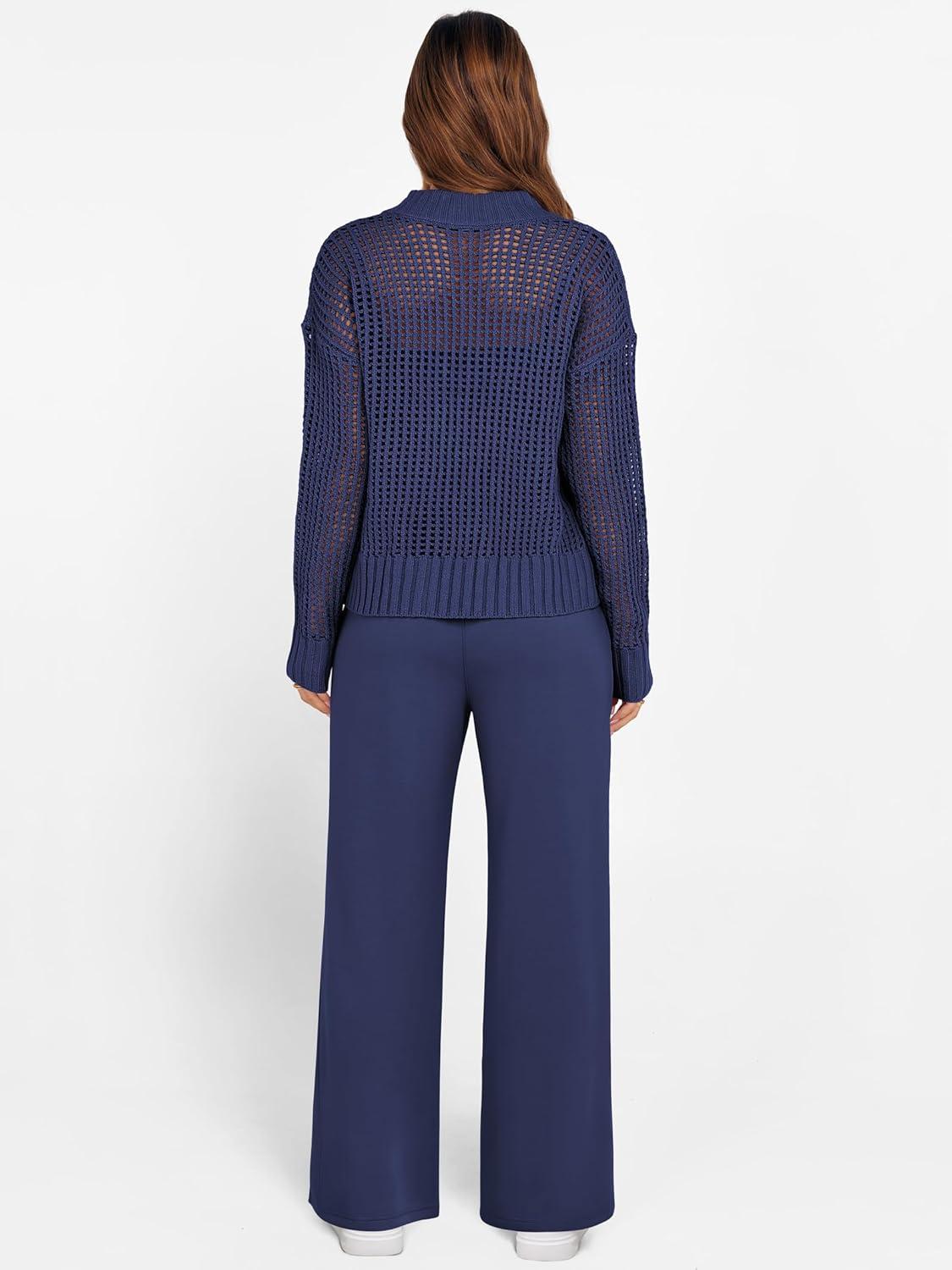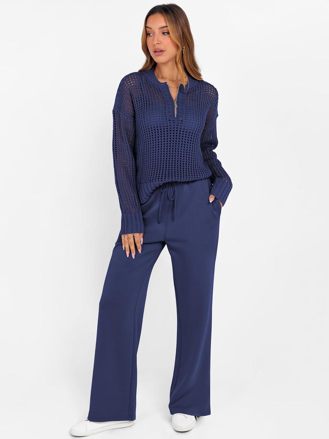 ANRABESS Womens 2 Piece Outfits 2026 Fall Crochet Knit Half Zip Sweater Top Wide Leg Pant Travel Matching Sets Lounge Clothes(Navy Blue)