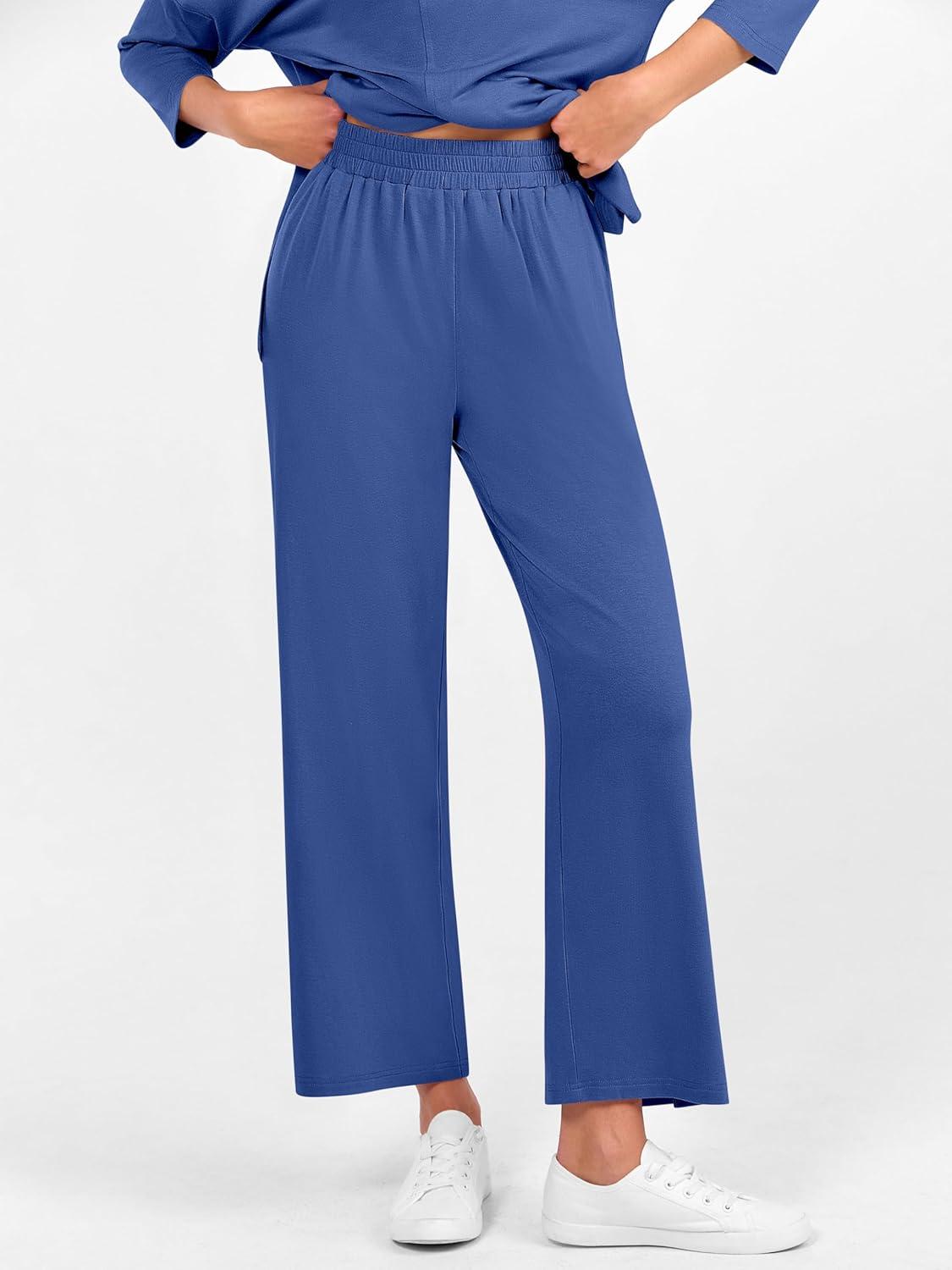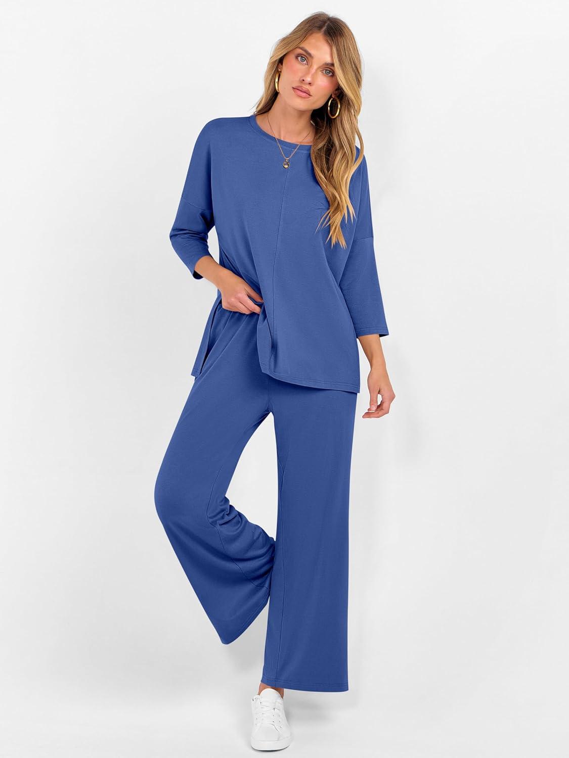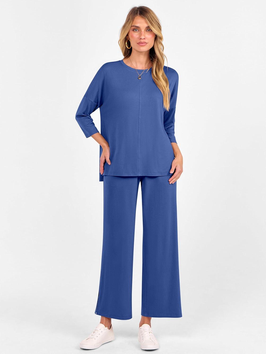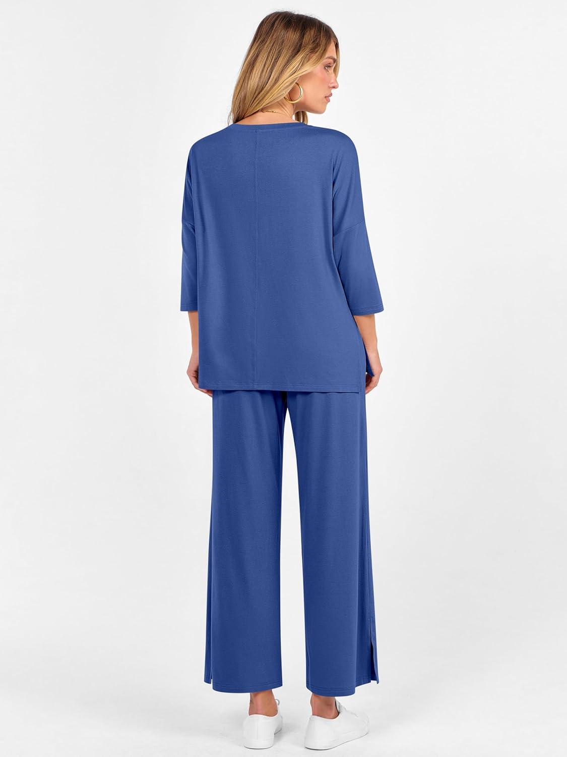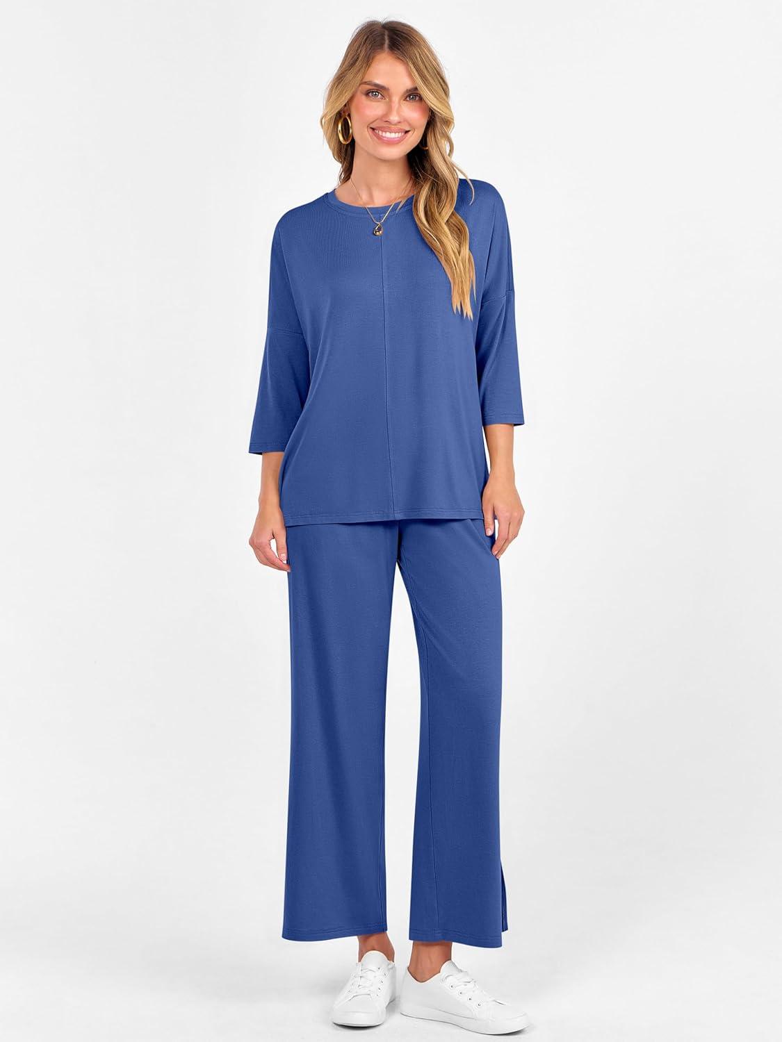 ANRABESS Women's 2 Piece Outfits 3/4 Sleeve Loose Tops Wide leg Pants Lounge Pajama Set Casual Travel Loungewear Clothes(Blue)