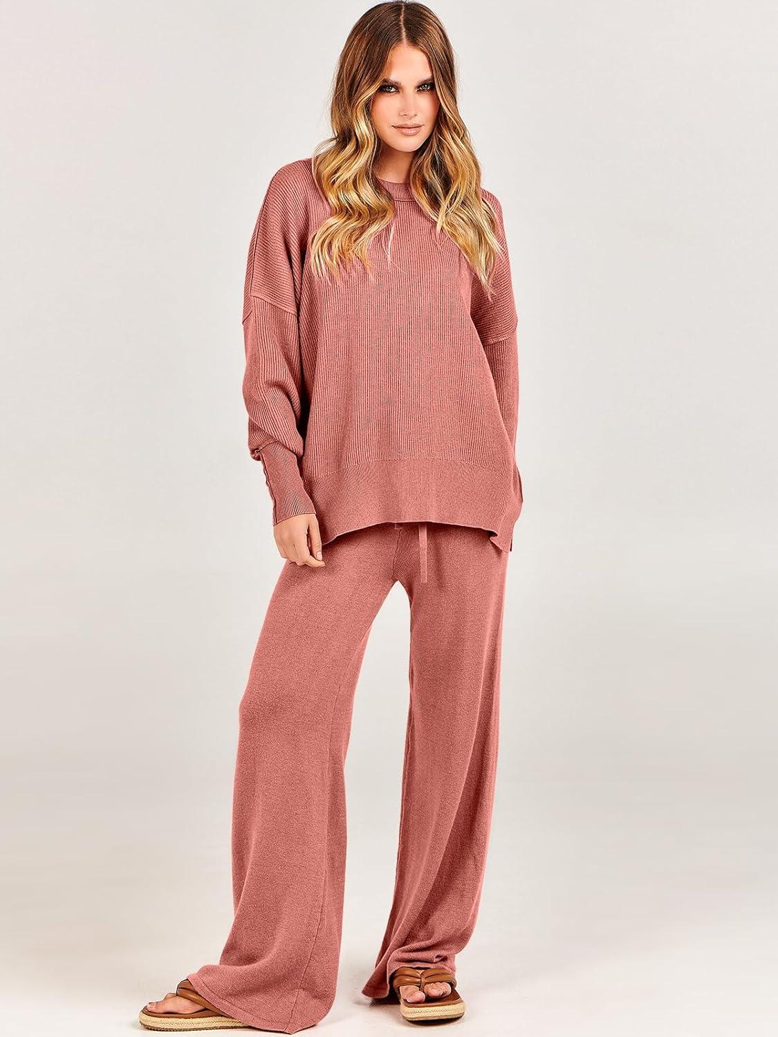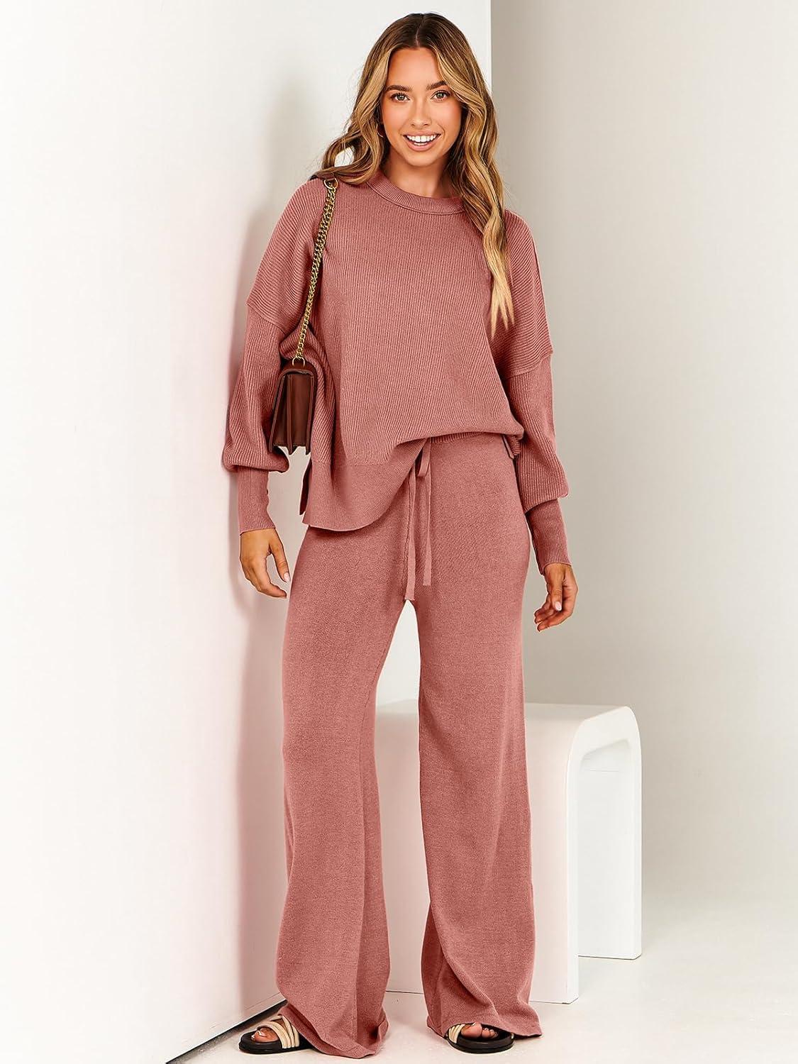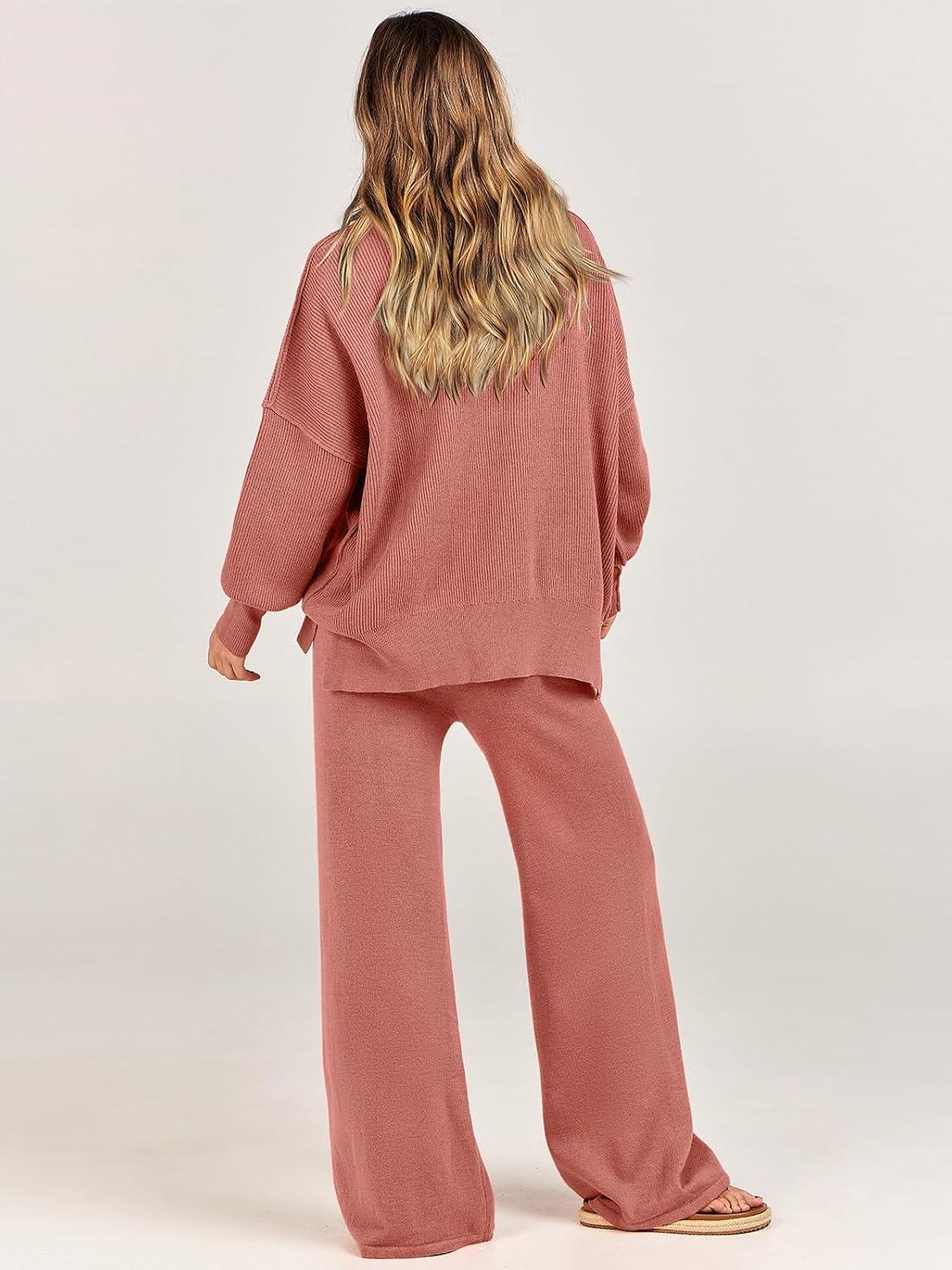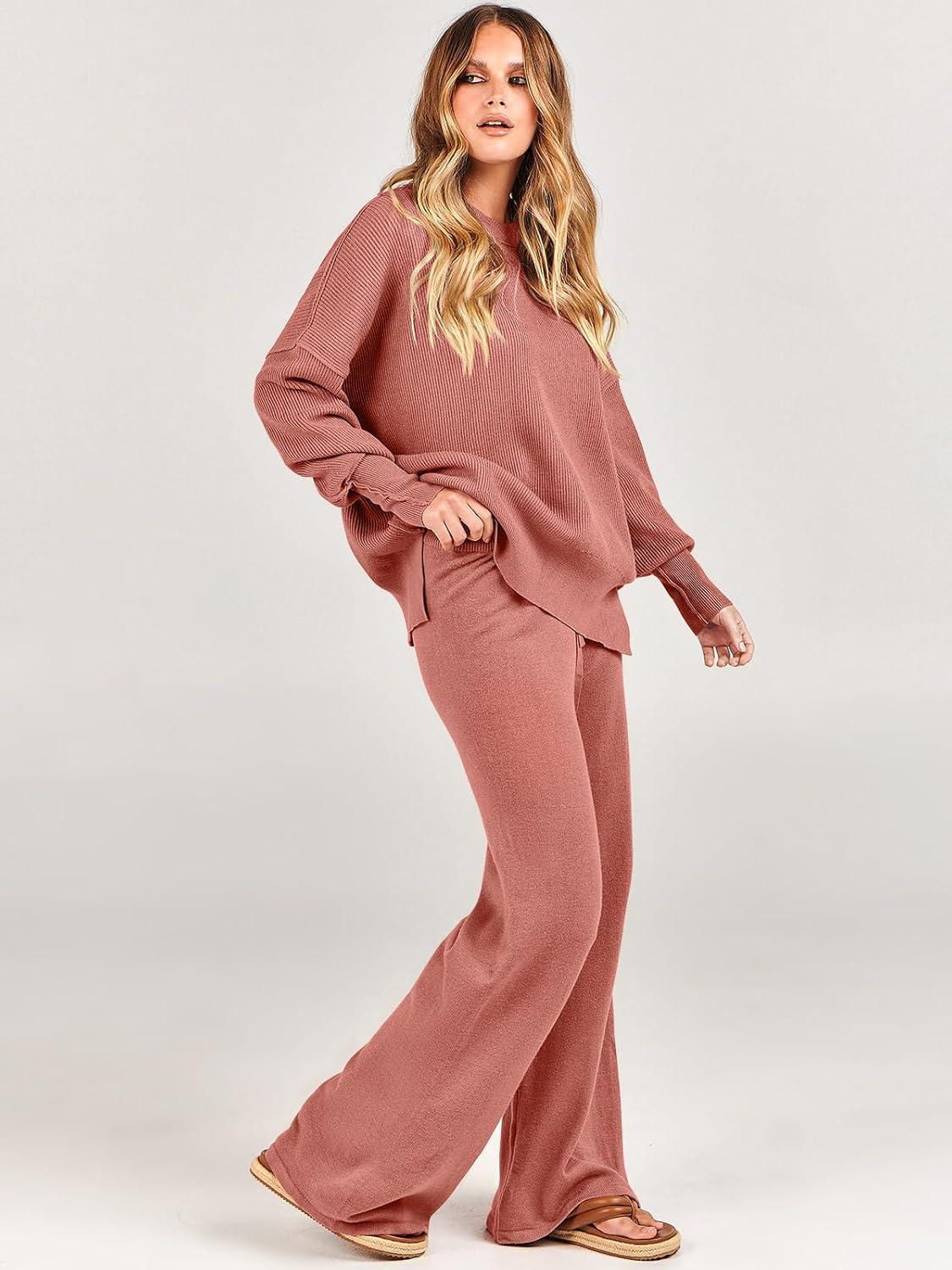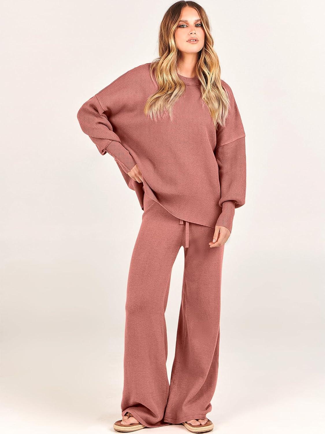 ANRABESS Womens 2 Piece Outfits Fall Lounge Set 2025 Oversized Chunky Knit Sweater Top Wide Leg Pants Loungewear Clothes(Rust)