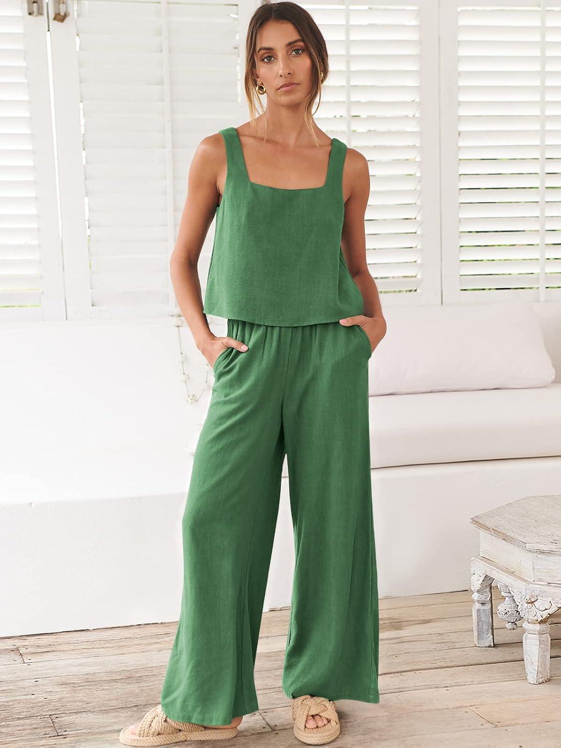 ANRABESS Women’s 2 Piece Outfits Linen Pants Jumpsuit Matching Lounge Set Casual Summer Beach Vacation Trendy Clothes(Grass)