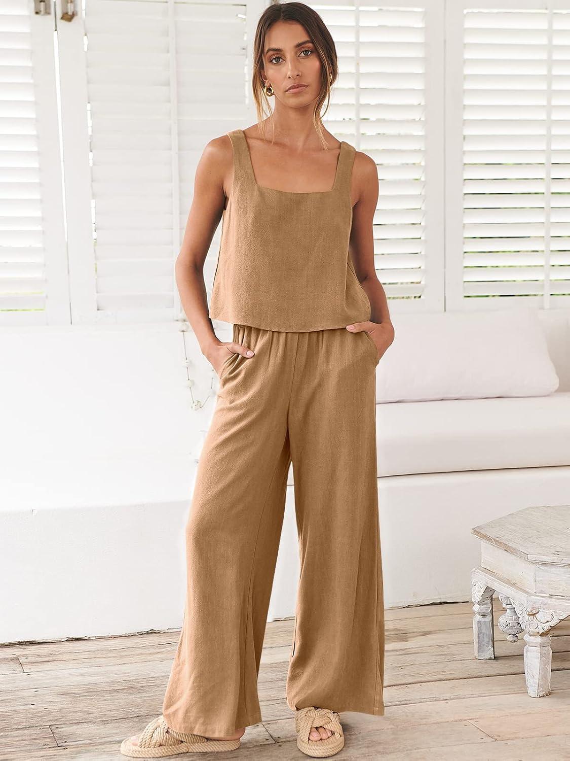 imageANRABESS Womens 2 Piece Outfits Linen Pants Jumpsuit Matching Lounge Set Casual Summer Beach Vacation Trendy ClothesLight Brown