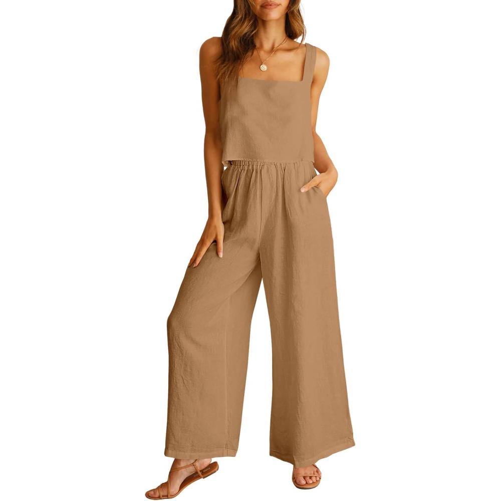 ANRABESS Women's 2 Piece Outfits Linen Pants Jumpsuit Matching Lounge Set Casual Summer Beach Vacation Trendy Clothes(Light Brown)