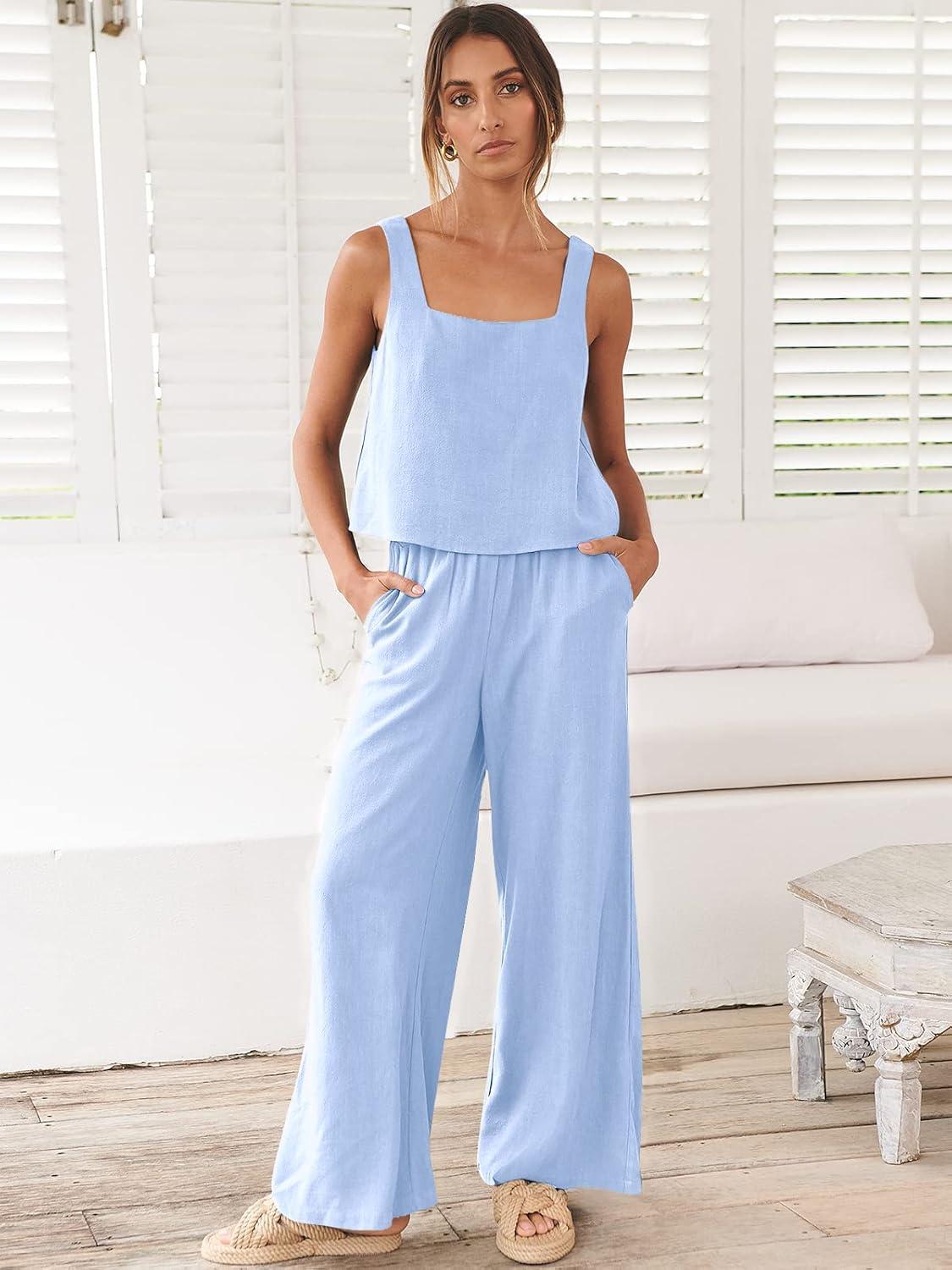 ANRABESS Women's 2 Piece Outfits Linen Pants Jumpsuit Matching Lounge Set Casual Summer Beach Vacation Trendy Clothes(Sky)