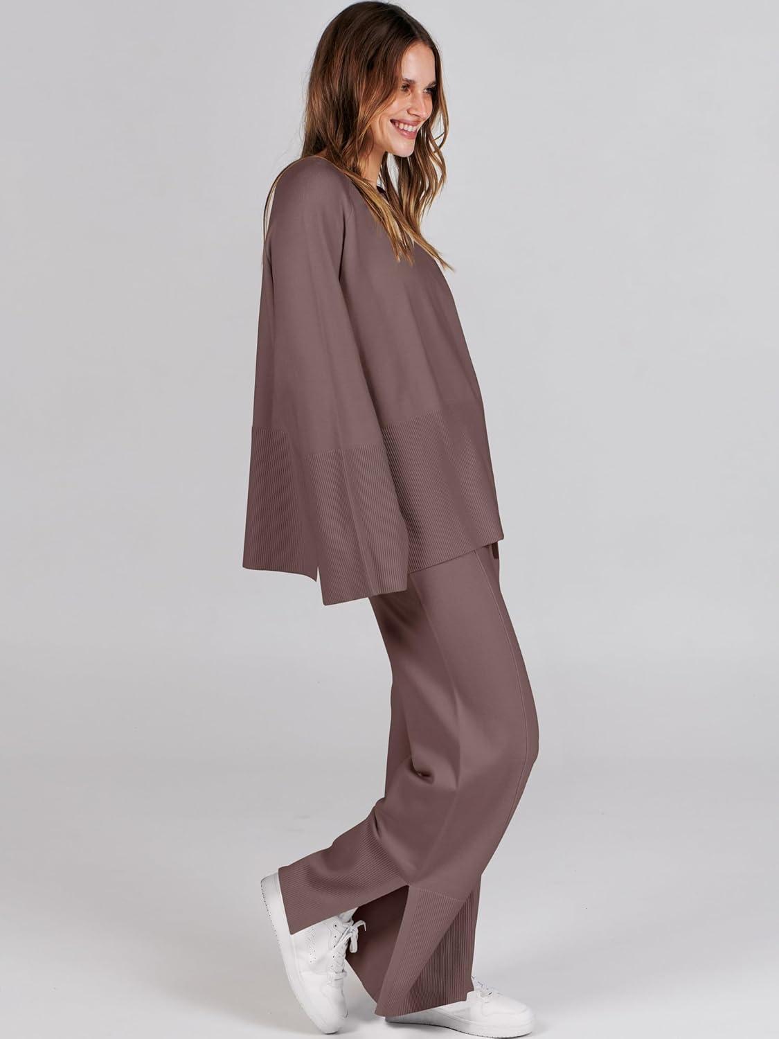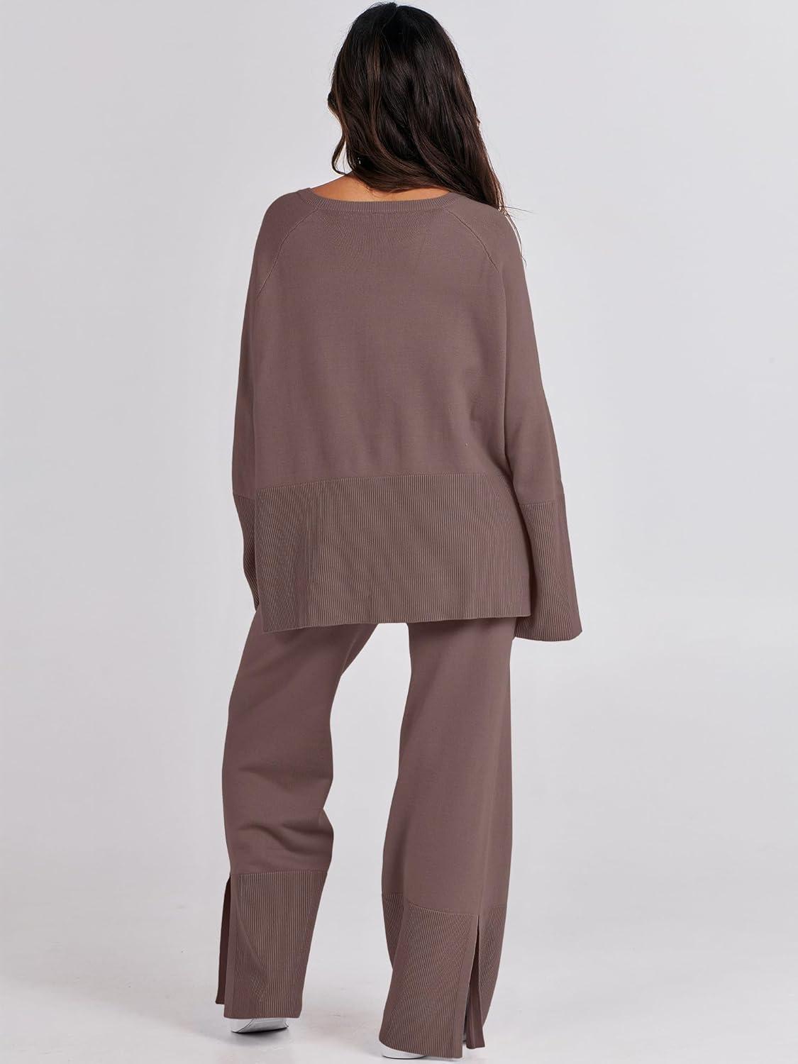 ANRABESS Womens 2 Piece Outfits Oversized Knit Sweater Set Wide Leg Pant Cozy Lounge Matching Pajama Sets 2025 Trendy Clothes(Coffee)