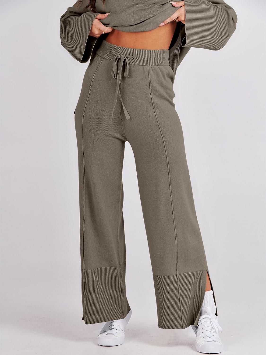 ANRABESS Womens 2 Piece Outfits Oversized Knit Sweater Set Wide Leg Pant Cozy Lounge Matching Pajama Sets 2025 Trendy Clothes(Khaki Green)
