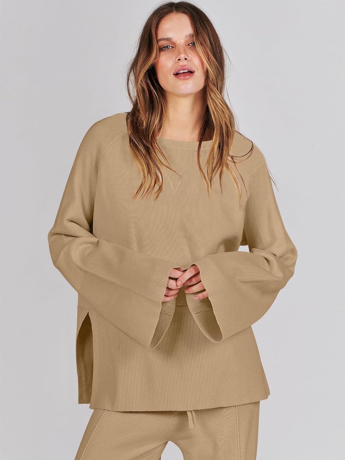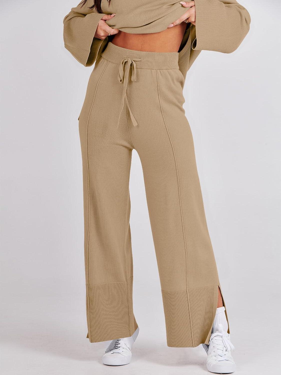 ANRABESS Womens 2 Piece Outfits Oversized Knit Sweater Set Wide Leg Pant Cozy Lounge Matching Pajama Sets 2025 Trendy Clothes(Khaki)