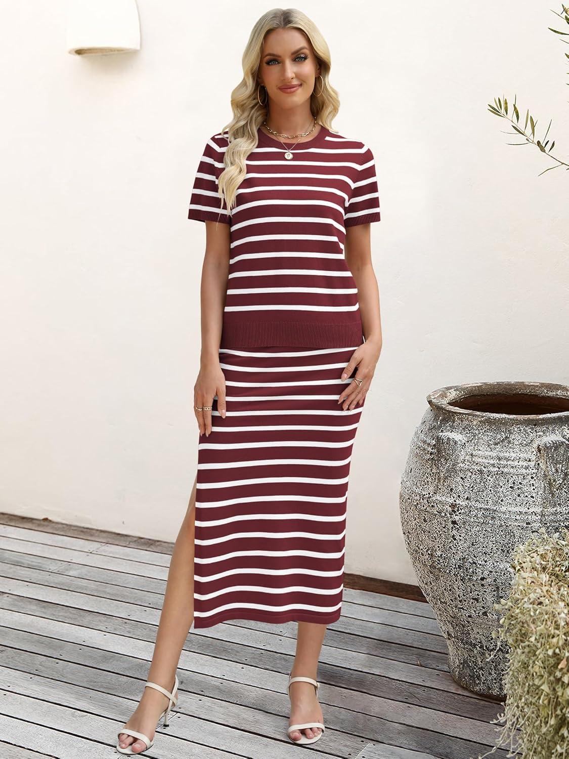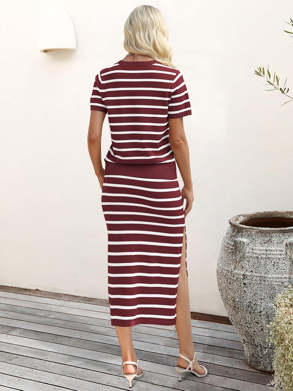 ANRABESS Womens 2 Piece Outfits Striped Sweater Skirt Sets 2026 Summer Casual Short Sleeve Pullover Tops Travel Midi Dress(Red White)
