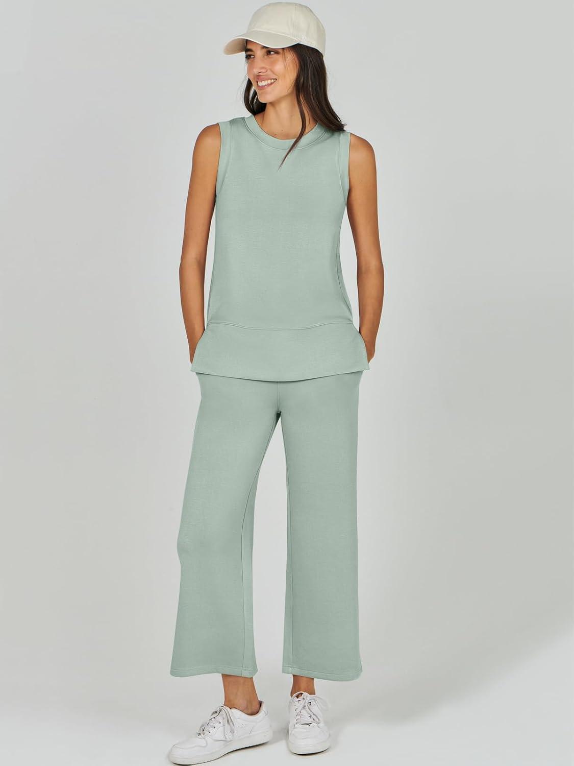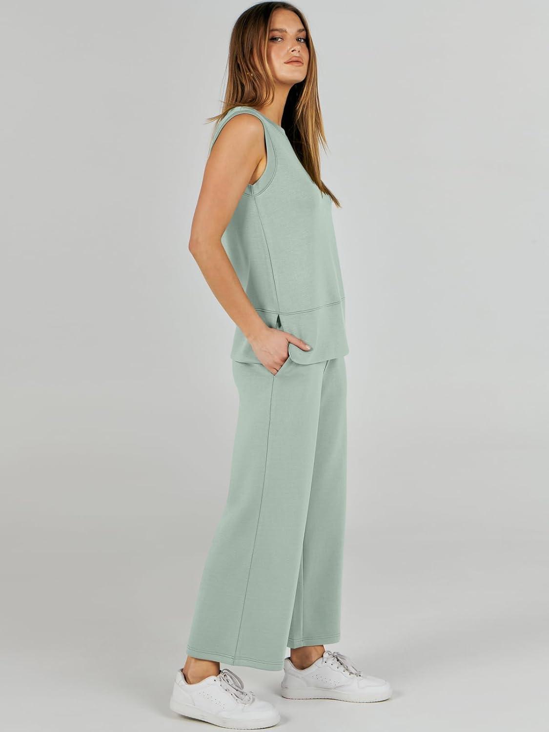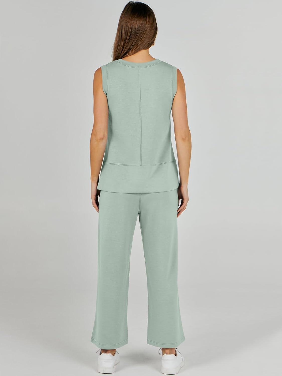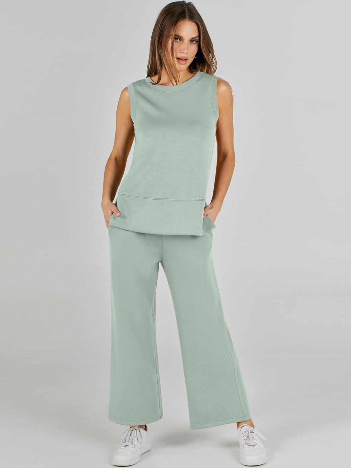 ANRABESS Womens 2 Piece Outfits Summer Beach Vacation Clothes Spring Travel Airport Casual Wide Leg Pants Lounge Sets(Mint)