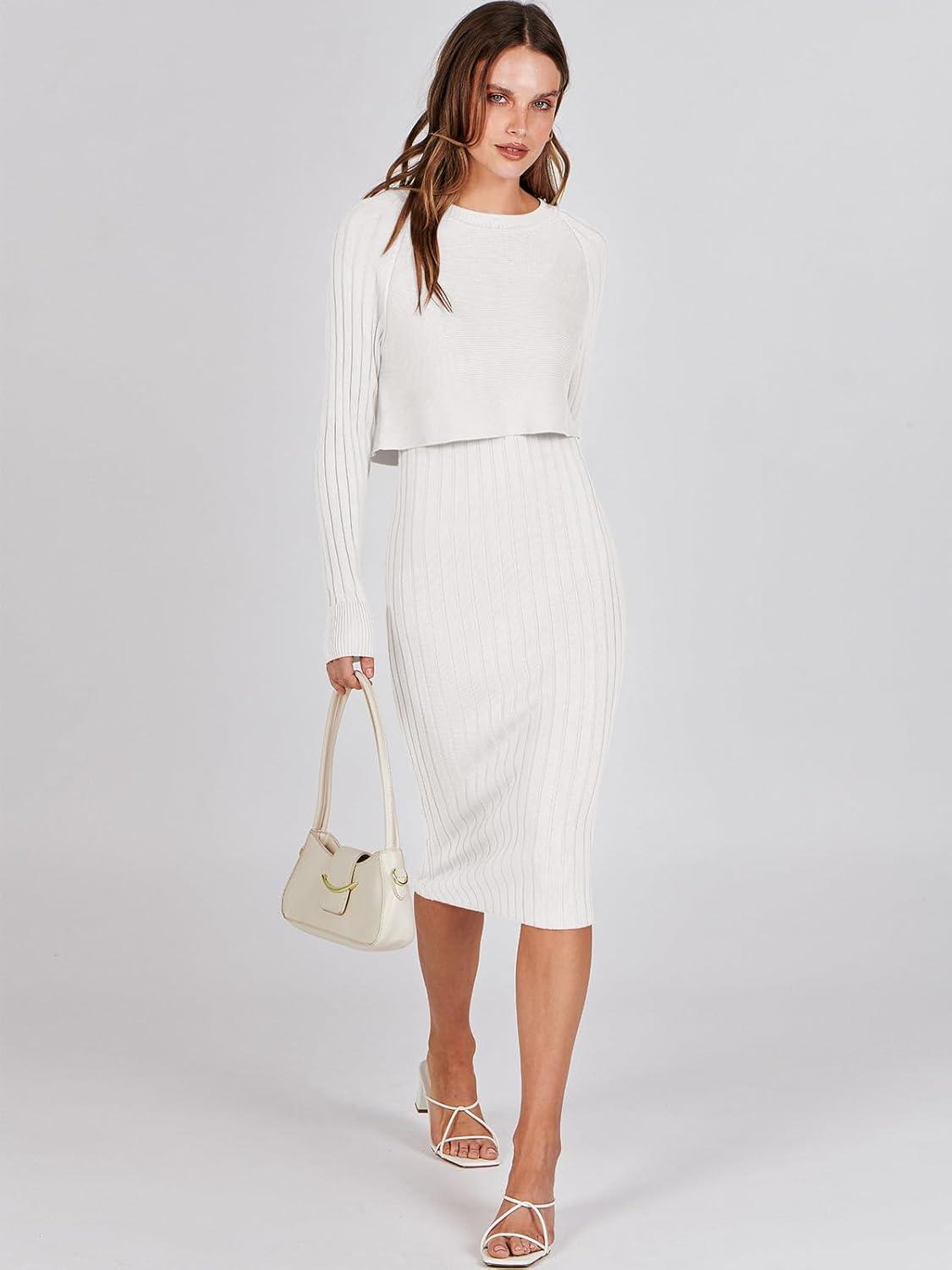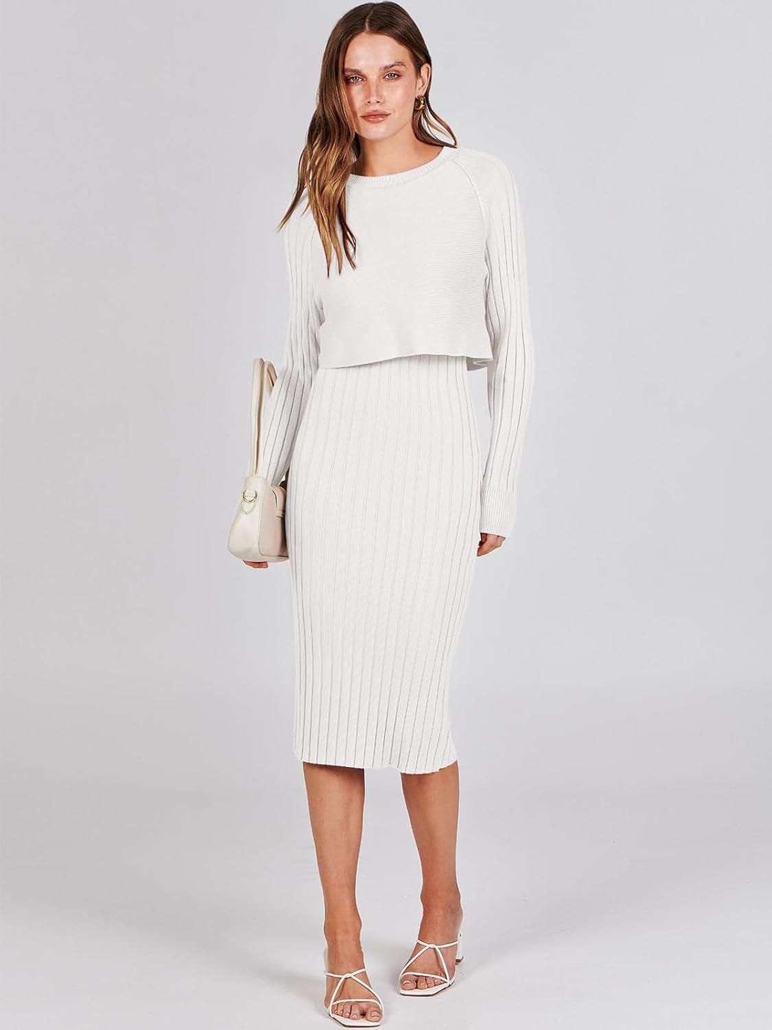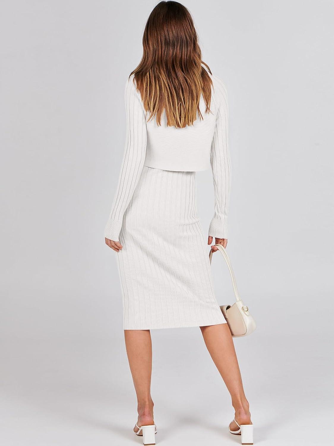 ANRABESS Womens 2 Piece Outfits Sweater Dresses Set Midi Skirt Sets Long Sleeve Crop Top Bodycon Ribbed Knit Dress 2025 Fall(White)