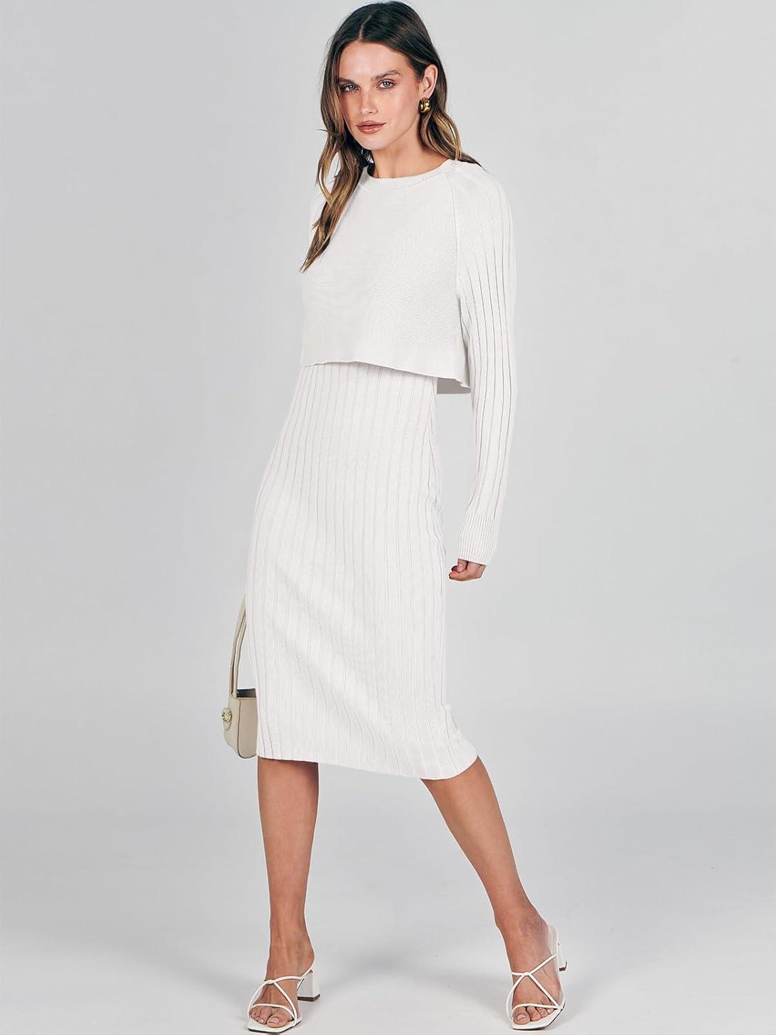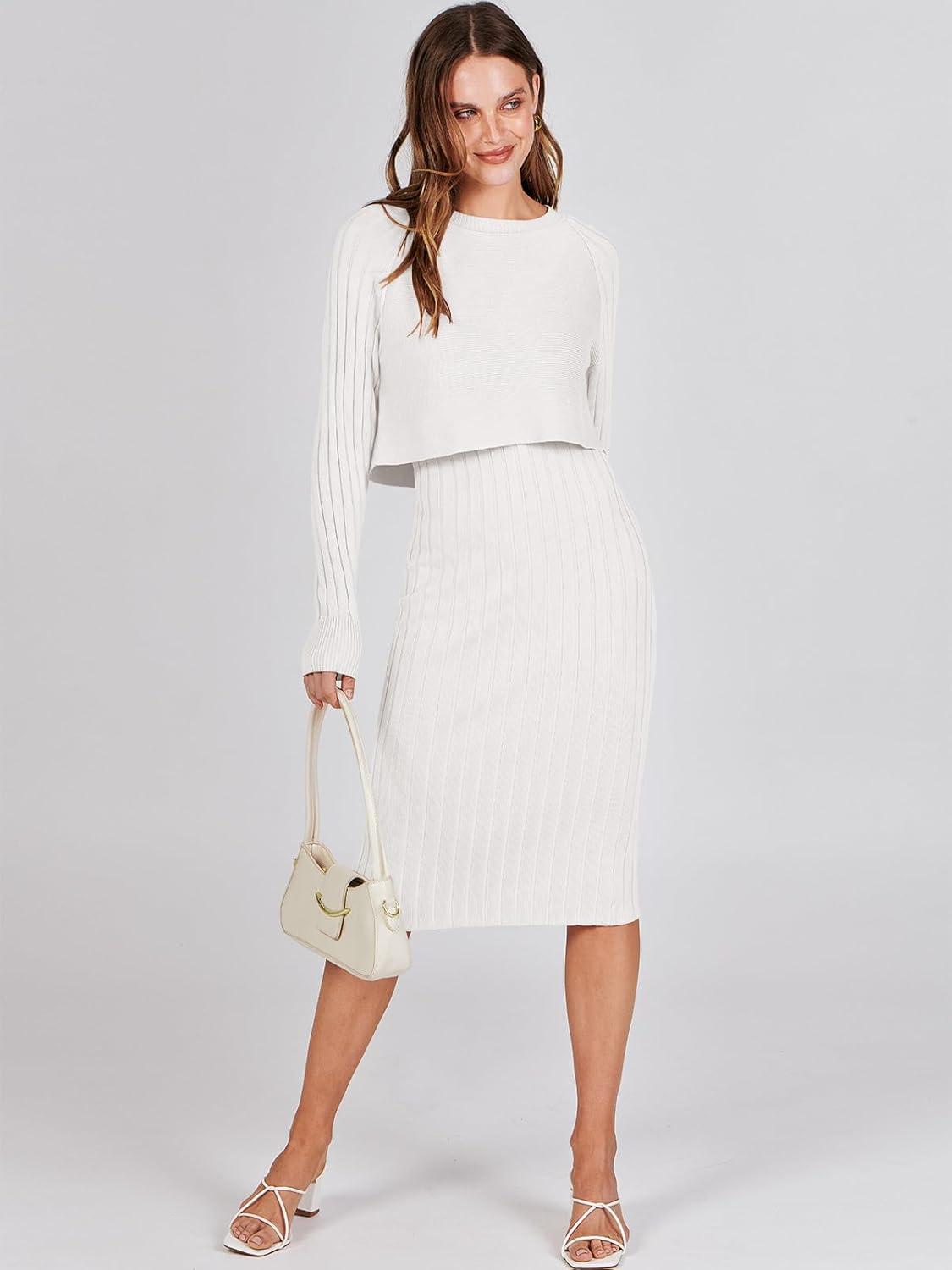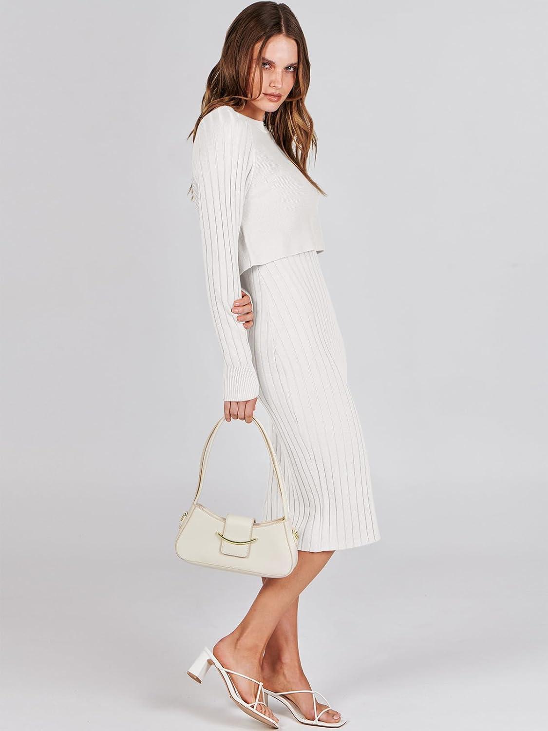 ANRABESS Womens 2 Piece Outfits Sweater Dresses Set Midi Skirt Sets Long Sleeve Crop Top Bodycon Ribbed Knit Dress 2025 Fall(White)